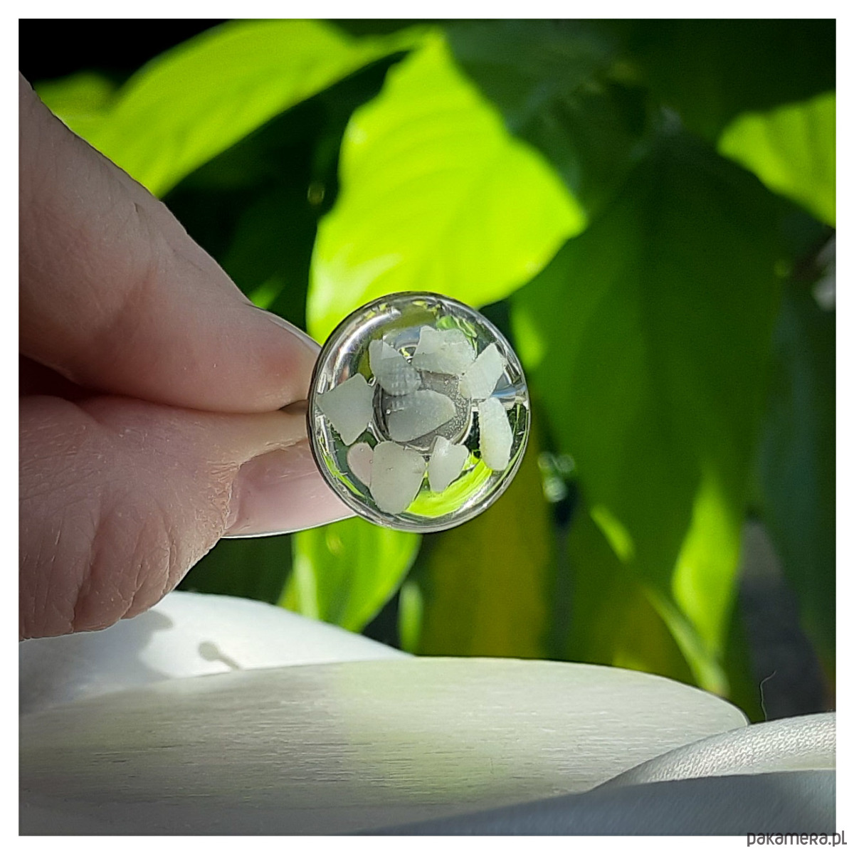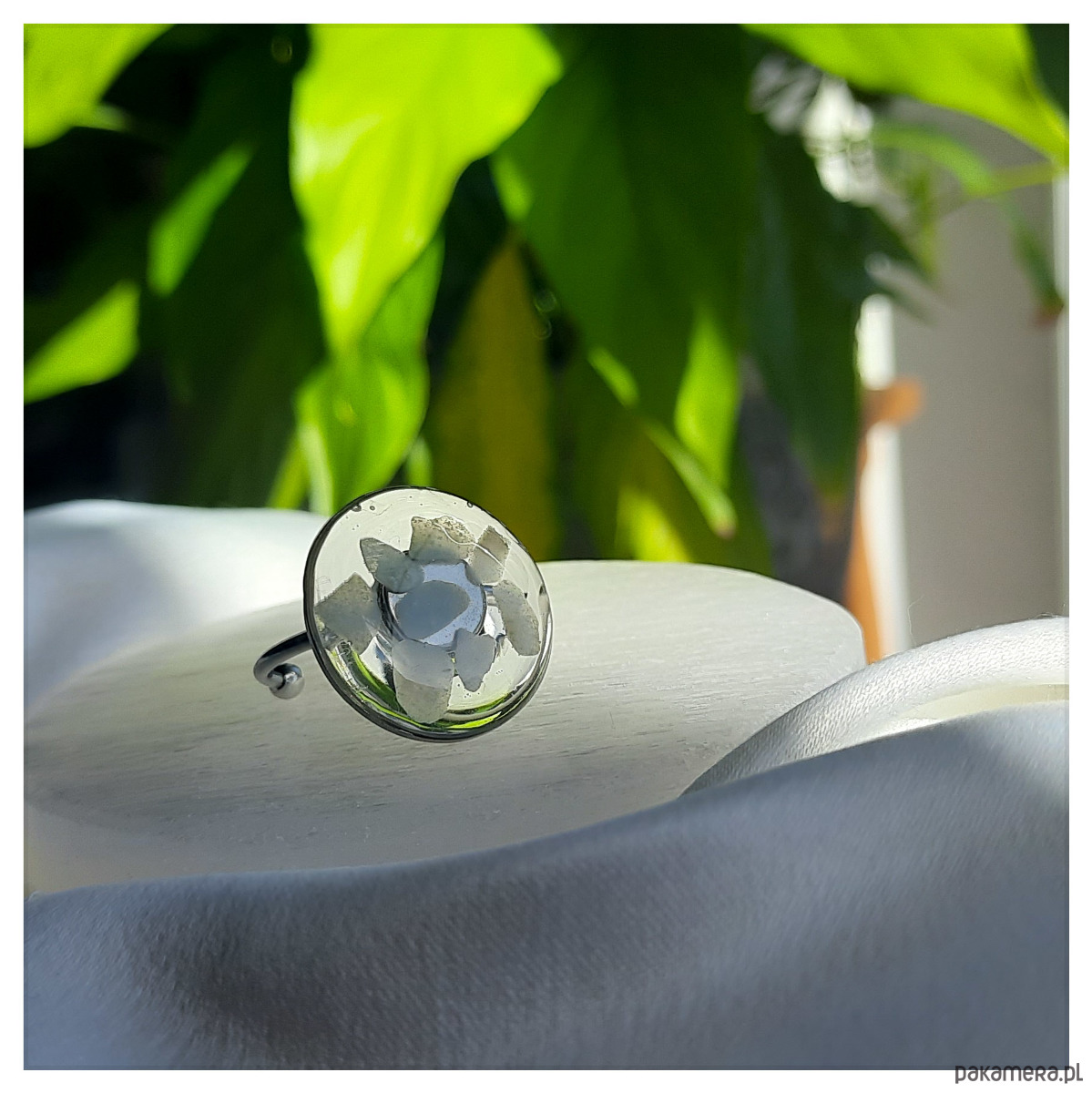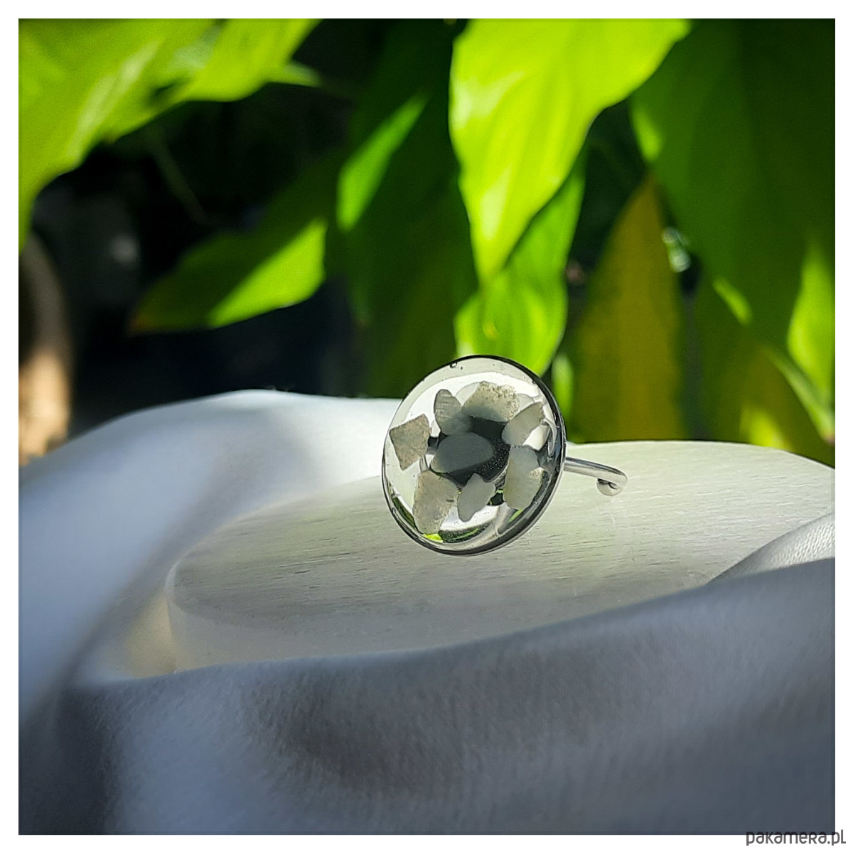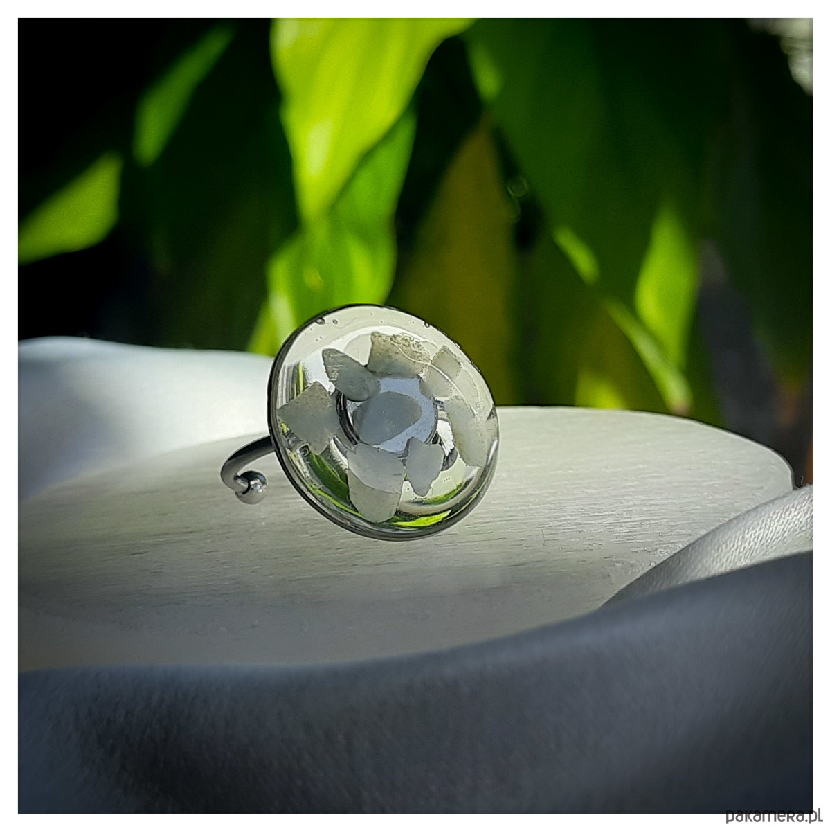 Pierścionek z zatopioym w żywicy epoksydowej amazonitem.