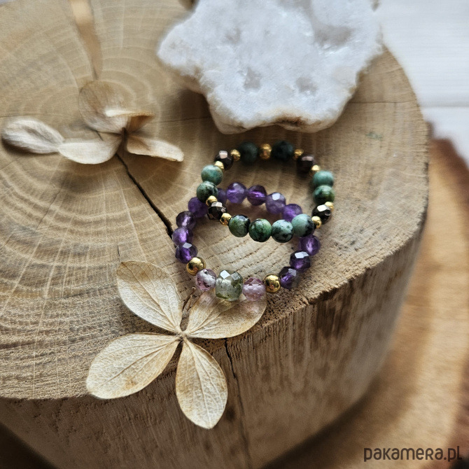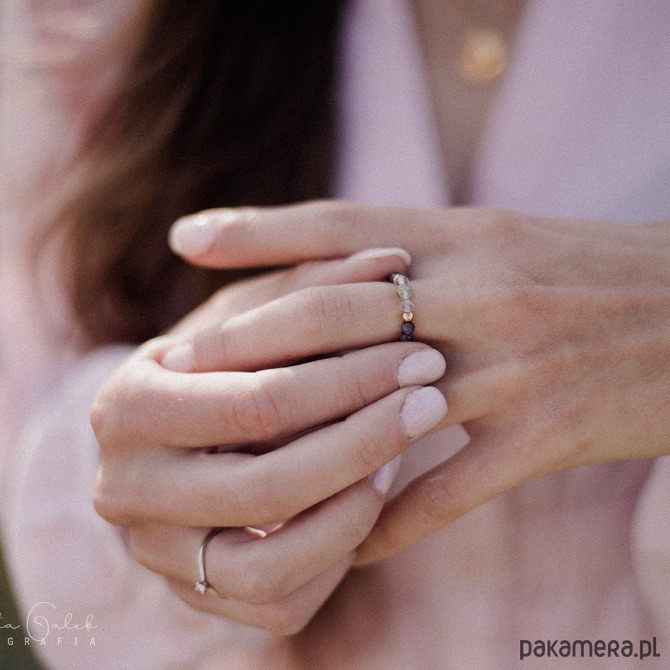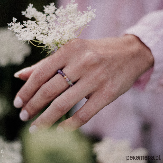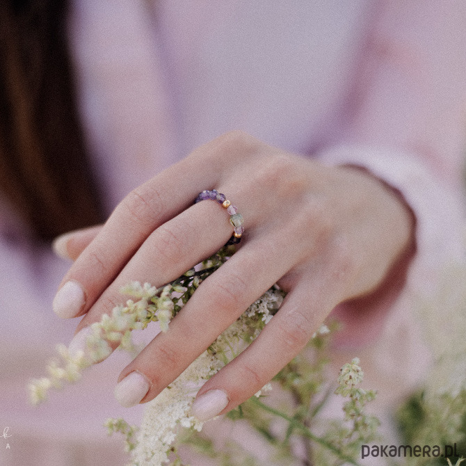 Romantyczny, a nawet trochę baśniowy - taką aurę ma pięknie lśniący pierścionek z ametystem, fluorytem i frenitem. Łączy w sobie dwa odcienie fioletu, przełamane delikatną zielenią frenitu, umieszczonego na środku pierścionka. Całość uzupełniona została delikatnymi dodatkami ze stali szlachetnej w kolorze złotym.