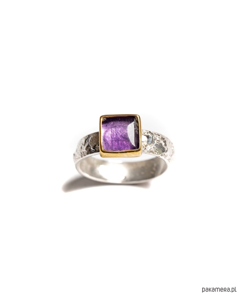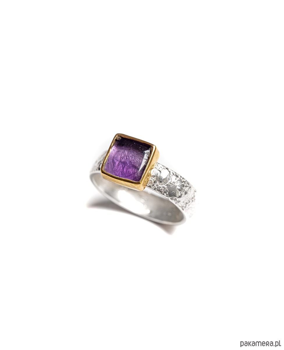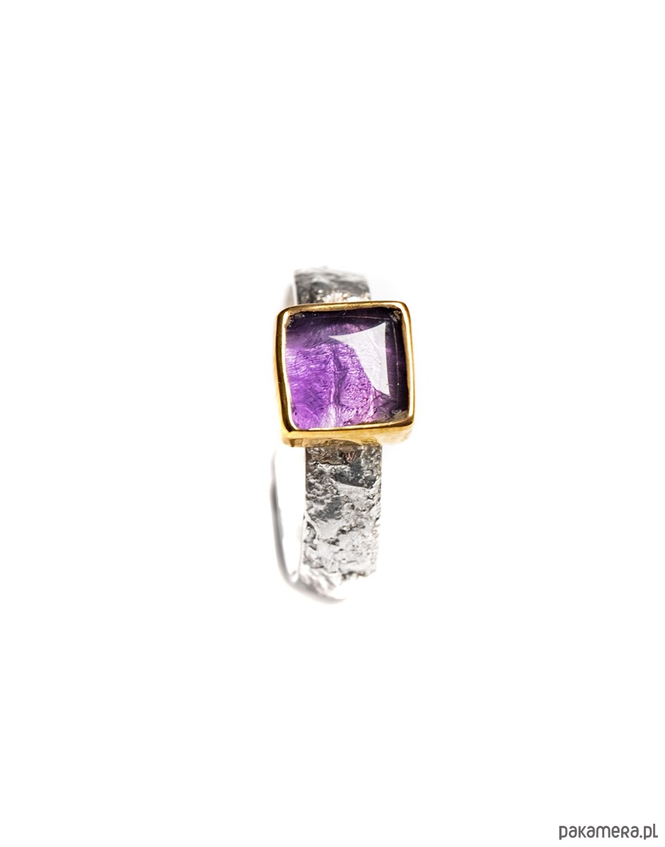 Pierścionek wykonany od podstaw ręcznie ze srebra pr. 925. Naturalny ametyst osadzony w złoconej oprawie na szerokiej, lekko pękatej obrączce o fakturowanej powierzchni o lekko organicznym kształcie, która nadaje mu unikatowy charakter. Oprawa kamienia do wyboru - złocona 24k złotem lub srebrna. Dostępny również w wersji z topazemi kwarcem dymnym.
