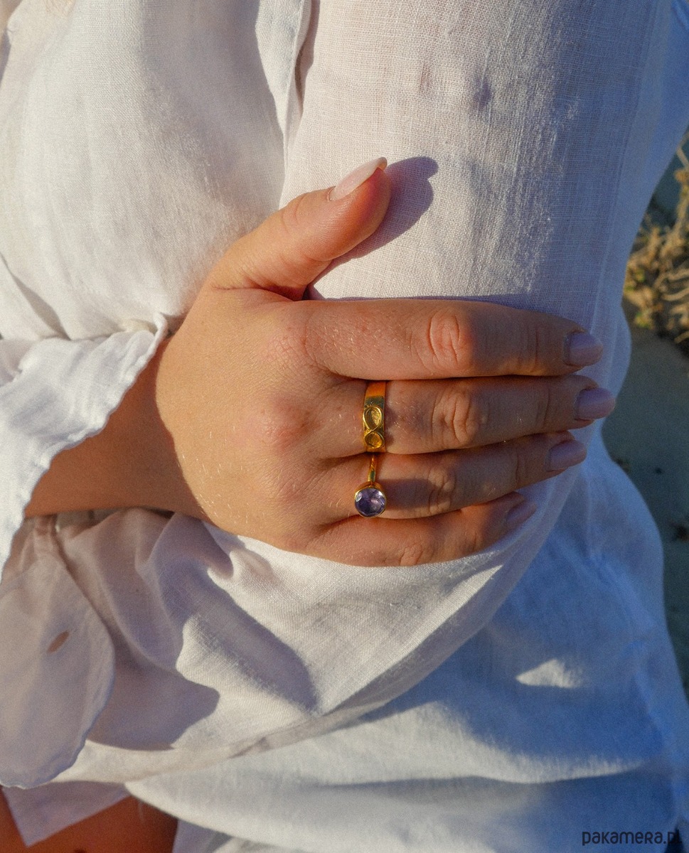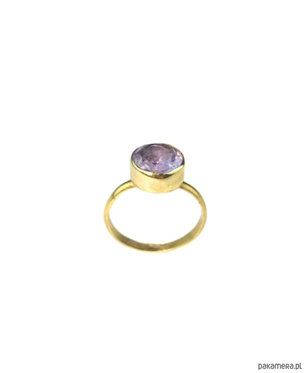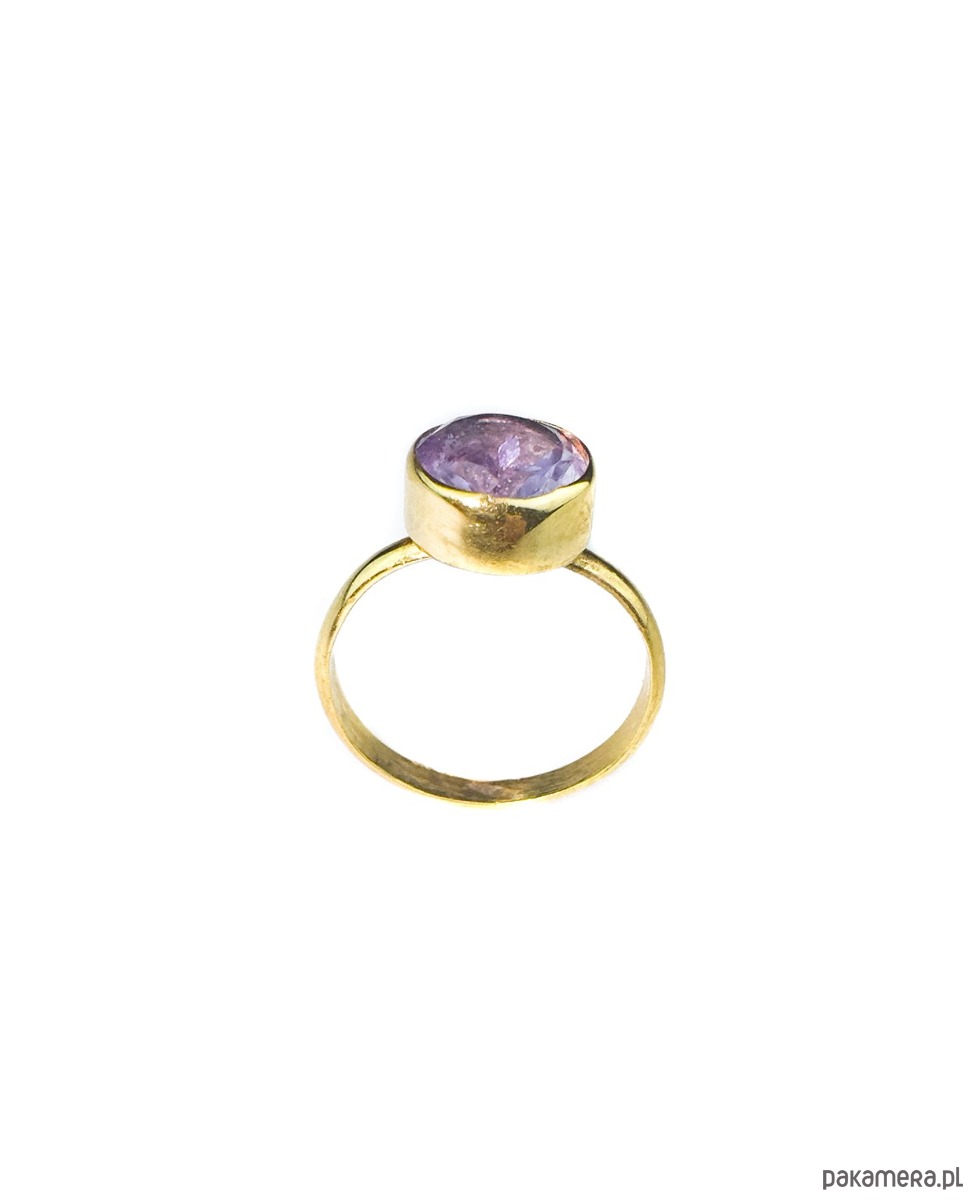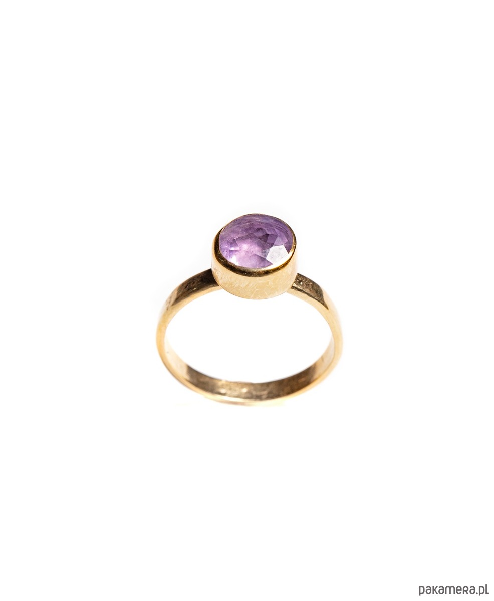Pierścionek z ametystem w klasycznej oprawie, wykonany ręcznie ze srebra 925, złocony 24k złotem.