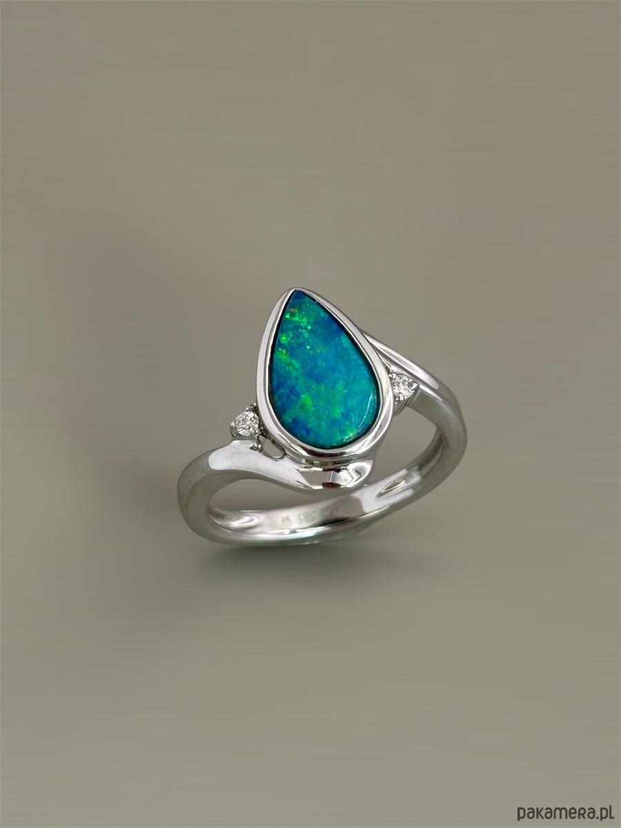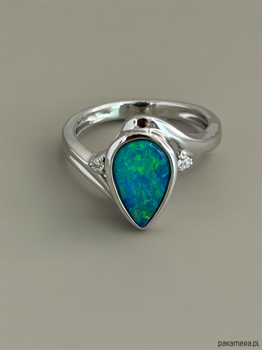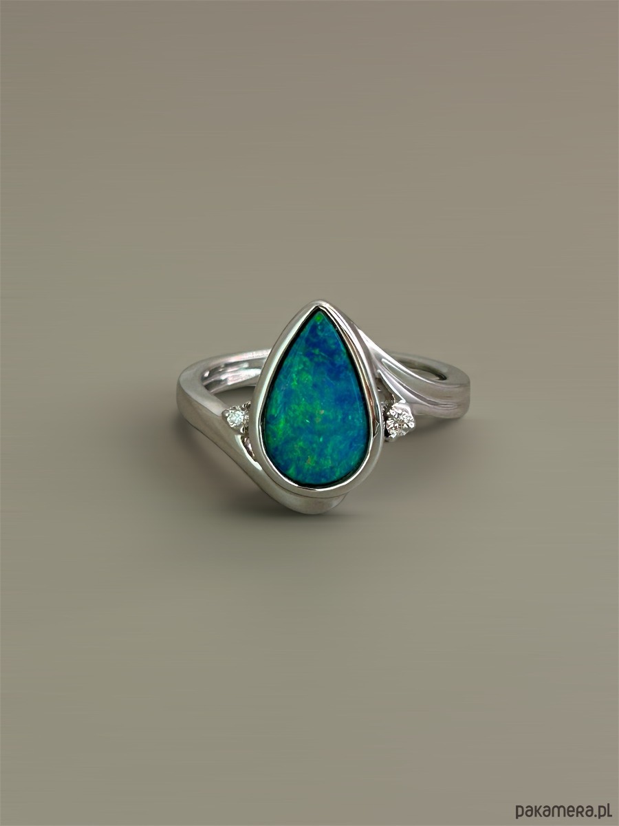 Centralny kamień – opal australijski w kształcie łezki – zachwyca wyjątkową grą barw, od głębokich błękitów po intensywne zielenie, które zmieniają się w zależności od kąta padania światła. To kamień pełen energii i tajemniczości, uważany za symbol kreatywności i emocjonalnej równowagi.