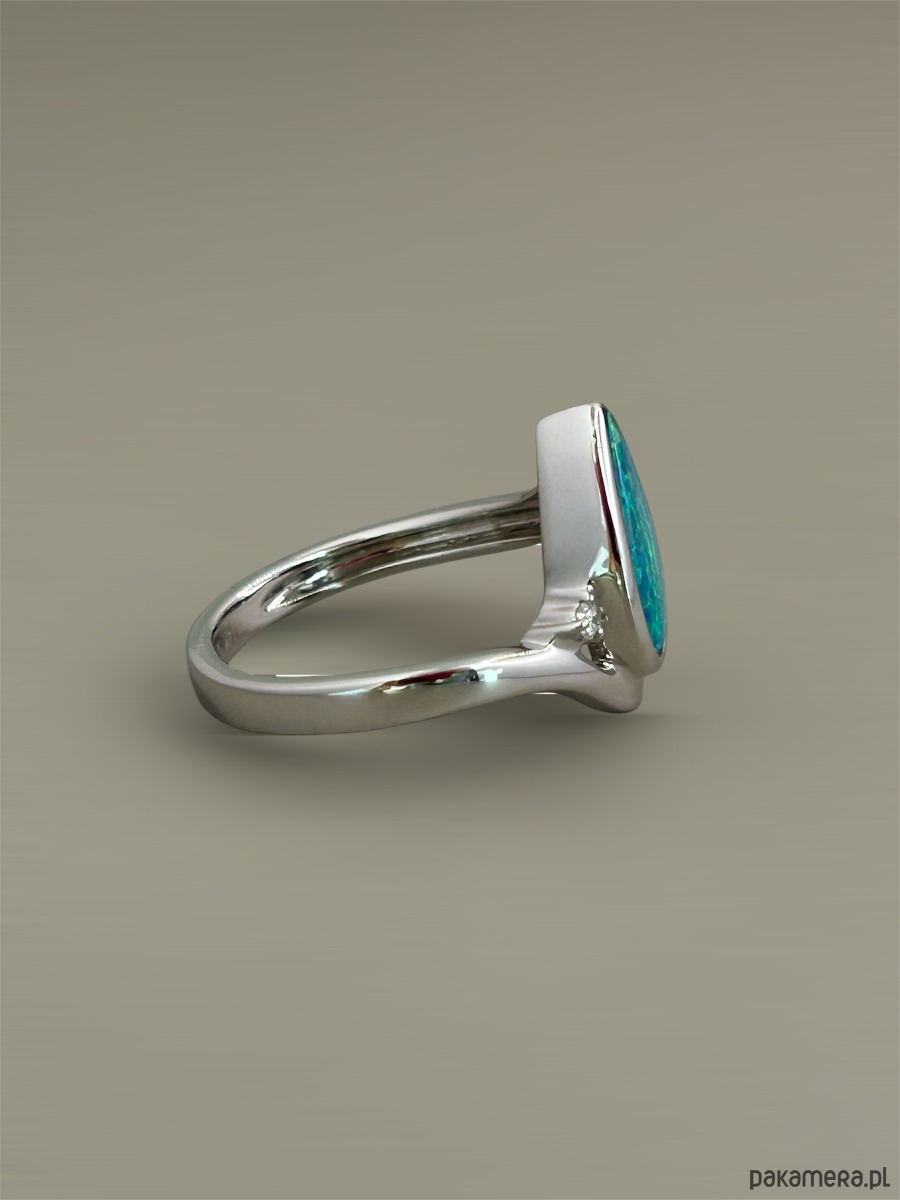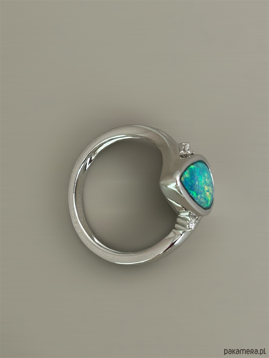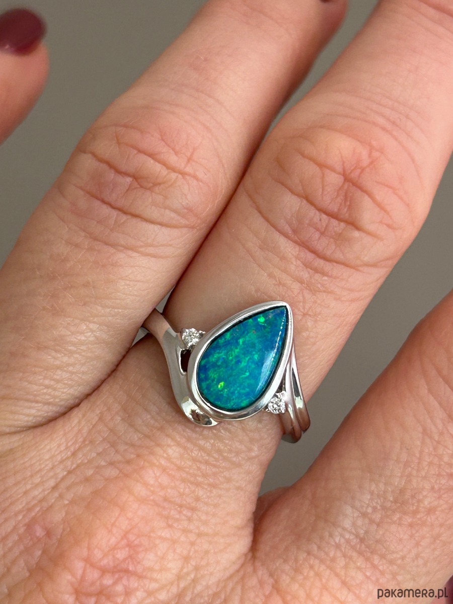 Centralny kamień – opal australijski w kształcie łezki – zachwyca wyjątkową grą barw, od głębokich błękitów po intensywne zielenie, które zmieniają się w zależności od kąta padania światła. To kamień pełen energii i tajemniczości, uważany za symbol kreatywności i emocjonalnej równowagi.