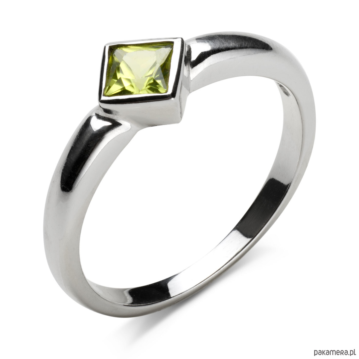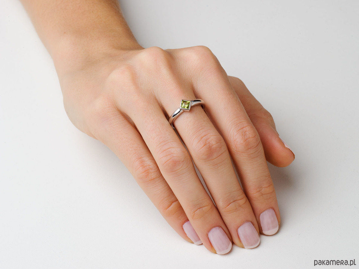 Piierścionek wykonany z białego złota próby 585 (14k) z naturalnym oliwinem-perydotem w kolorze ciepłej zieleni. Pełna oprawa kwadratowego perydotu gwarantuje bezproblemowe, codzienne użytkowanie pierścionka - kamień nie haczy ubrań i jest pewnie umocowany. Pierścionek wykonany jest w całości przez polskiego jubilera - konkretnie krakowskiego.