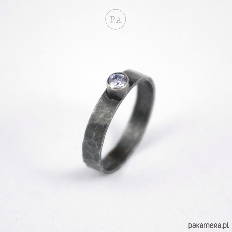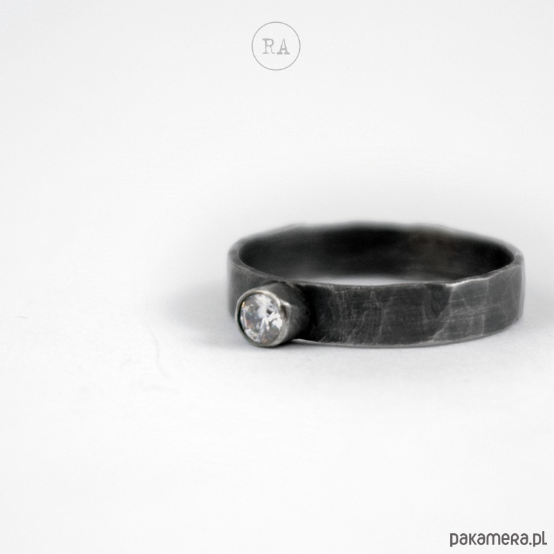 Pierścionek z brylantem wykonany ręcznie ze srebra 925, oksydowany, młotkowany.