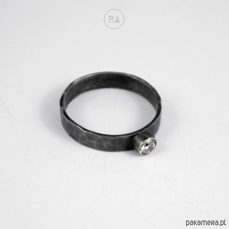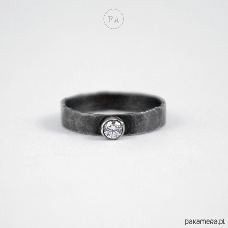 Pierścionek z brylantem wykonany ręcznie ze srebra 925, oksydowany, młotkowany.