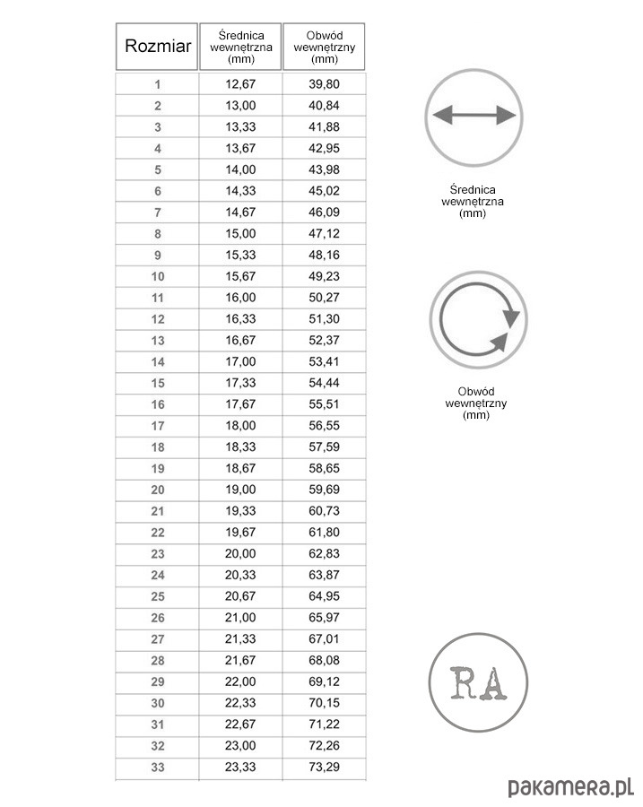 Rozmiar: po zakupie prosimy podać rozmiar wg tabeli - pierścionek wykonamy na każdy rozmiar.
