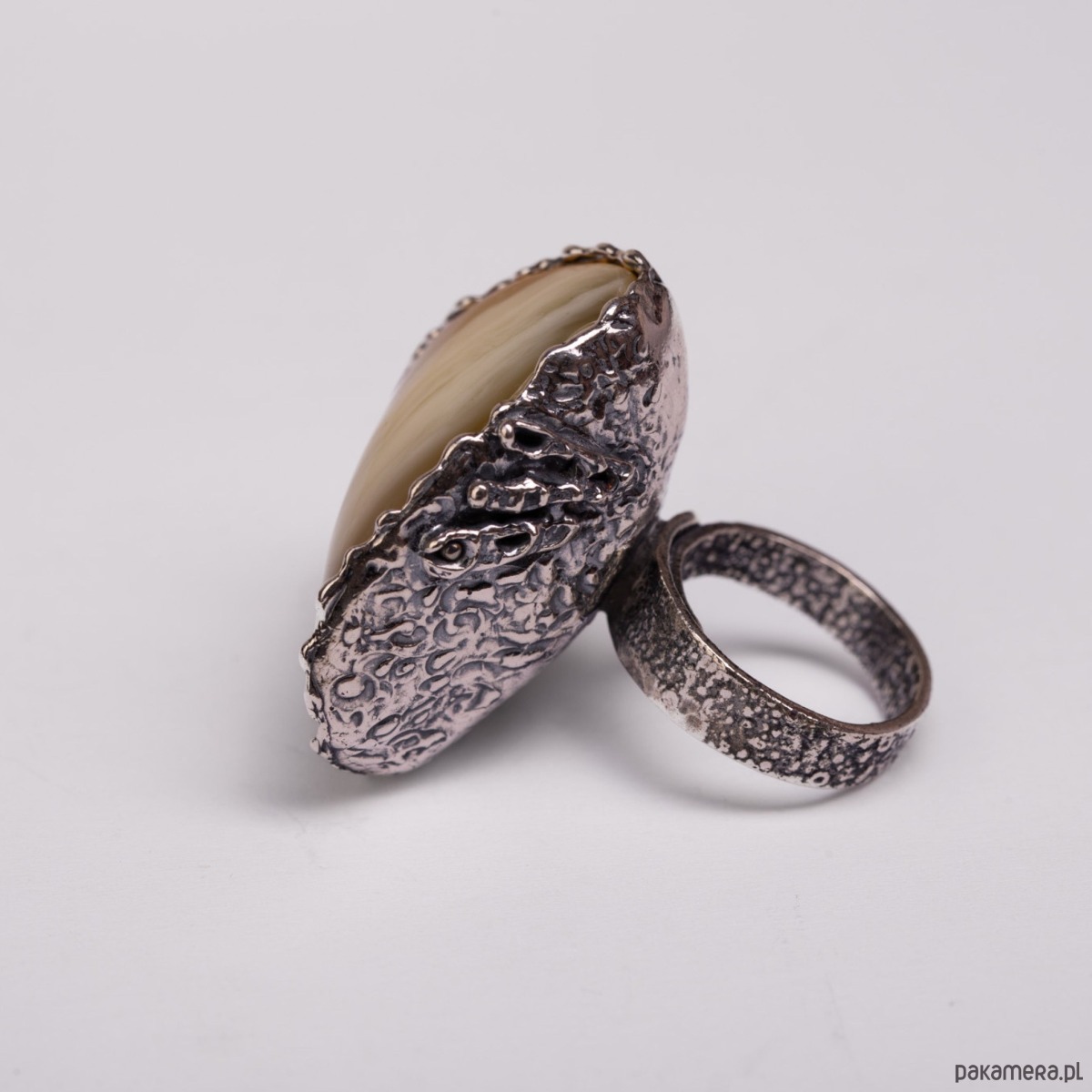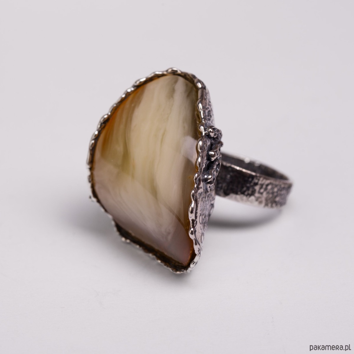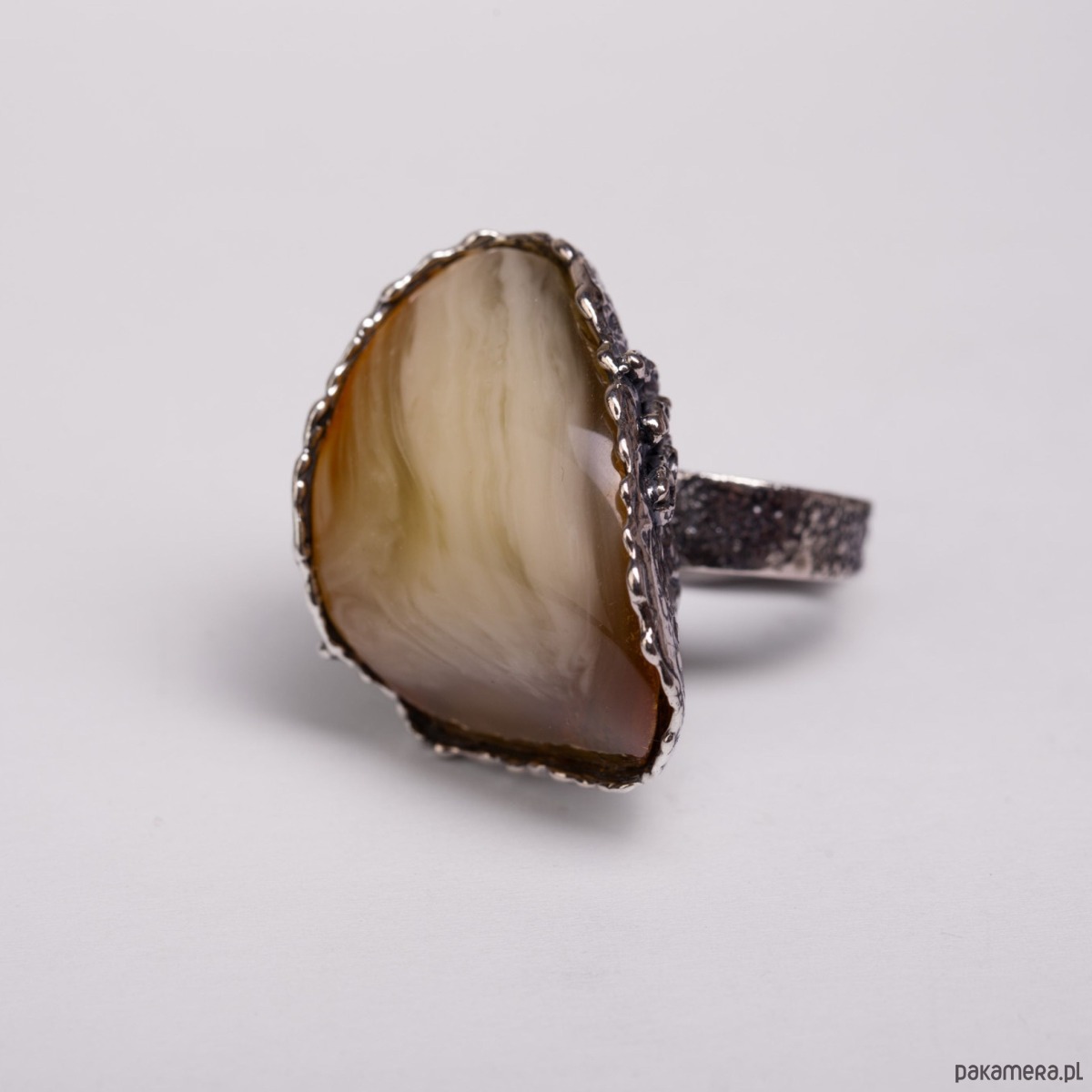 Wyrazisty, ręcznie wykonany pierścionek z oksydowanego srebra z pięknym, kremowo-miodowym bursztynem. Z jednej strony oprawy zdobiony subtelną, srebrną różą, która dodaje mu charakteru i delikatności. Ten pierścionek przyciąga spojrzenia – łączy w sobie surowość metalu i miękkość naturalnego kamienia. Na dłoni czuć jego solidność i siłę, ale też elegancką lekkość. Idealny dla kobiety, która lubi biżuterię z duszą i wyrazem.