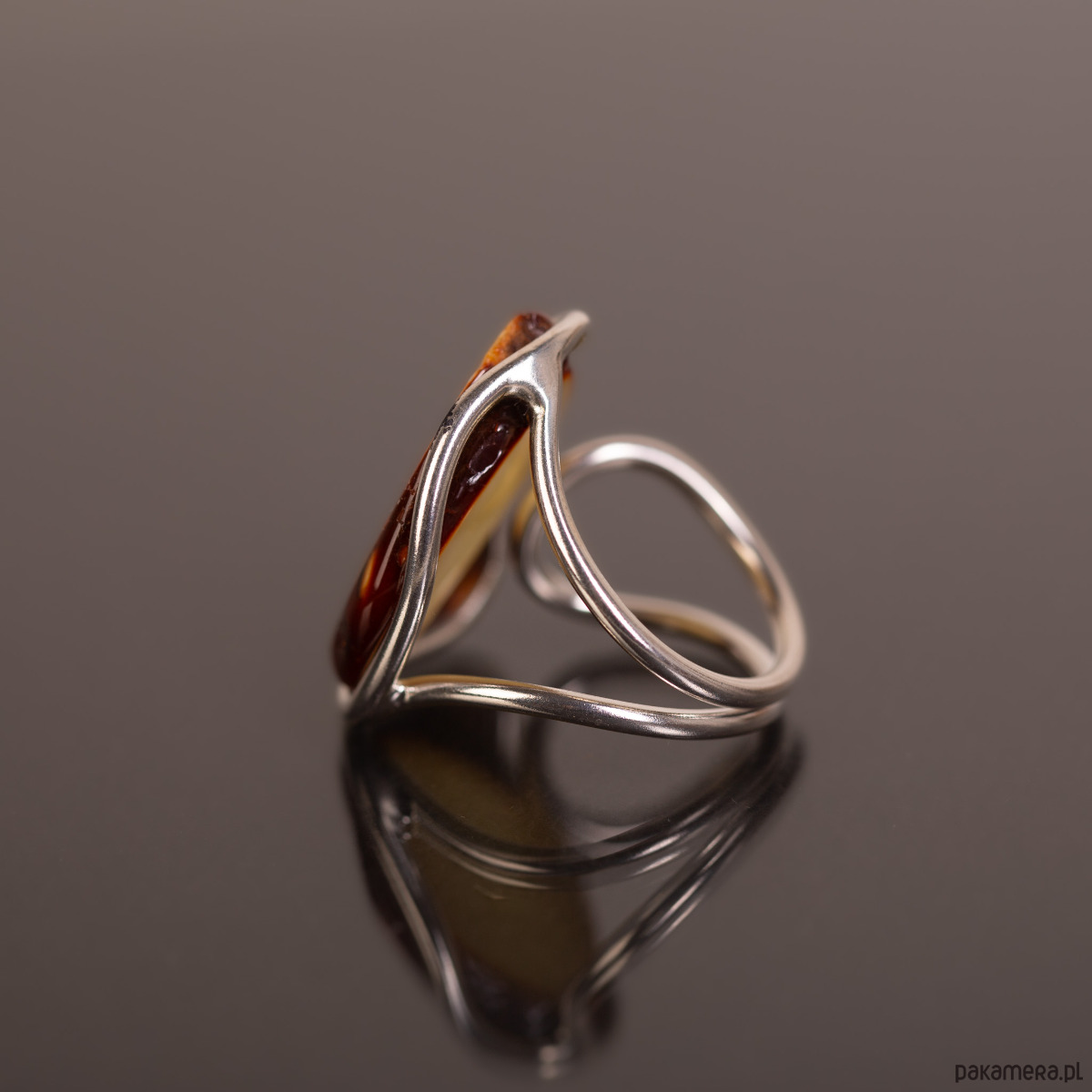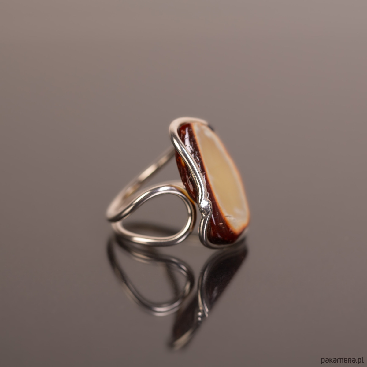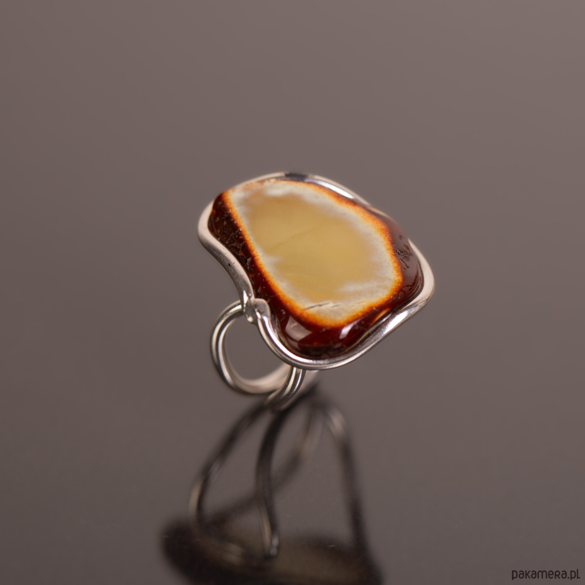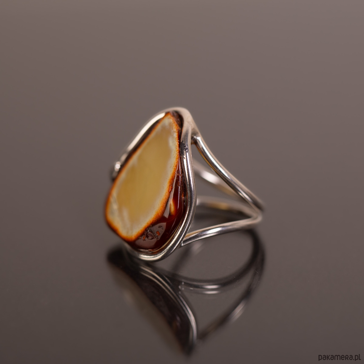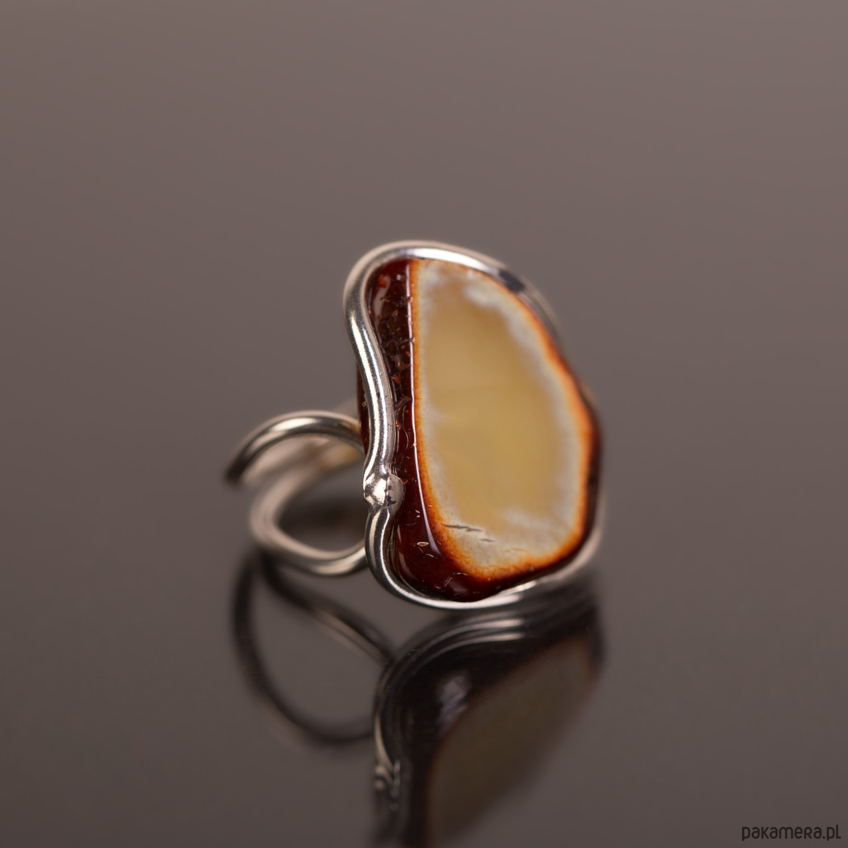Subtelny, artystyczny pierścionek z naturalnym plastrem bursztynu bałtyckiego. Bursztyn zachowuje swój surowy charakter — ciemniejsza, koniakowa krawędź kontrastuje z jasnym, mlecznym wnętrzem, tworząc efekt naturalnego obramowania. Minimalistyczna oprawa ze srebra próby 925 płynnie przechodzi w podwójną, lekką obrączkę, co nadaje całości nowoczesny i lekki wygląd.