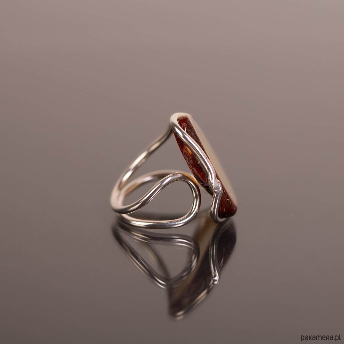 Srebro próby 925 · naturalny bursztyn bałtycki · waga 8 g · wymiary oprawy 2,3 × 2,5 cm · obrączka regulowana EU 9–18 · ręczna praca autorska