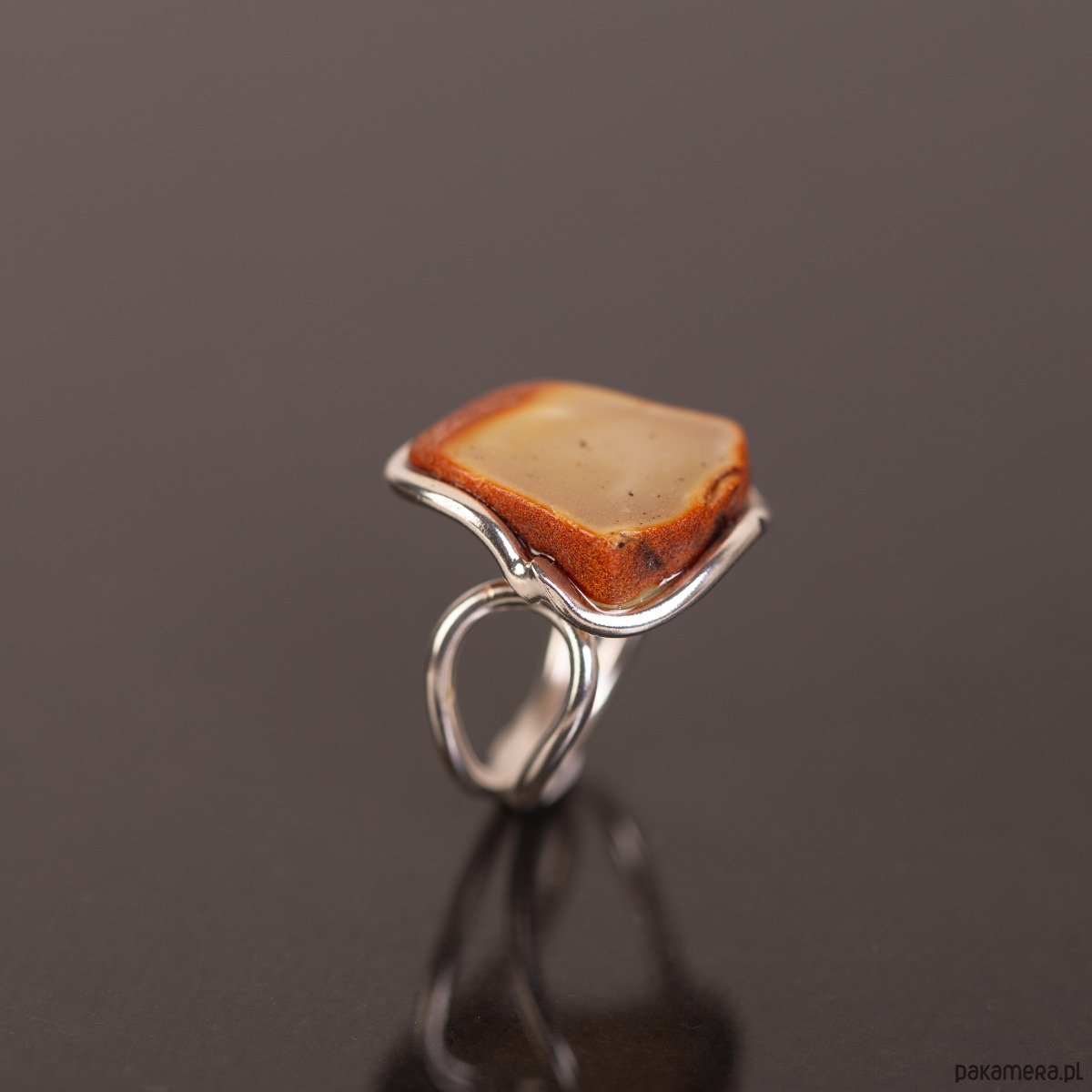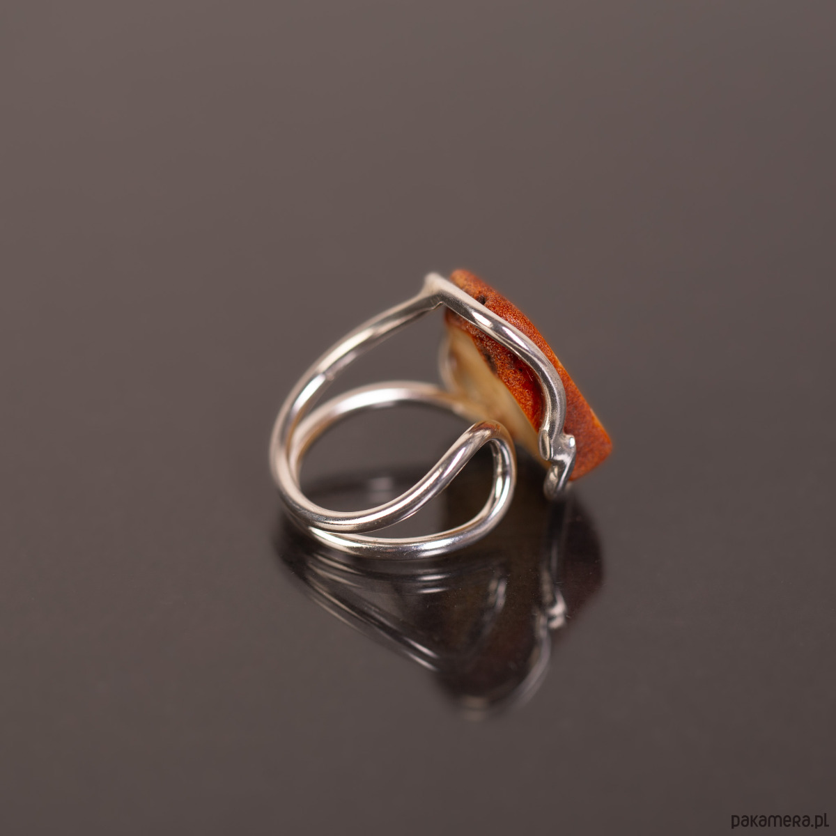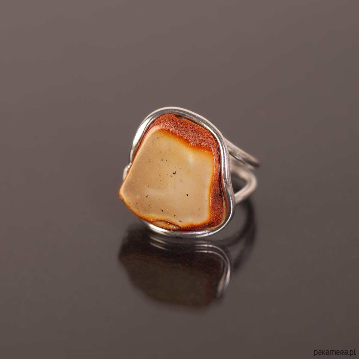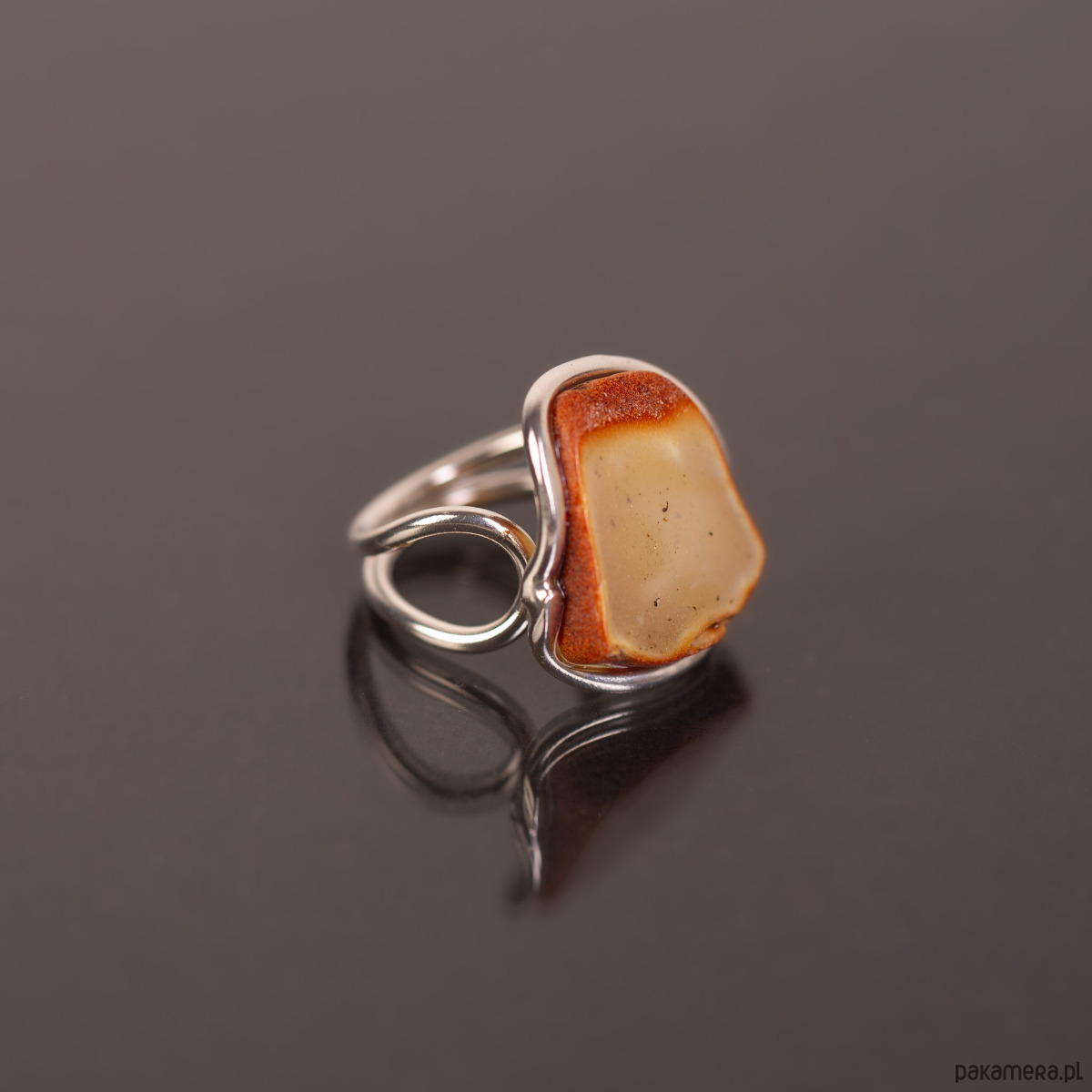Subtelny, artystyczny pierścionek z naturalnym plastrem bursztynu bałtyckiego. Bursztyn zachowuje swój surowy charakter — ciemniejsza, koniakowa krawędź kontrastuje z jasnym, mlecznym wnętrzem, tworząc efekt naturalnego obramowania. Minimalistyczna oprawa ze srebra próby 925 płynnie przechodzi w podwójną, lekką obrączkę, co nadaje całości nowoczesny i lekki wygląd.