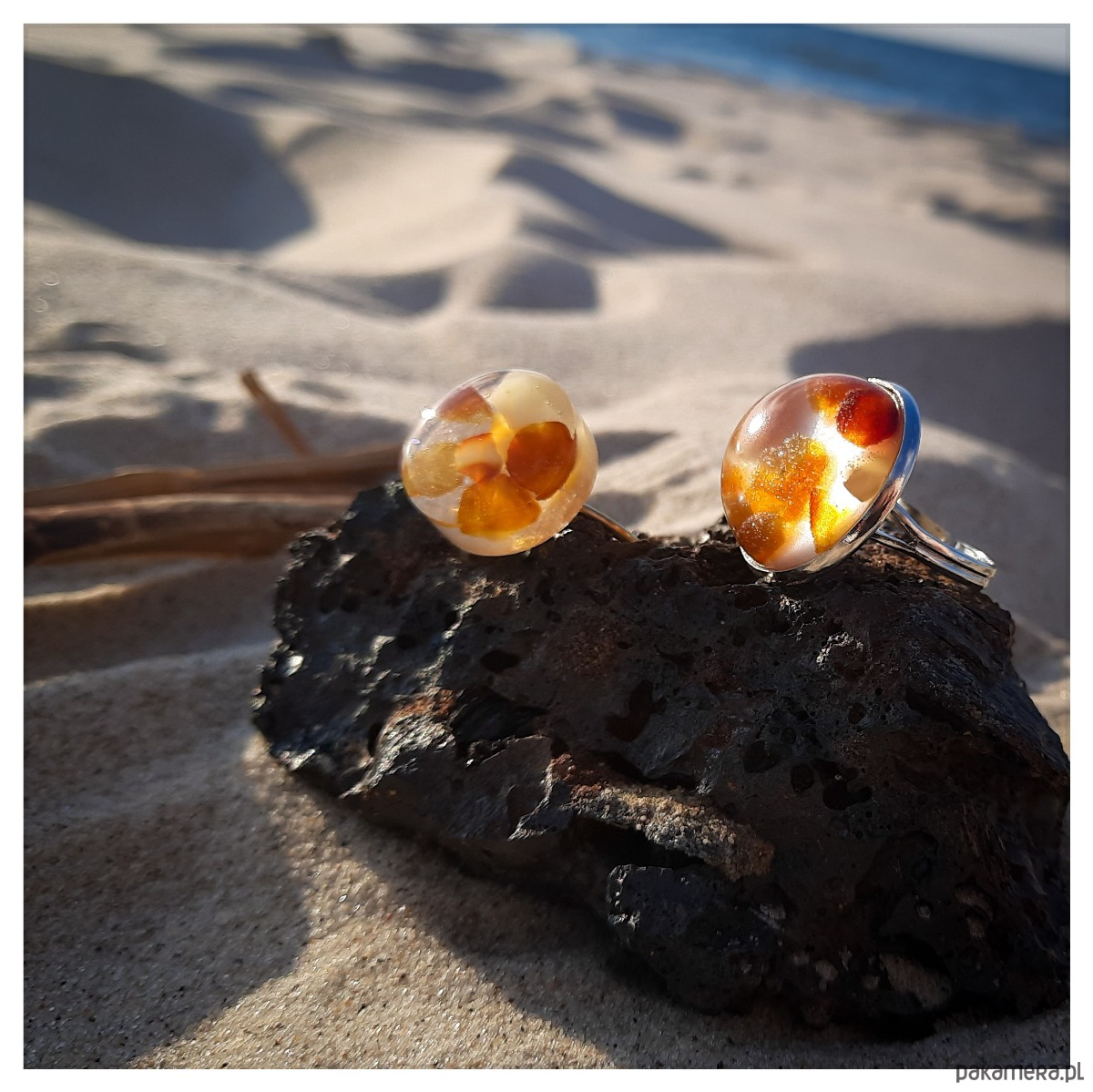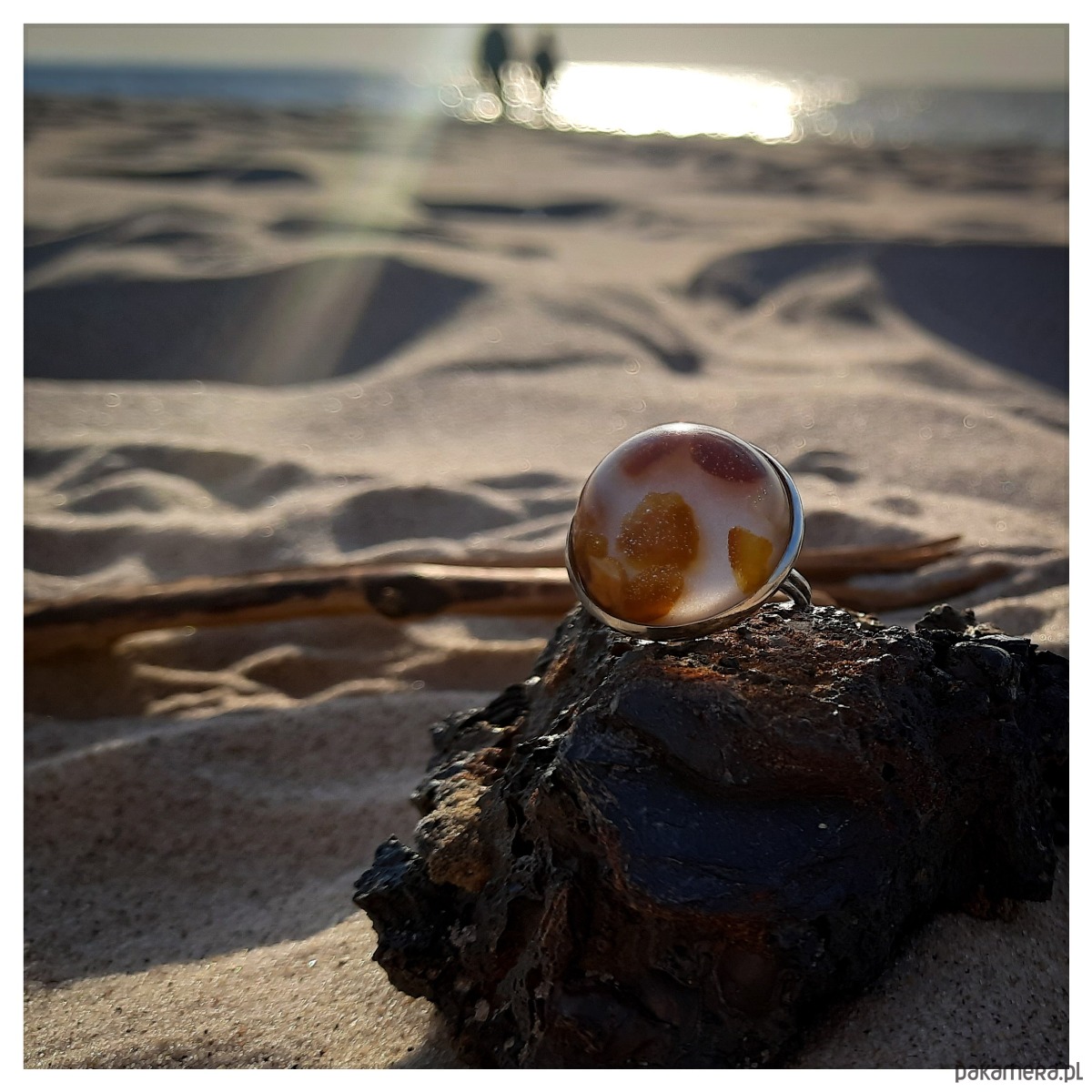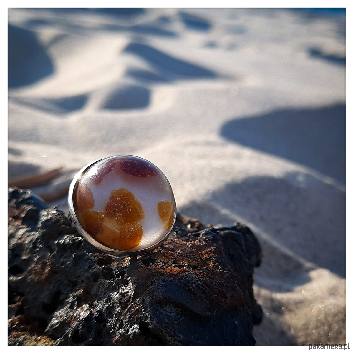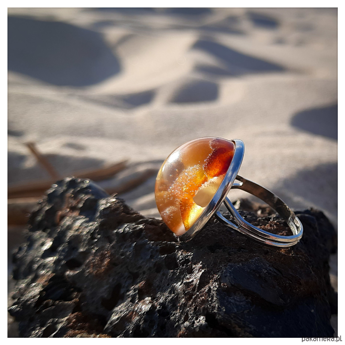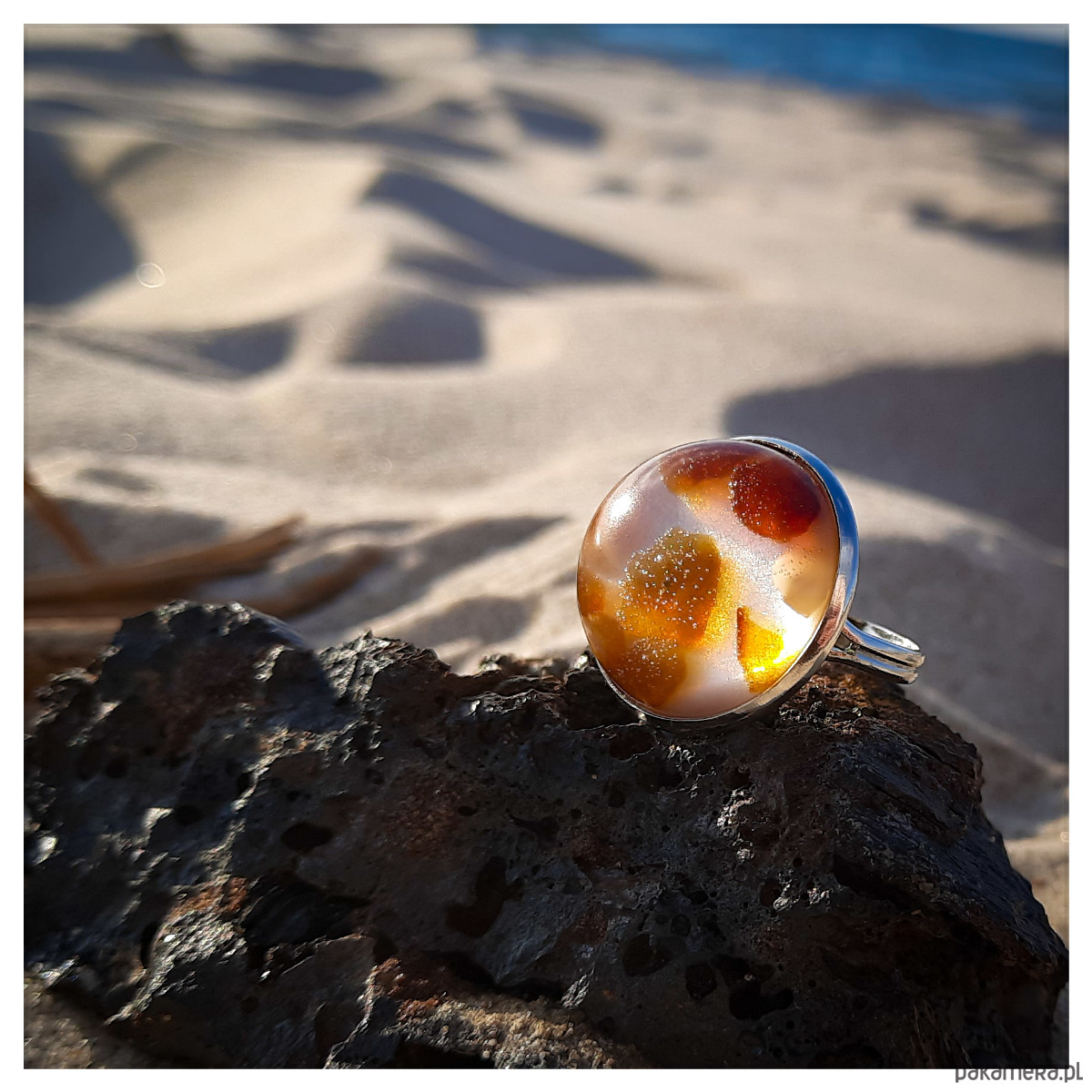 Pierścionek z zatopionym w żywicy epoksydowej bursztynem na perłowym tle.