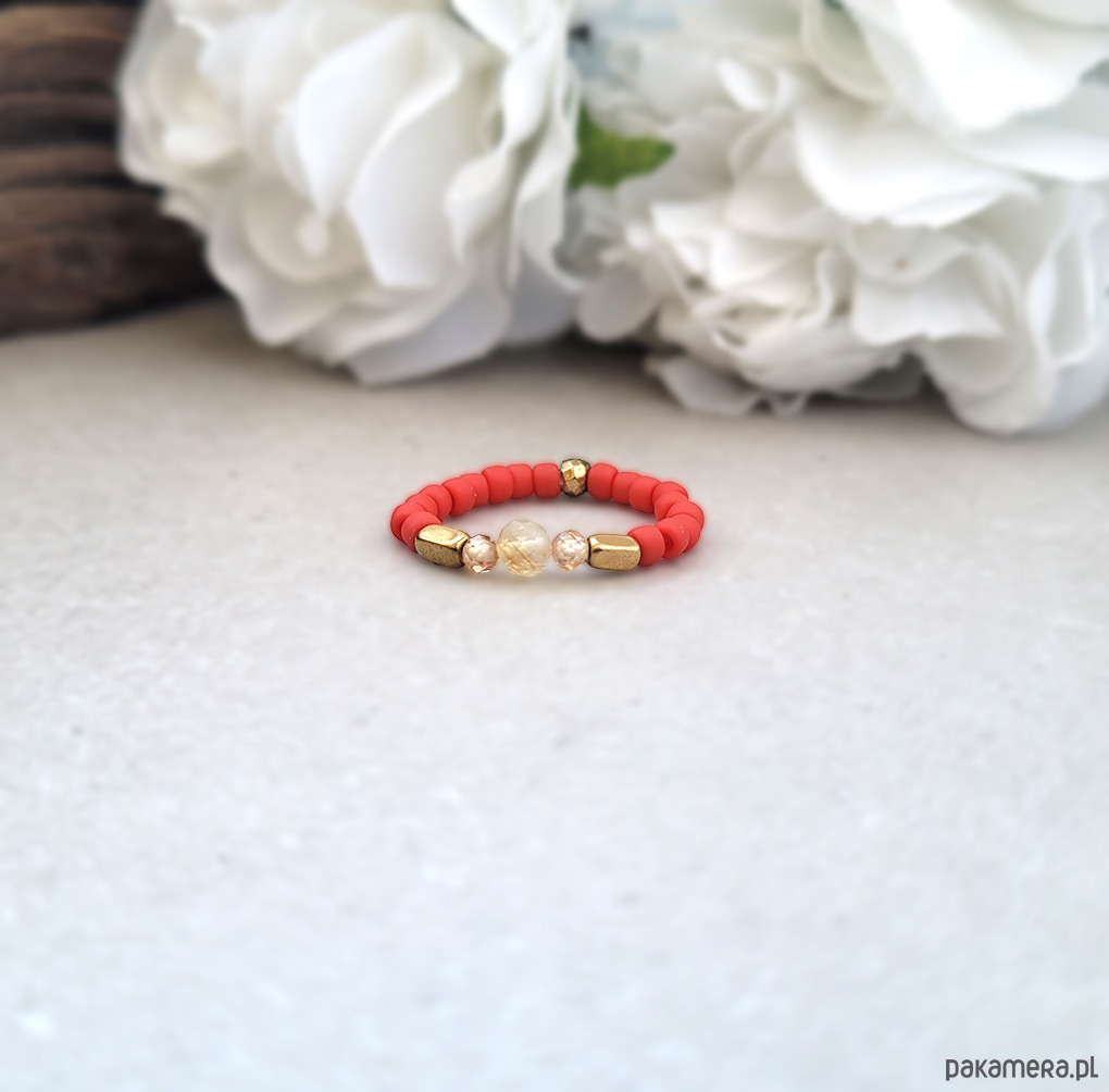Piękny pierścionek elastyczny z Cytrynem, Hematytem w kolorze złota oraz Cyrkoniami.