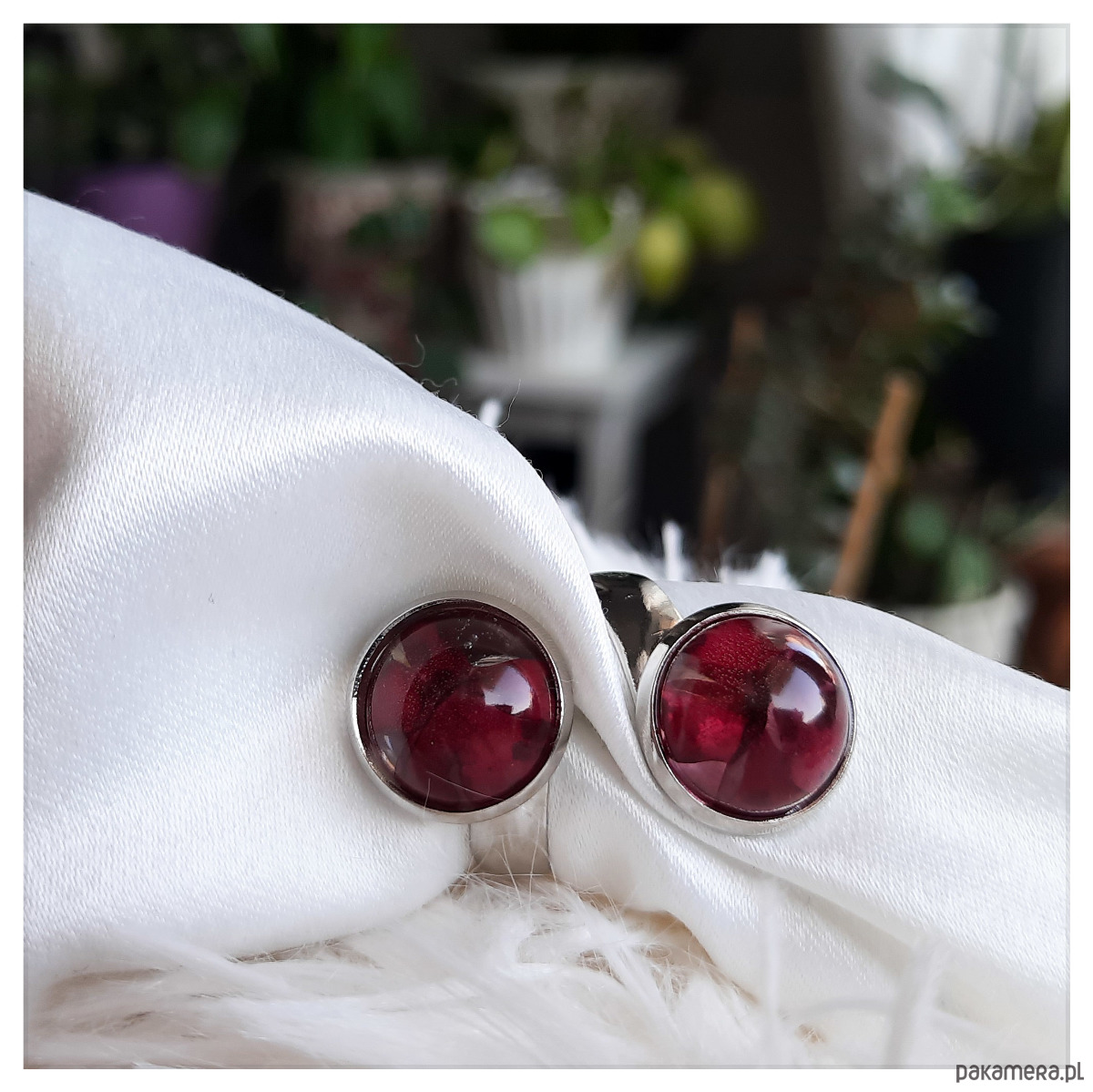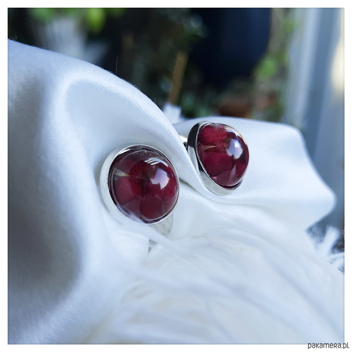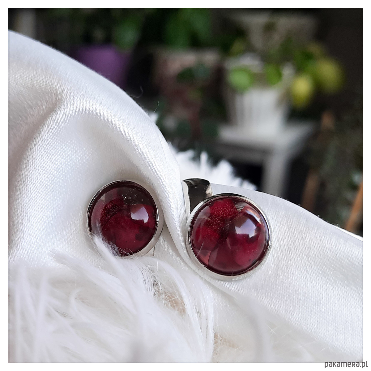 Pierścionek z zatopionymi w żywicy epoksydowej czerwonymi polnymi kwiatami.