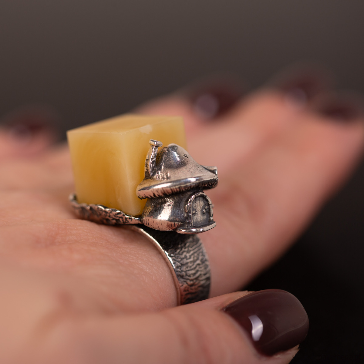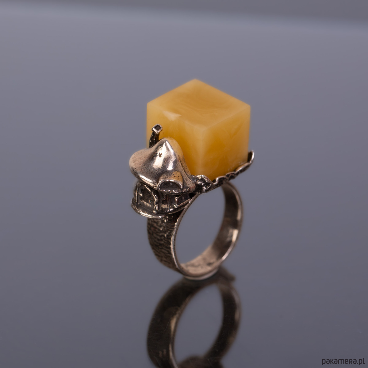 Uroczy pierścionek z małym srebrnym domkiem — jak miniaturowa scenka zamknięta w biżuterii. Obok niego osadzono bursztyn bałtycki w formie niewielkiej kostki: mleczno‑miodowy, gładki, z miękkim blaskiem, który ociepla całość. To projekt, który łączy rzemiosło z opowieścią — delikatny, a jednocześnie wyrazisty.