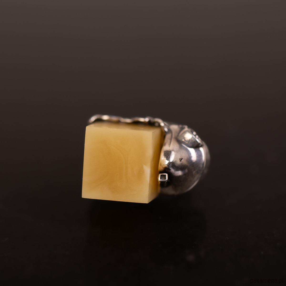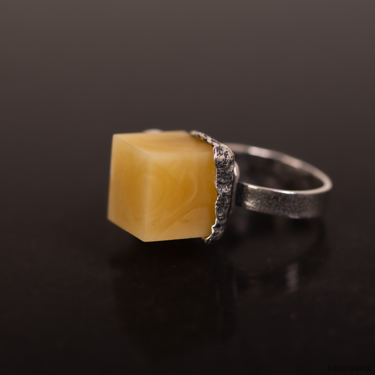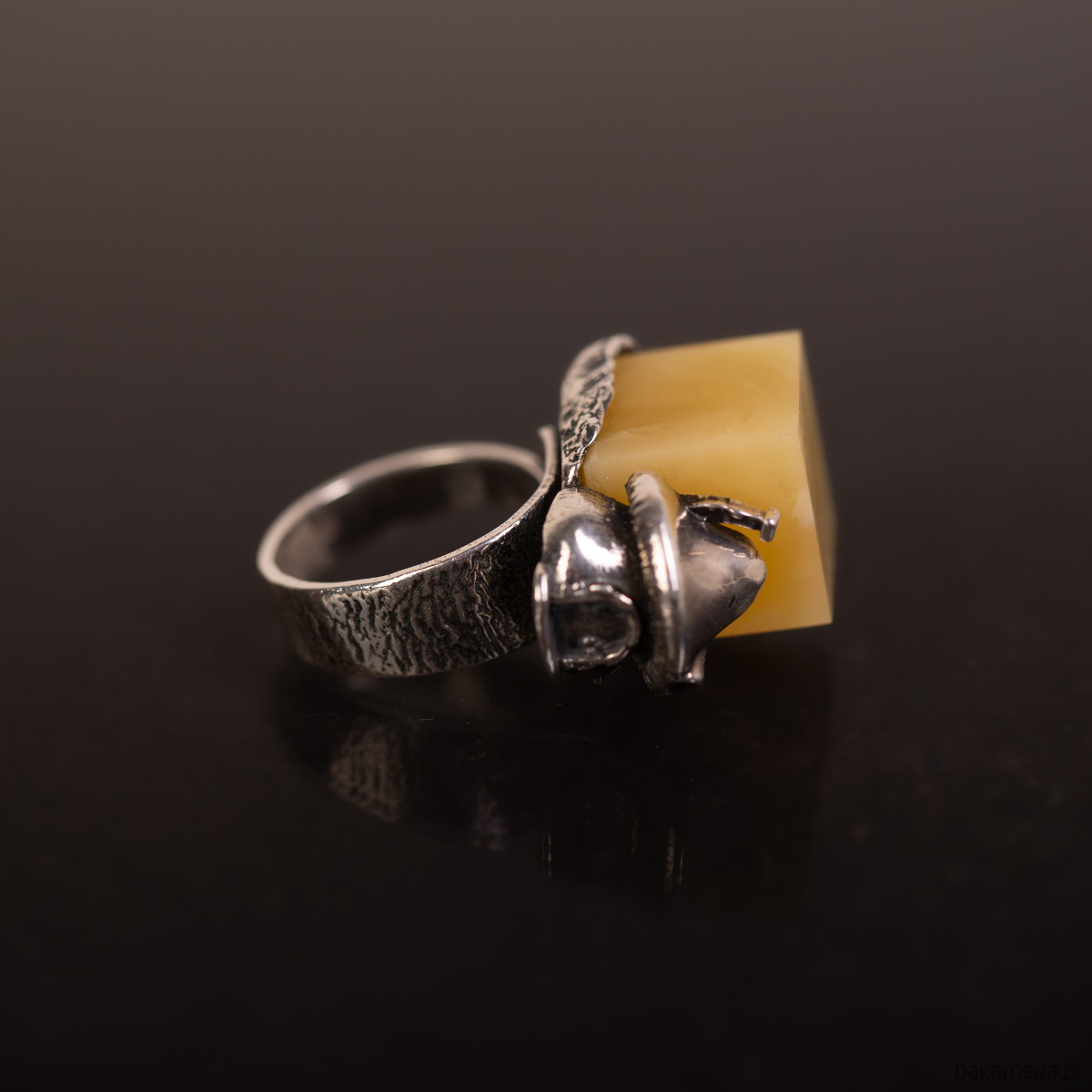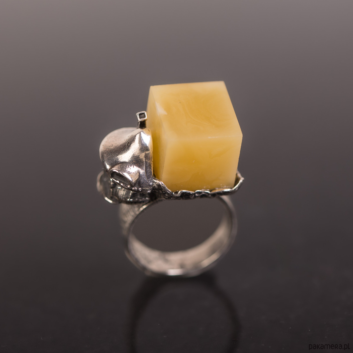 Srebro próby 925 · naturalny bursztyn bałtycki · waga 14 g · bursztyn ok. 1,4 × 1,4 × 1,4 cm · domek ok. 1,4 × 1,4 cm · obrączka regulowana EU 9–20 · wykonanie ręczne, praca autorska
