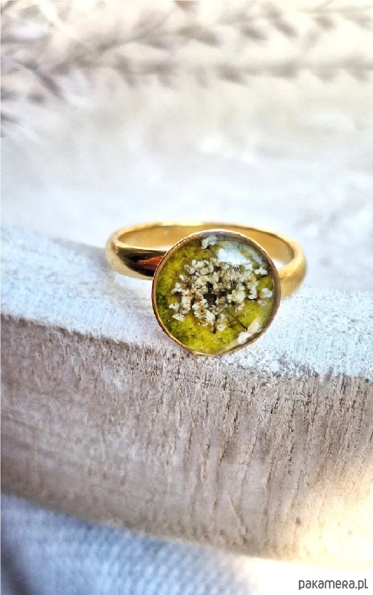 Ten wyjątkowy pierścionek to połączenie natury i artyzmu w jednym. W jego centrum, na tle ręcznie malowanej akwareli, znajduje się zatopiony w żywicy kwiat dzikiej marchwi, zachowując swoje naturalne piękno na zawsze. Tło, malowane z precyzją przy użyciu japońskich akwareli z naturalnych pigmentów, dodaje pierścionkowi unikalnego charakteru. Baza pierścionka, wykonana z trwałej i hipoalergicznej stali chirurgicznej, jest regulowana, co pozwala na idealne dopasowanie do każdego rozmiaru palca. Każdy pierścionek jest niepowtarzalny, dzięki ręcznemu malowaniu i naturalnej formie kwiatu. Ten ręcznie robiony pierścionek to idealny dodatek dla kobiet ceniących sobie oryginalną biżuterię z żywicy i kwiatów, a także doskonały pomysł na prezent, pełen subtelności i wdzięku.