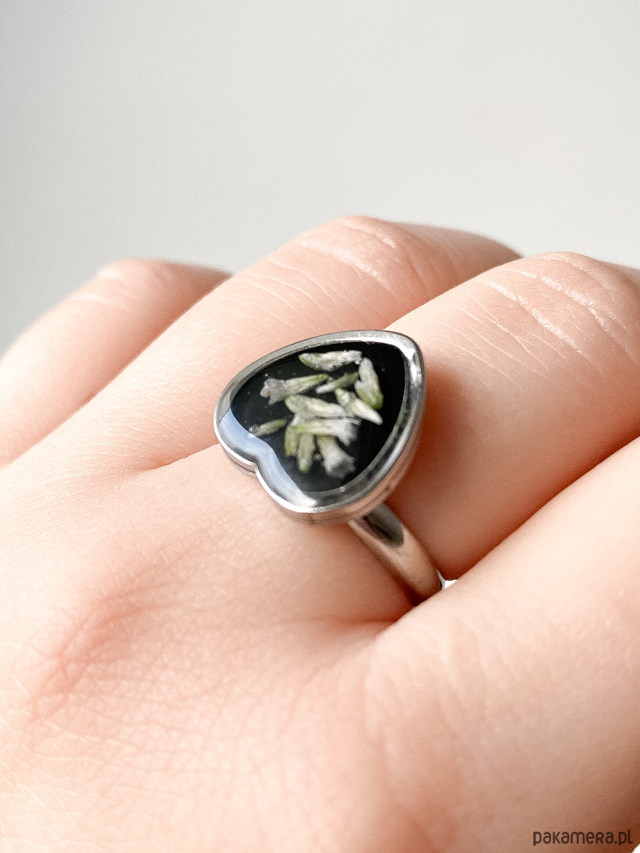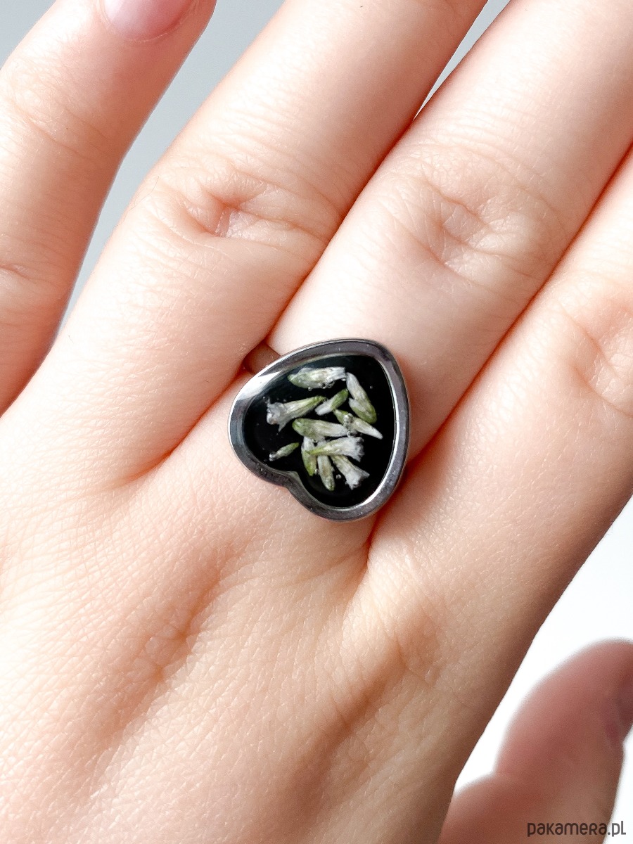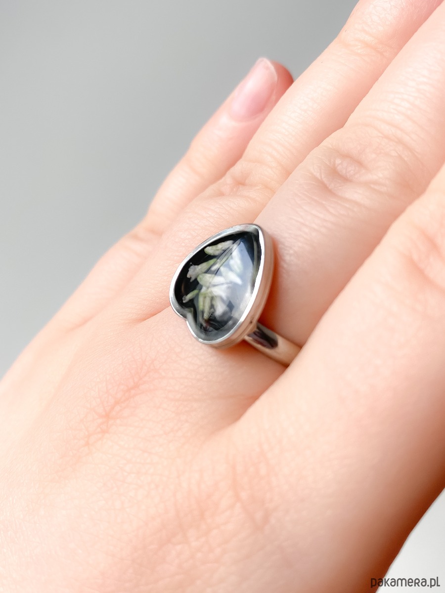 Pierścionek z prawdziwymi suszonymi kwiatuszkami zatopionymi w żywicy. Pierścionek jest regulowany, można go zwiększyć lub pomniejszyć, dzięki czemu możesz dopasować go idealnie do swojego rozmiaru (Idealna opcja na prezent).