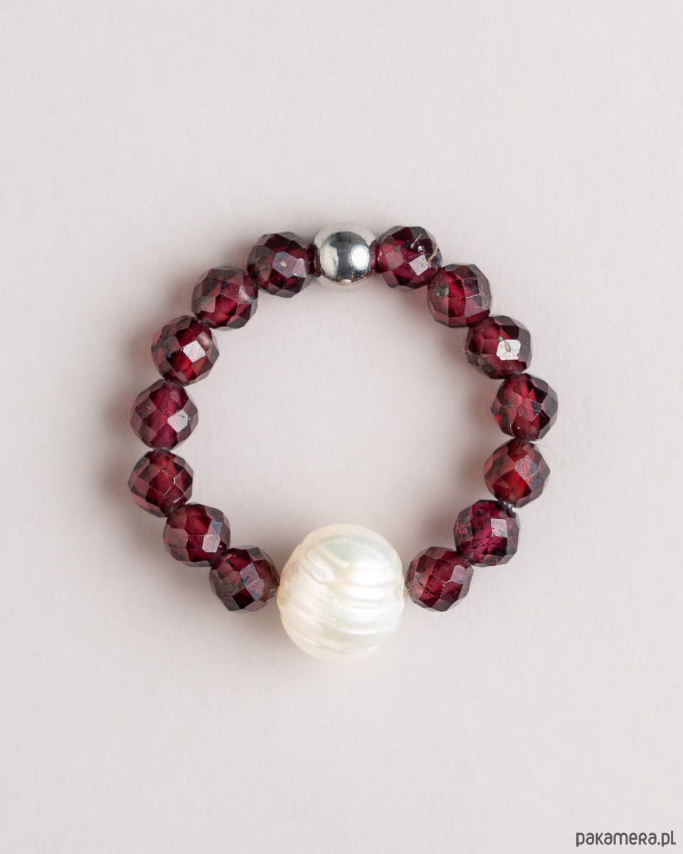 Przepiękny pierścionek z granatu o cudownej falsetowanej strukturze . Piekna duża nieregularna perła . Wykończenie stal szlachetna.
