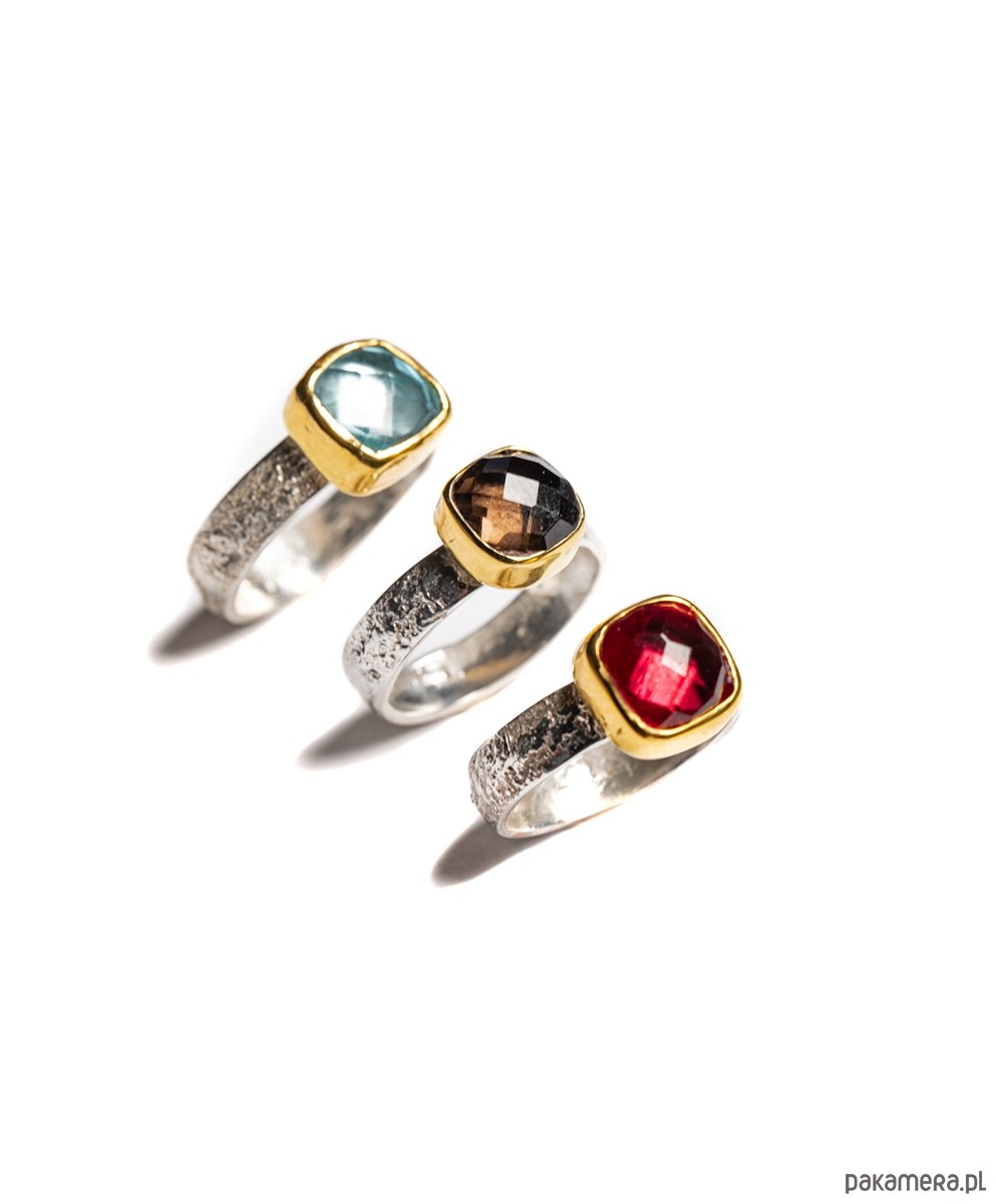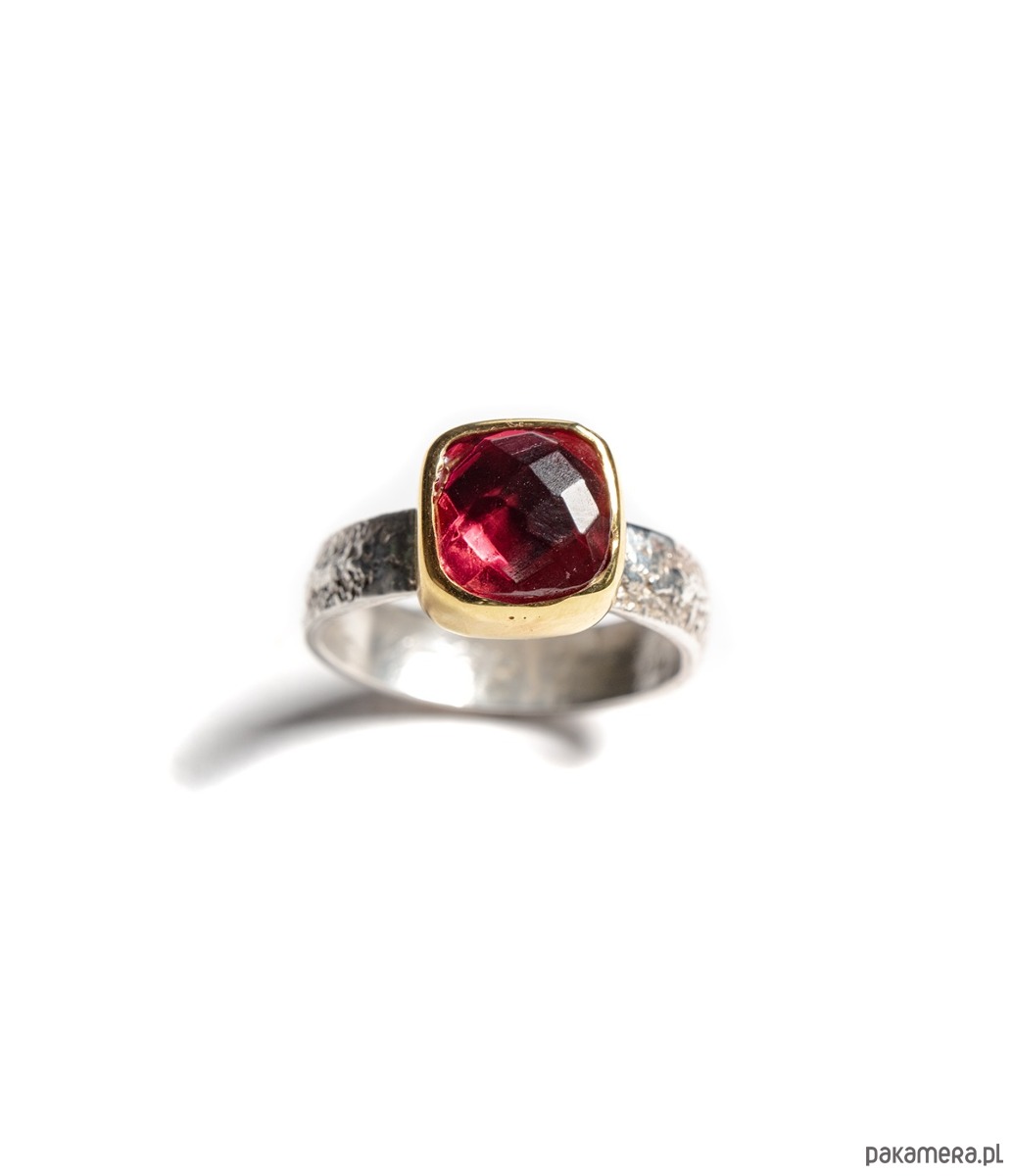 Wyrazisty i pełen charakteru, pierścionek wykonany ręcznie od podstaw ze srebra 925. Naturalny, fasetowany granat - kamień odwagi, oprawiony w srebro złocone 24k złotem. Osadzony na fakturowanej obrączce, która nadaje mu niepowtarzalny styl.
