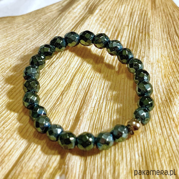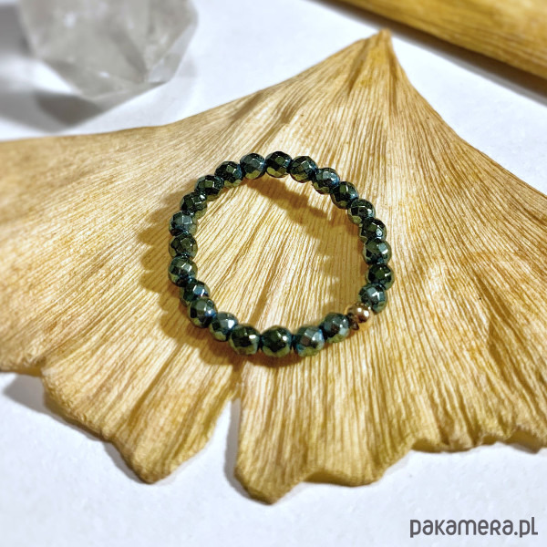 Pierścionek z zielonego połyskliwego hematytu z przekładką z pozłacanego srebra (próba 925). Całość na elastycznej silikonowej gumce jubilerskiej.