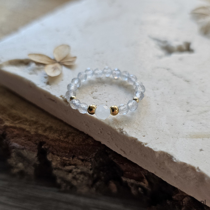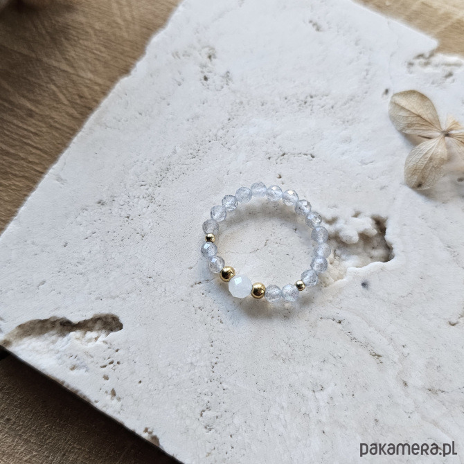 Stworzony, by lśnić! Elegancki pierścionek, którego bazą jest labradoryt - minerał pięknie mieniący się pod wpływem światła. Nie raz zaskoczy Cię swoją barwą, ukazując szarości, srebrzystości a nawet błękity. Na środku labradorytowej obrączki umieszczony został nieco większy, biały jadeit, a całość uzupełniona została dodatkami ze stali szlachetnej w kolorze złotym.