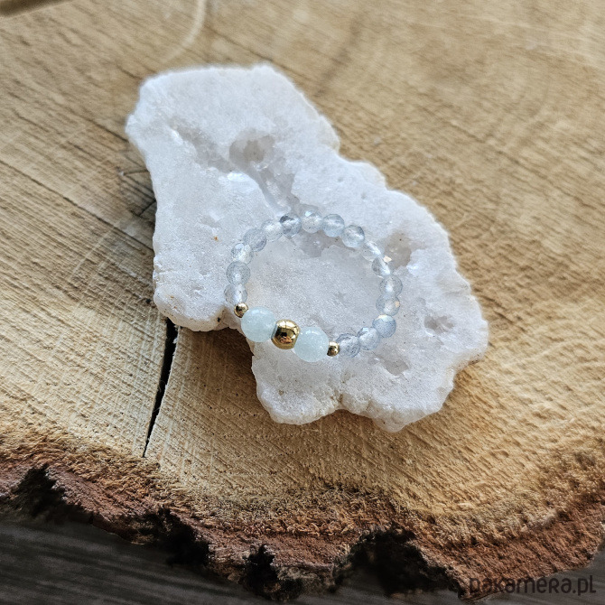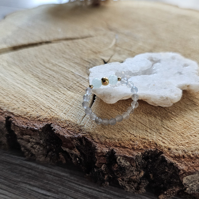 Elegancki pierścionek, którego bazą jest labradoryt - minerał pięknie mieniący się pod wpływem światła. Nie raz zaskoczy Cię swoją barwą, ukazując szarości, srebrzystości a nawet błękity. Kontrastem dla fasetowanych labradorytów są okrągłe, błękitne jadeity, a całość uzupełniona została dodatkami ze stali szlachetnej w kolorze złotym.