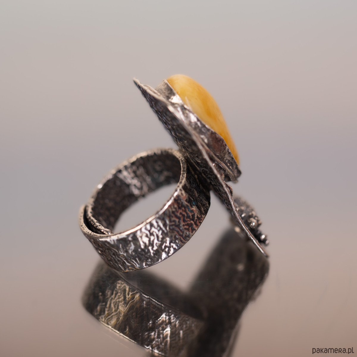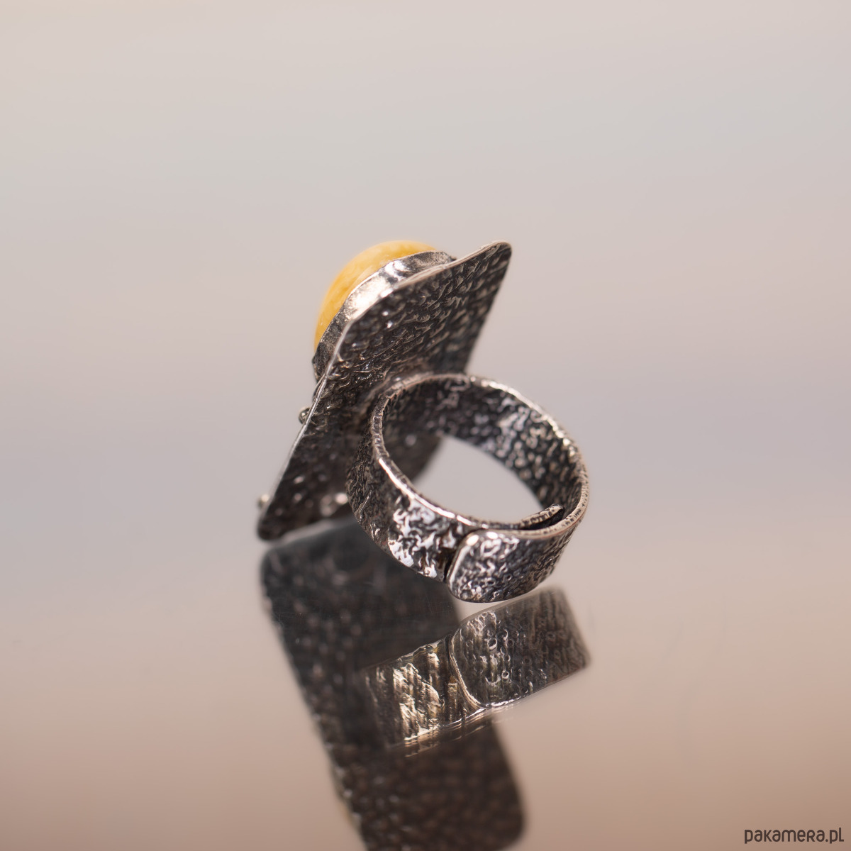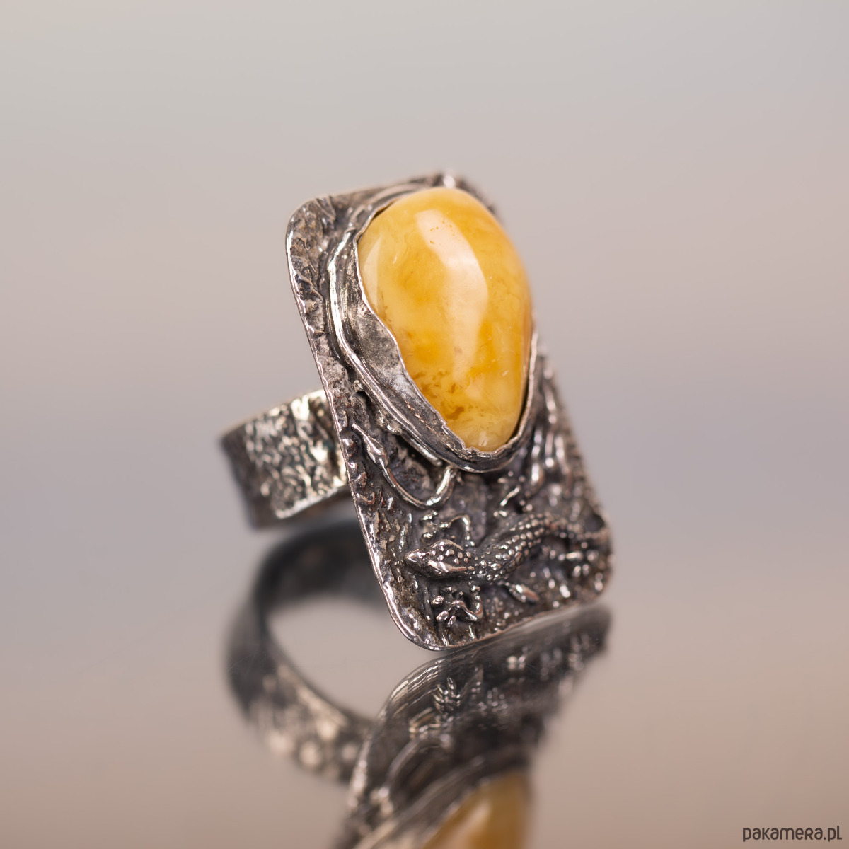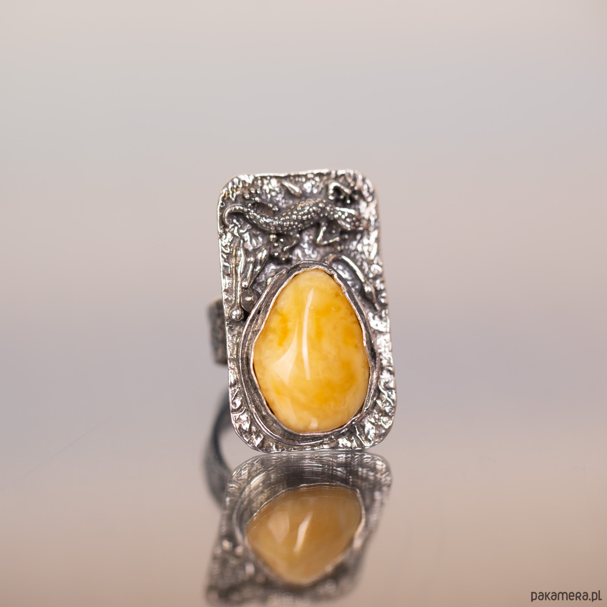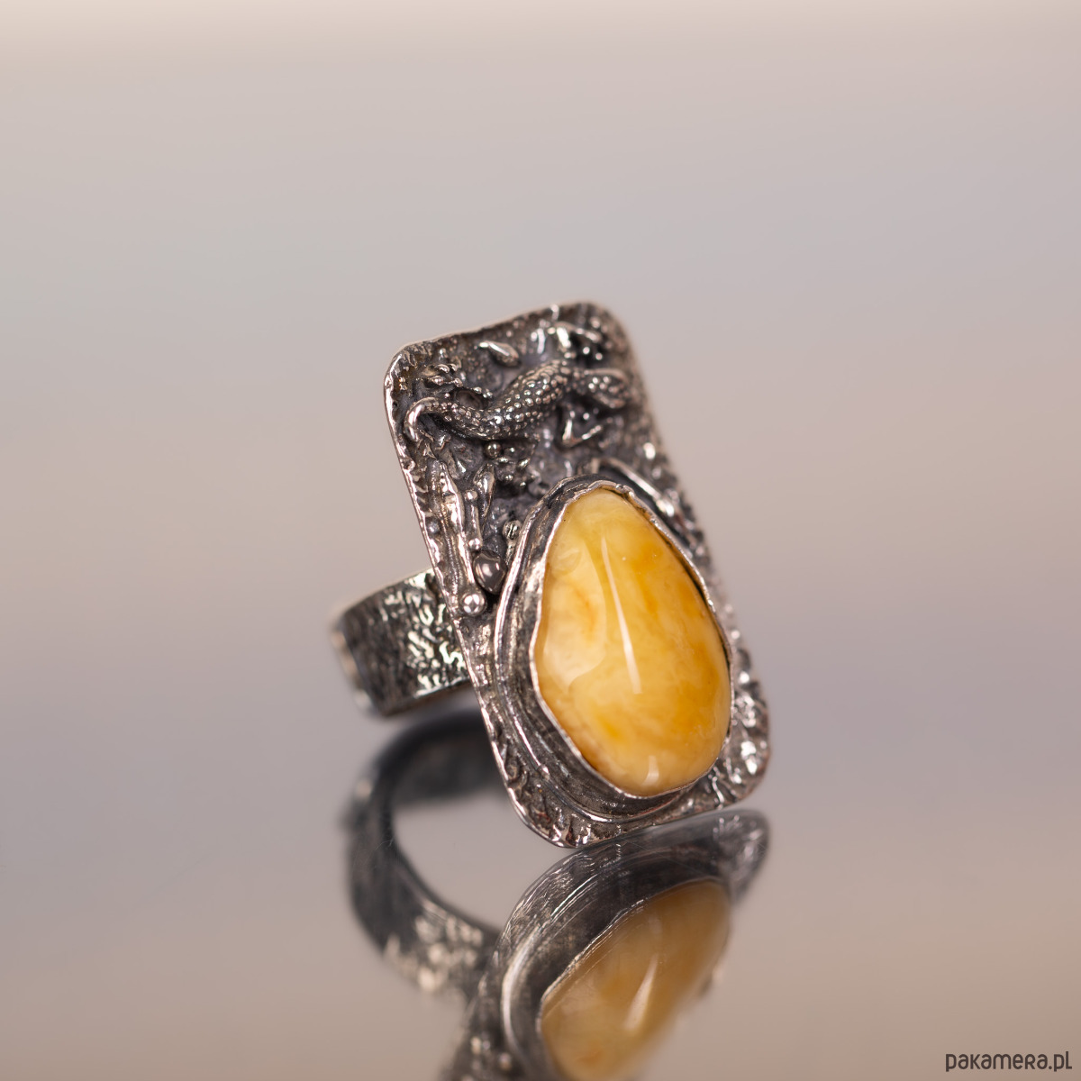 Pierścionek z jaszczurką bursztyn miodowy