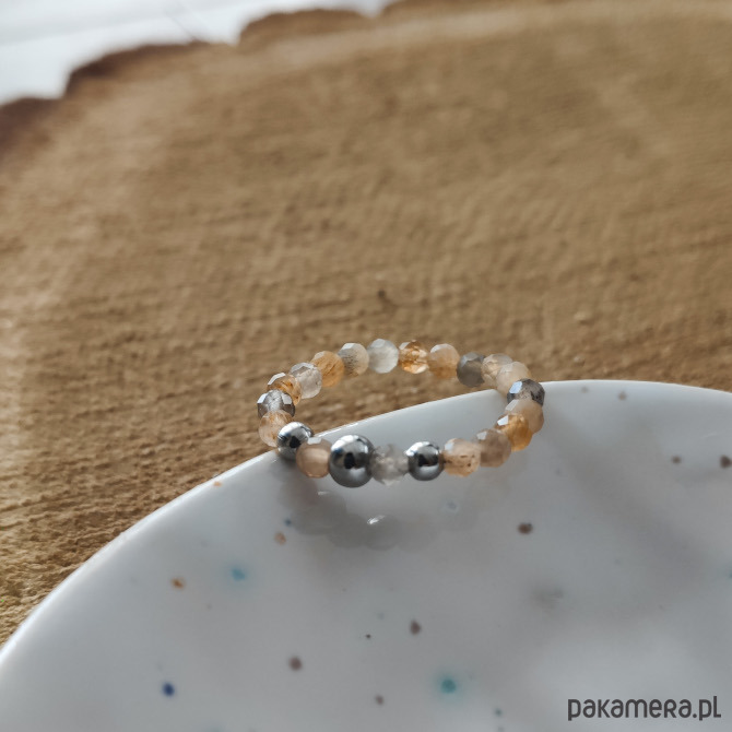 Delikatny, elastyczny pierścionek łączący pastelowe odcienie szarości i pomarańczu. Tę subtelną mozaikę tworzy cieniowany kamień słoneczny, uzupełniony kuleczkami ze stali szlachetnej. Drobne minerały o fasetowym szlifie pięknie odbijają światło, a wewnątrz kamienia można dostrzec drobinki wywołujące efekt migotania. Ten pierścionek jest przepełniony letnią, słoneczną aurą!
