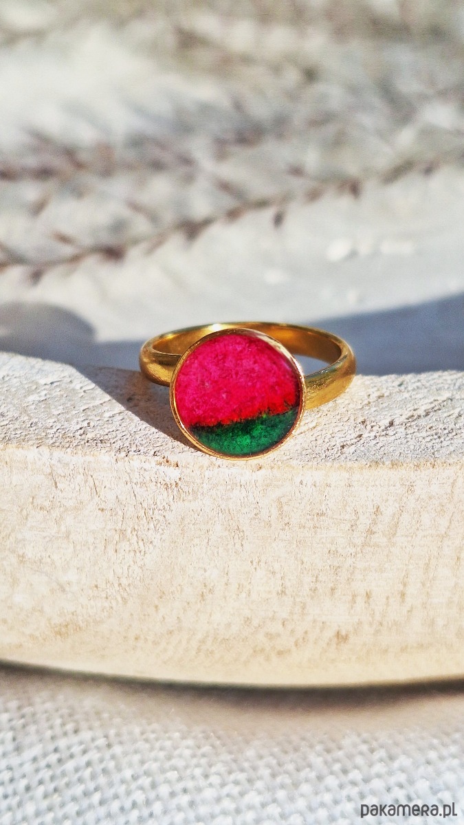 Pierścionek z kolekcji Arbuz został namalowany ręcznie akwarelami. Róże i zielenie świetnie się ze sobą komponują, dodają świeżości i unikatowośći. Pierścionek regulowany ze stali chirurgicznej - to idealne rozwiązanie dla osób ceniących sobie trwałość i uniwersalność. Wykonany z najwyższej jakości stali chirurgicznej, jest odporny na korozję i alergie. Dzięki możliwości regulacji dopasuje się do każdego palca, zapewniając maksymalny komfort noszenia. To doskonały wybór zarówno na co dzień, jak i na specjalne okazje. Całą kolekcję Arbuz wraz z naszyjnikiem, bransoletką i kolczykami znajdziesz w zakładce komplety.