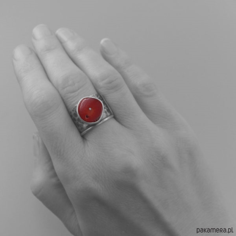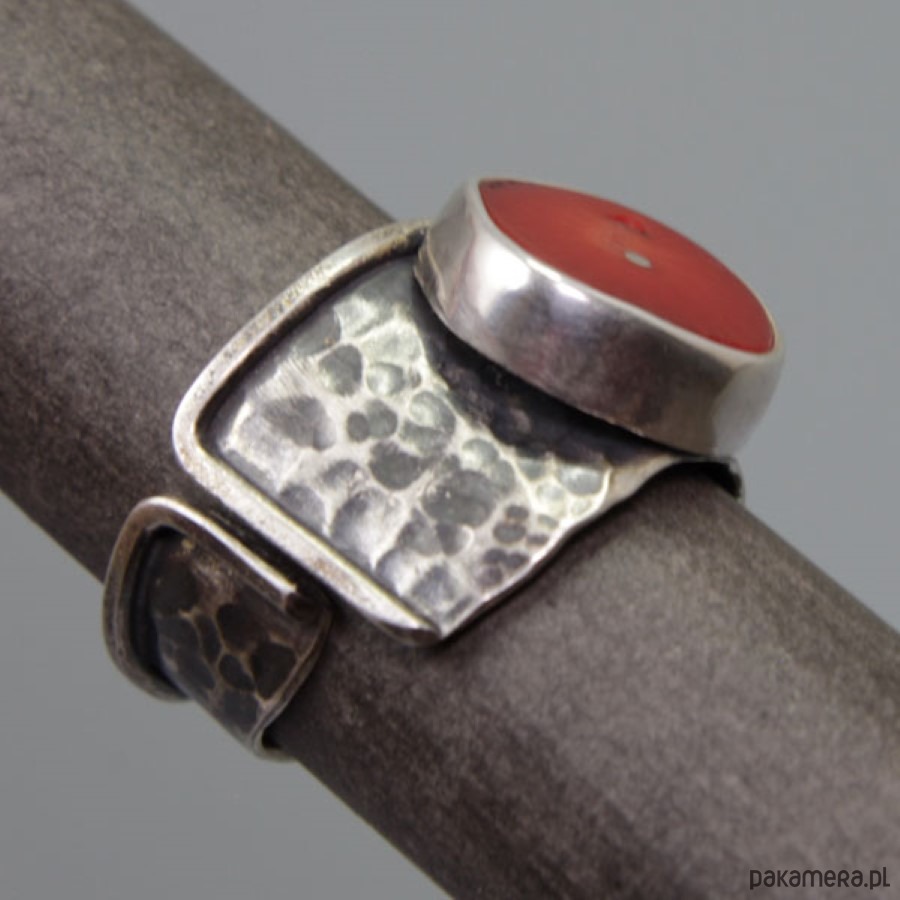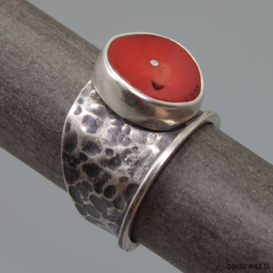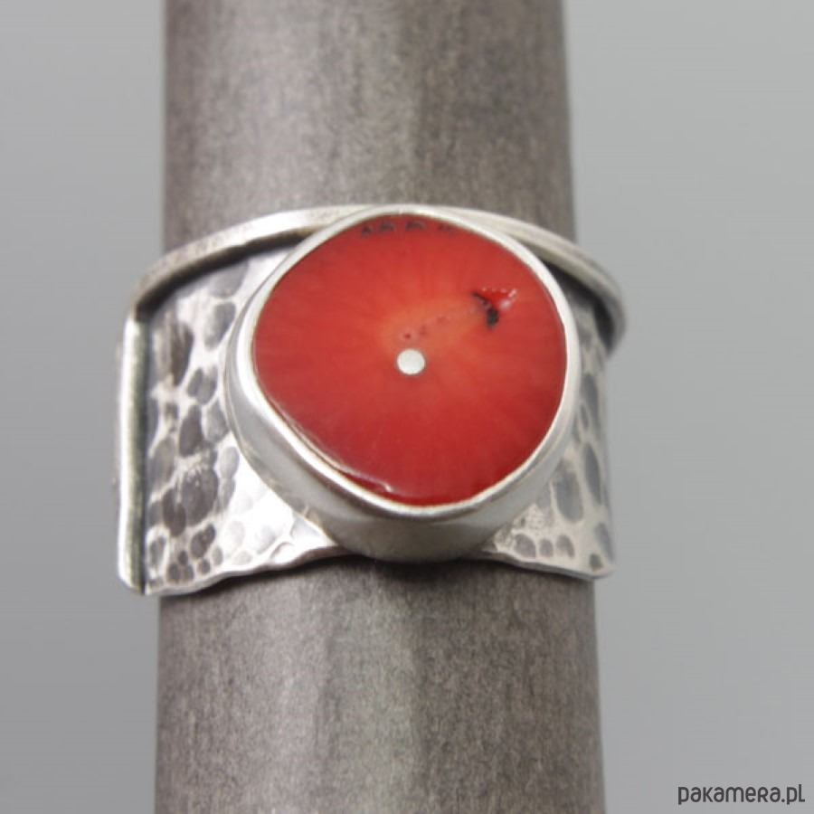 Ręcznie wykonany srebrny pierścionek z koralem. Srebro próby 925 - próba wybita na krawędzi obrączki. Obrączka w najszerszym miejscu: 1,5 cm. Średnica korala: 1,4 cm. Rozmiar obrączki regulowany w zakresie od 15 (średnica wewnętrzna 17,3 mm) do 17 (średnica wewnętrzna 18,0 mm). Waga pierścionka: 6,9 g.