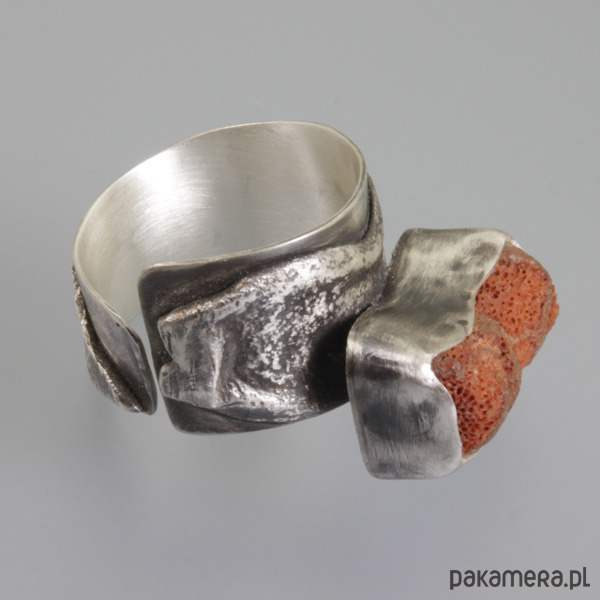 Ręcznie wykonany srebrny pierścionek z koralem. Srebro próby 925 - próba wybita na spodzie korony pierścionka. Obrączka w najszerszym miejscu: 1,5 cm; wymiary korala: 1,9 cm x 1,1 cm. Rozmiar obrączki regulowany w zakresie od 23 (średnica wewnętrzna 20,0 mm) do 26 (średnica wewnętrzna 21,0 mm). Waga pierścionka: 13,4 g.