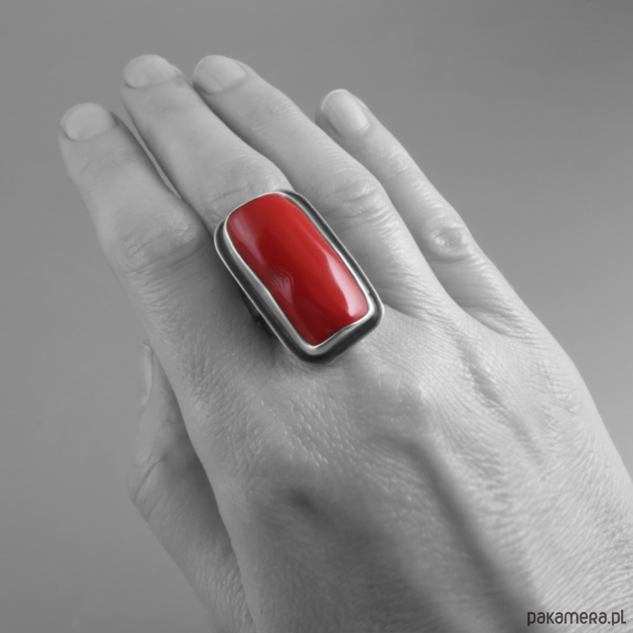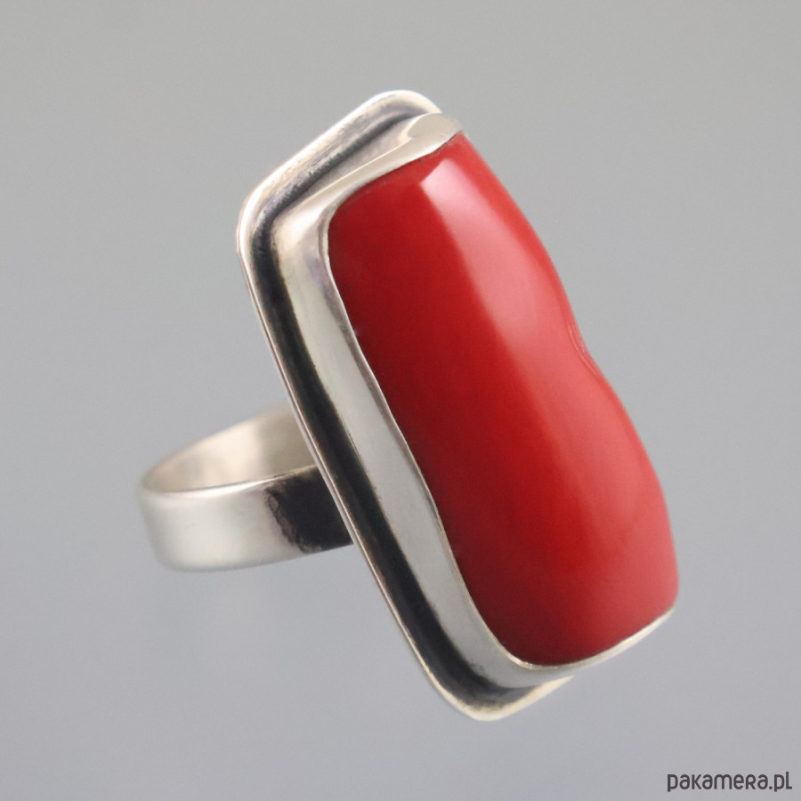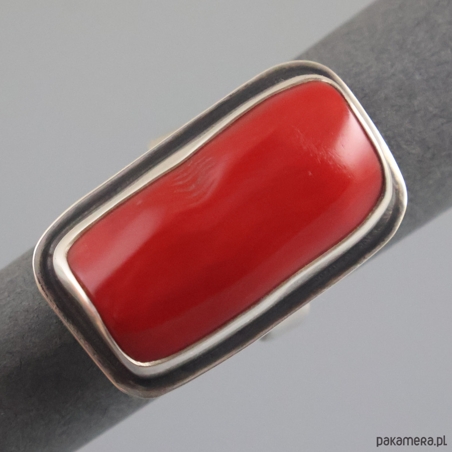Ręcznie wykonany duży srebrny pierścionek z koralem. Srebro próby 925 - próba wybita na spodzie obrączki. Wymiary korony pierścionka: 3,3 cm x 2,0 cm. Wymiary korala: 2,8 cm x 1,6 cm. Rozmiar obrączki regulowany, rozmiar wyjściowy: 18 (średnica wewnętrzna 18,3 mm). Waga pierścionka: 14,8 g.