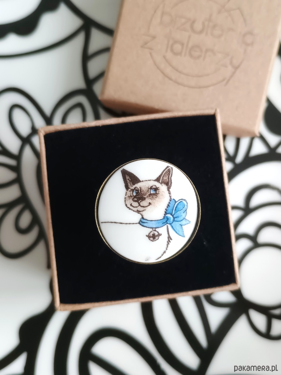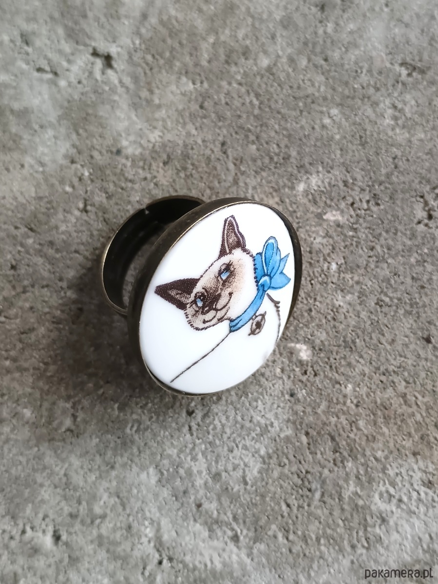 Oto pierścionek, który wykonałam z fragmentu stłuczonego kubka w koty. Kawałek stłuczki oszlifowałam w okrągły kształt i połączyłam z metalową bazą w kolorze mosiądzu. Baza jest regulowana - będzie pasowała na każdy rozmiar. Ceramikę zeszlifowałam również z grubości - jest cieńsza niż pierwotnie, dzięki czemu pierścionek nie jest ciężki. Brzegi pokryłam lakierem, co sprawia, że nie brudzą się i nie chłoną wilgoci. Średnica elementu ceramicznego: 26 mm. Unikat - każdy z moich wyrobów występuje w jednym egzemplarzu. Upcykling - nie reprodukuję wykorzystywanych wzorów, niczego nie domalowuję - wykorzystuję wyłącznie oryginalne naczynia i motywy, które się na nich znajdują. Tym samym, stłuczce z odzysku nadaję nowe życie.