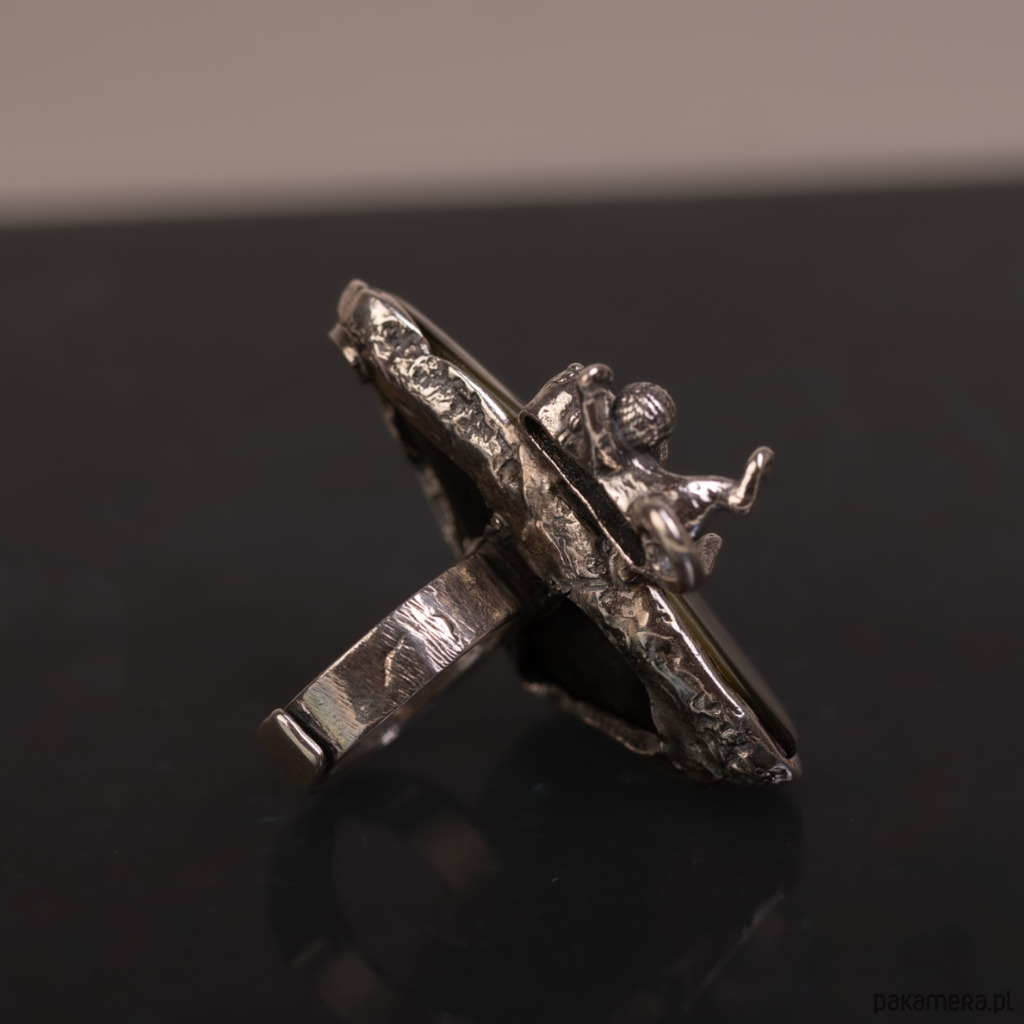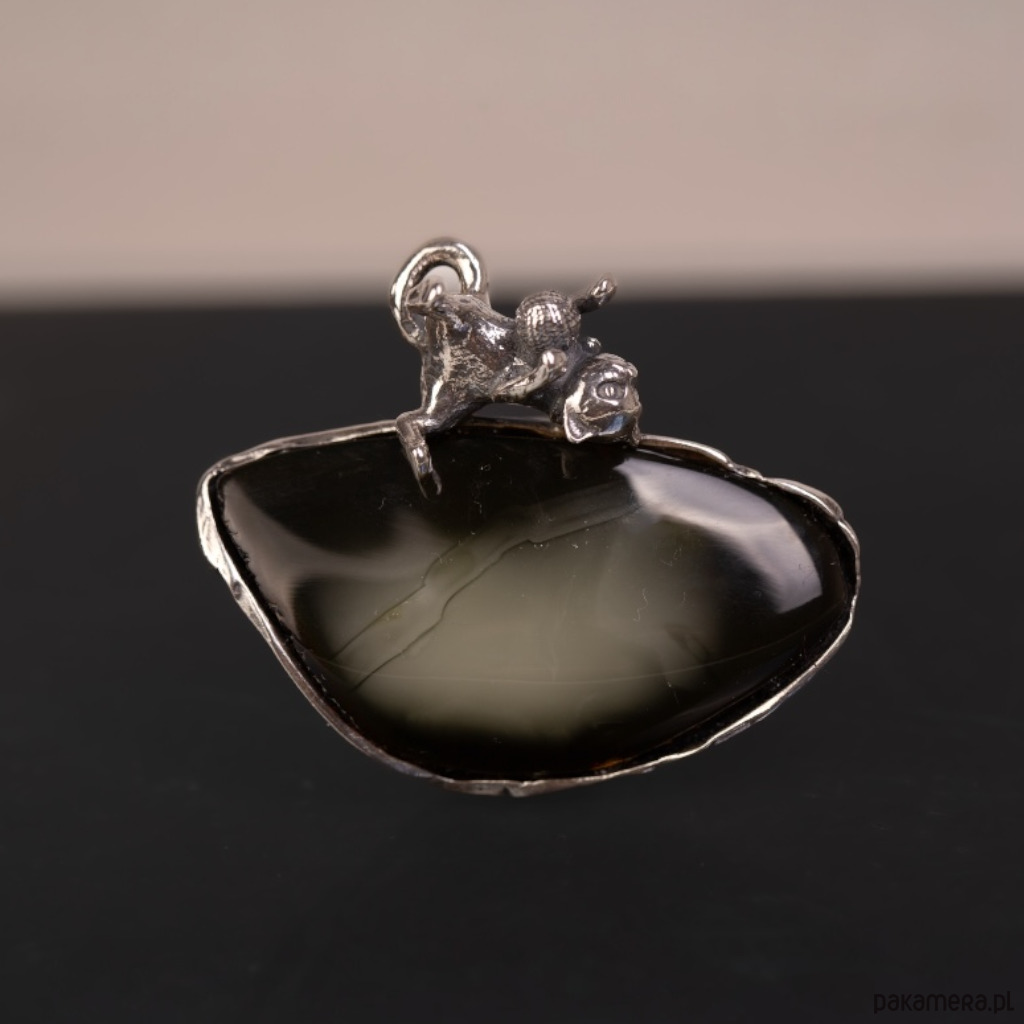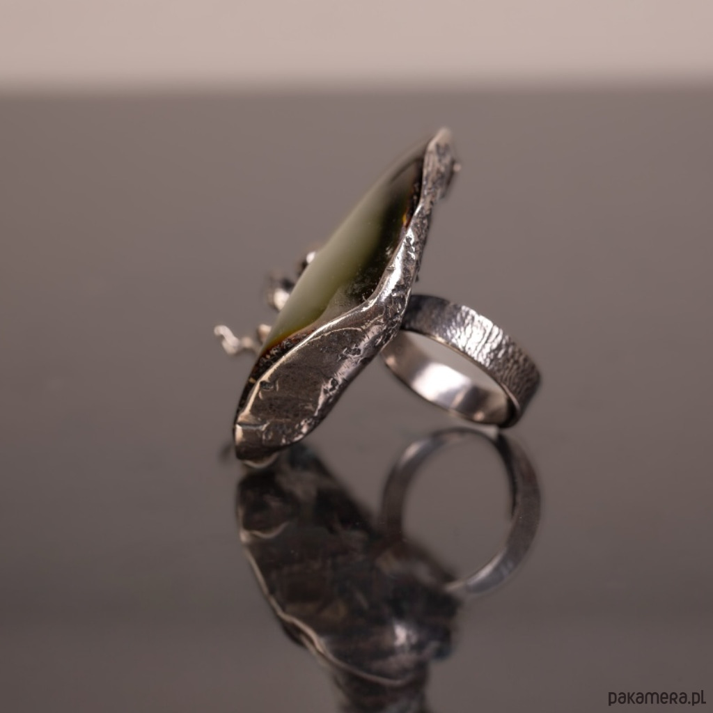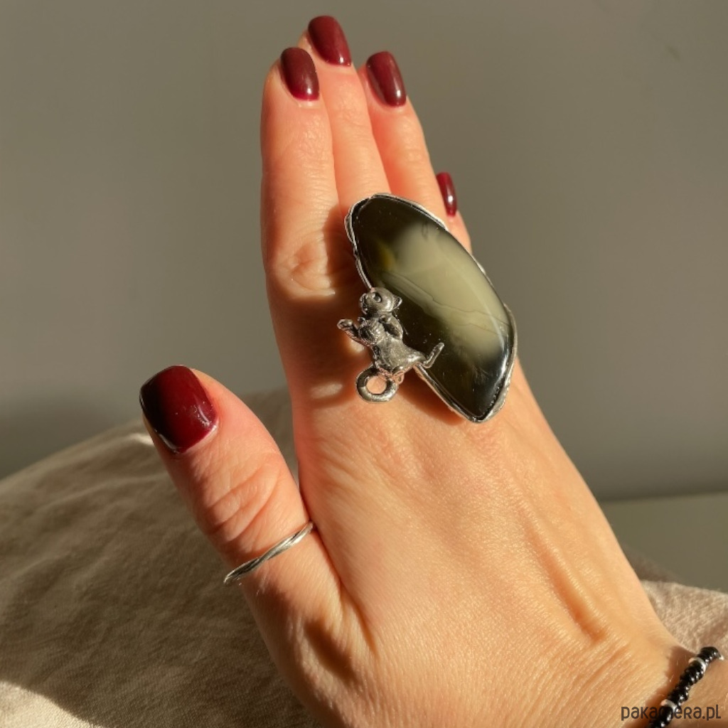 Pierścionek ręcznie wykonany ze srebra z dużym bursztynem o głębokiej, ciemnej barwie, przypominającej nocne niebo. Na krawędzi kamienia bawi się mały srebrny kotek z kłębkiem – dopracowany w detalach, dodaje całości lekkości i odrobiny humoru. Masywny, wyrazisty pierścień świetnie prezentuje się na dłoni, a regulowana obrączka pozwala wygodnie dopasować go do różnych rozmiarów.