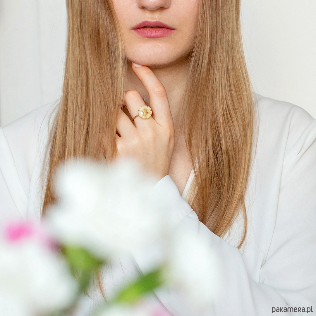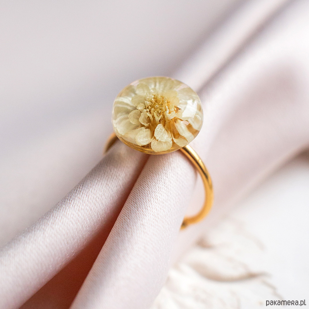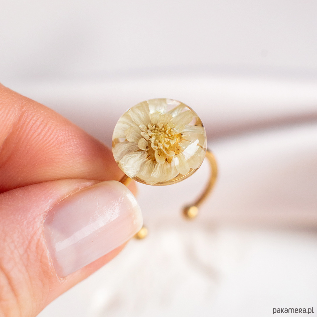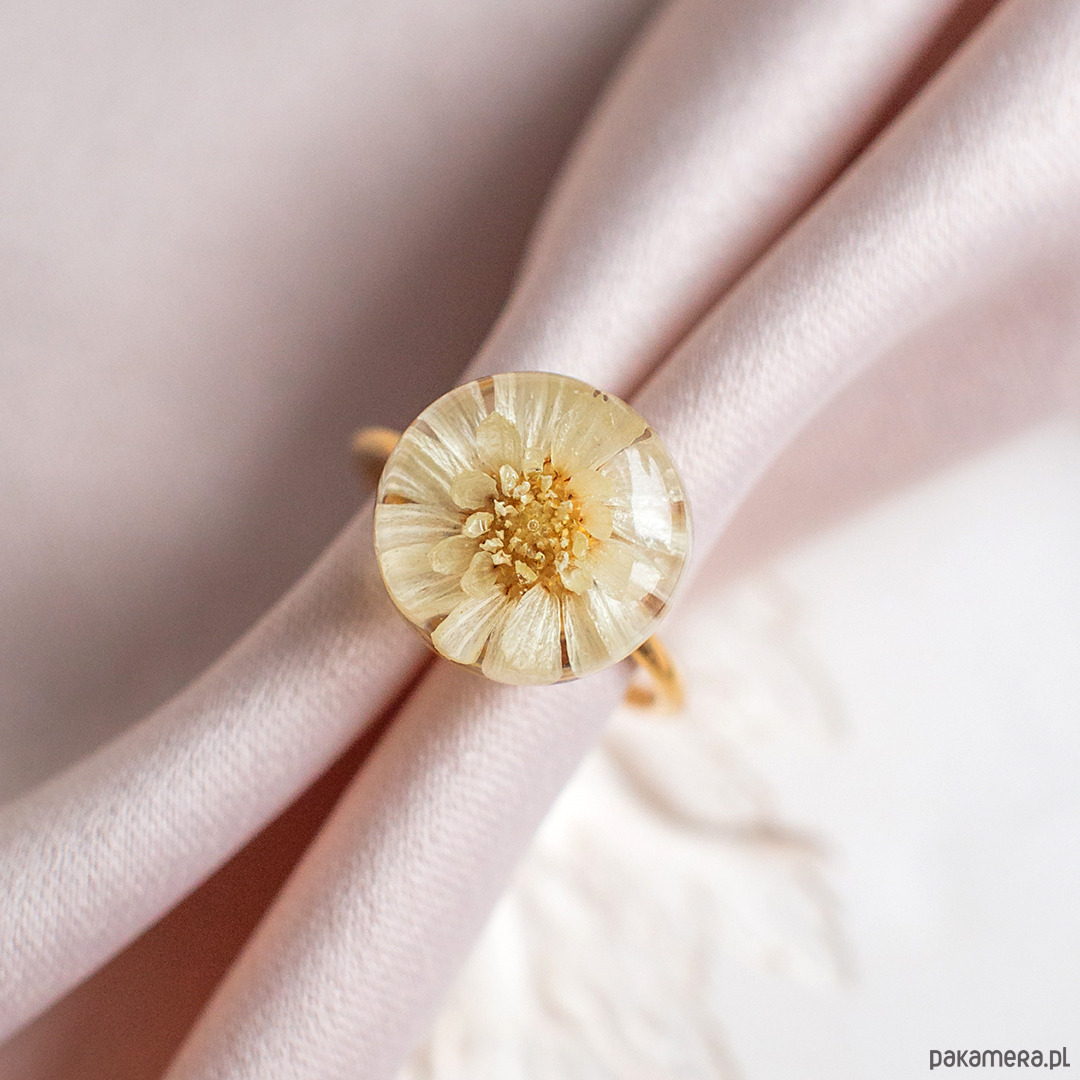 Pierścionek wykonany jest z żywicy epoksydowej z wykorzystaniem suszonych kwiatów. Metalowe elementy to stal nierdzewna szlachetna chirurgiczna.