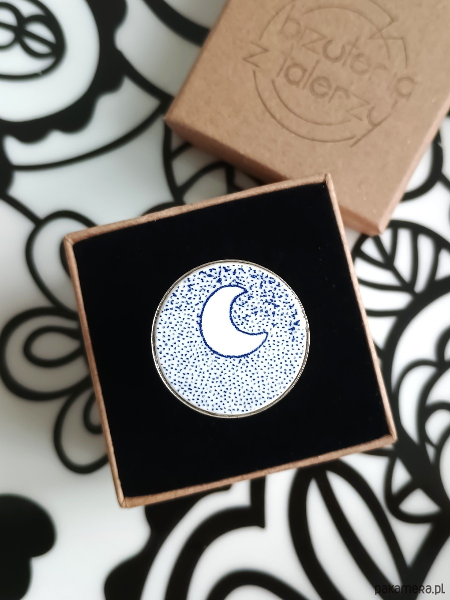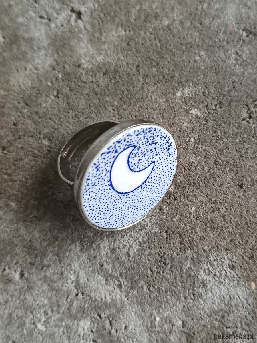 Oto pierścionek, który wykonałam z fragmentu stłuczonego talerza fajansowego z motywem zimowego pejzażu. Kawałek stłuczki oszlifowałam w okrągły kształt i połączyłam z metalową bazą w kolorze srebrnym. Baza jest regulowana - będzie pasowała na każdy rozmiar. Ceramikę zeszlifowałam również z grubości - jest cieńsza niż pierwotnie, dzięki czemu pierścionek nie jest ciężki. Brzegi pokryłam lakierem, co sprawia, że nie brudzą się i nie chłoną wilgoci. Średnica elementu ceramicznego: 26 mm. Unikat - każdy z moich wyrobów występuje w jednym egzemplarzu. Upcykling - nie reprodukuję wykorzystywanych wzorów, niczego nie domalowuję - wykorzystuję wyłącznie oryginalne naczynia i motywy, które się na nich znajdują. Tym samym, stłuczce z odzysku nadaję nowe życie.