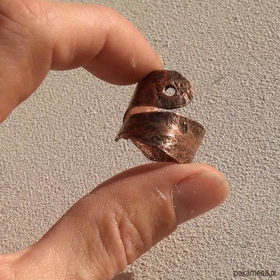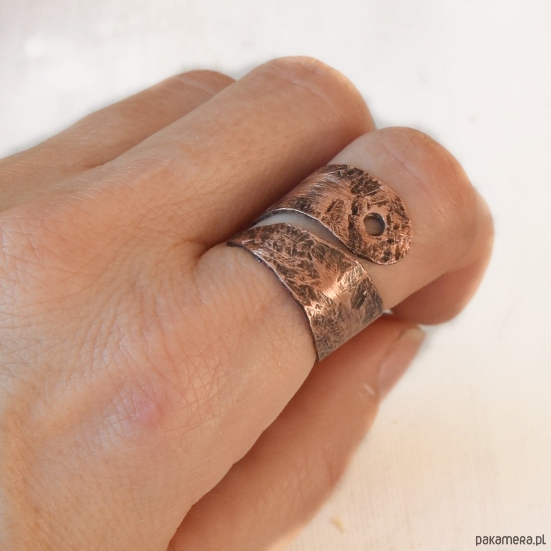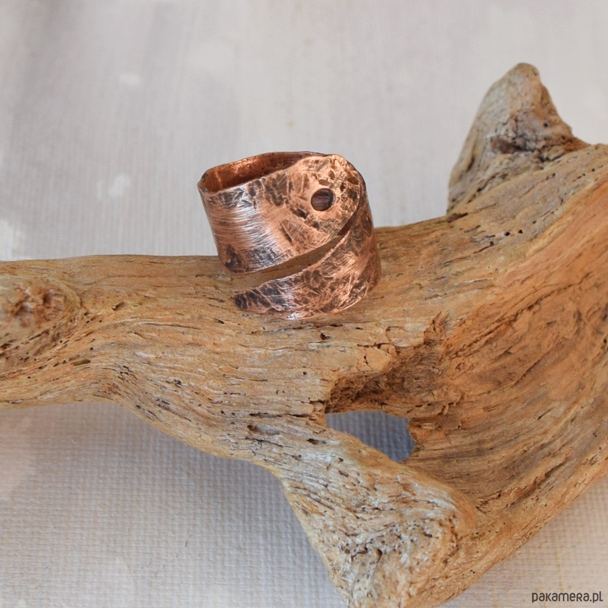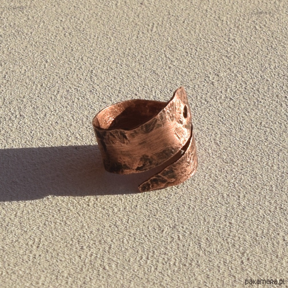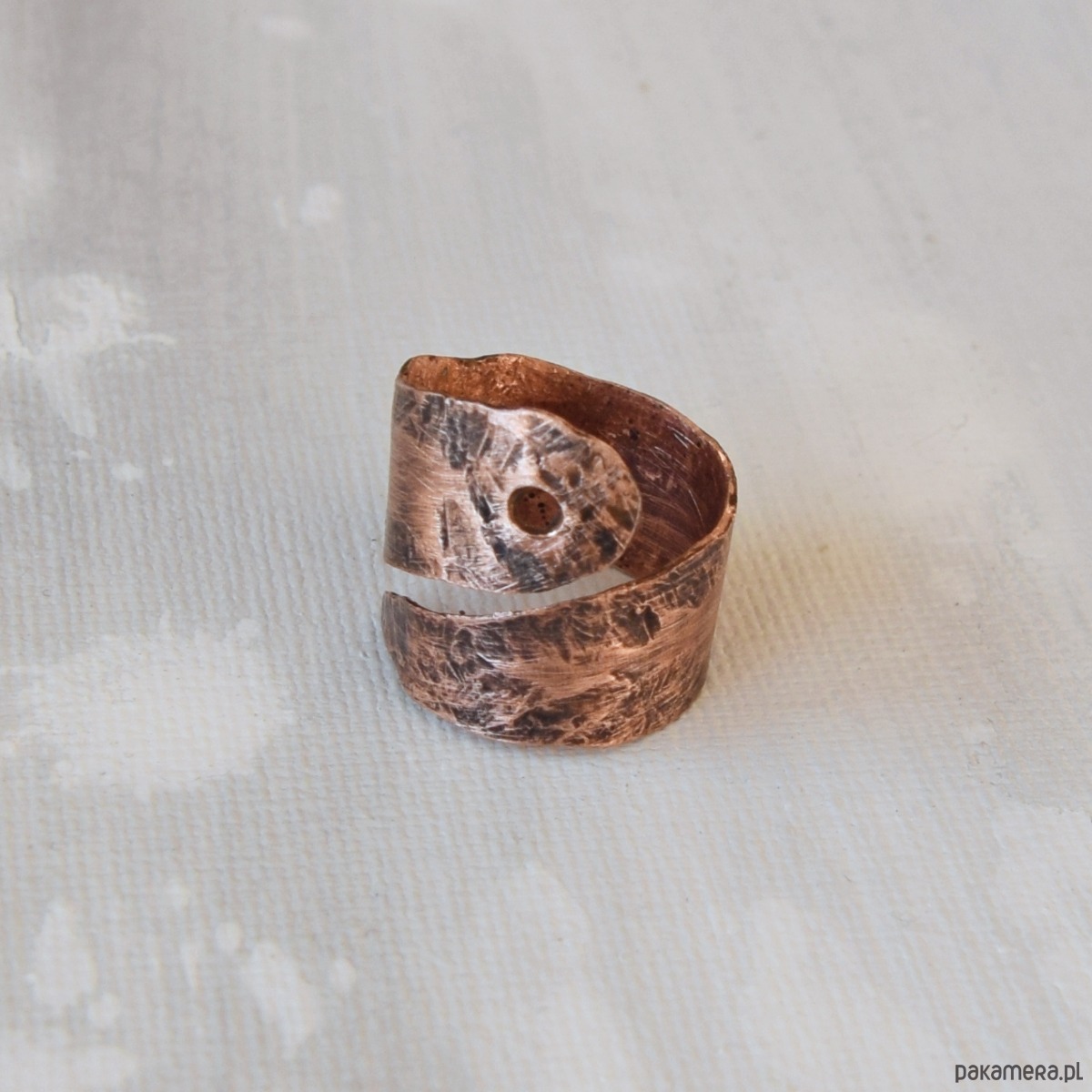 Pierścionek wykonany z ręcznie kutej, oksydowanej miedzi, częściowo przecieranej papierem ściernym, o surowym charakterze stylizowanym na stary, "wykopaliskowy" metal. Średnica ok. 19 mm. Szerokość 10-20 mm.