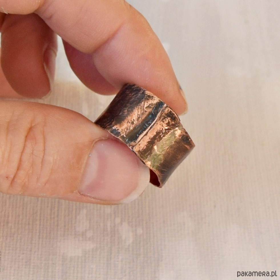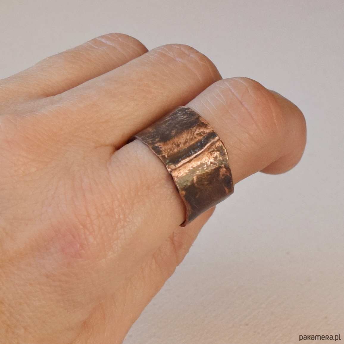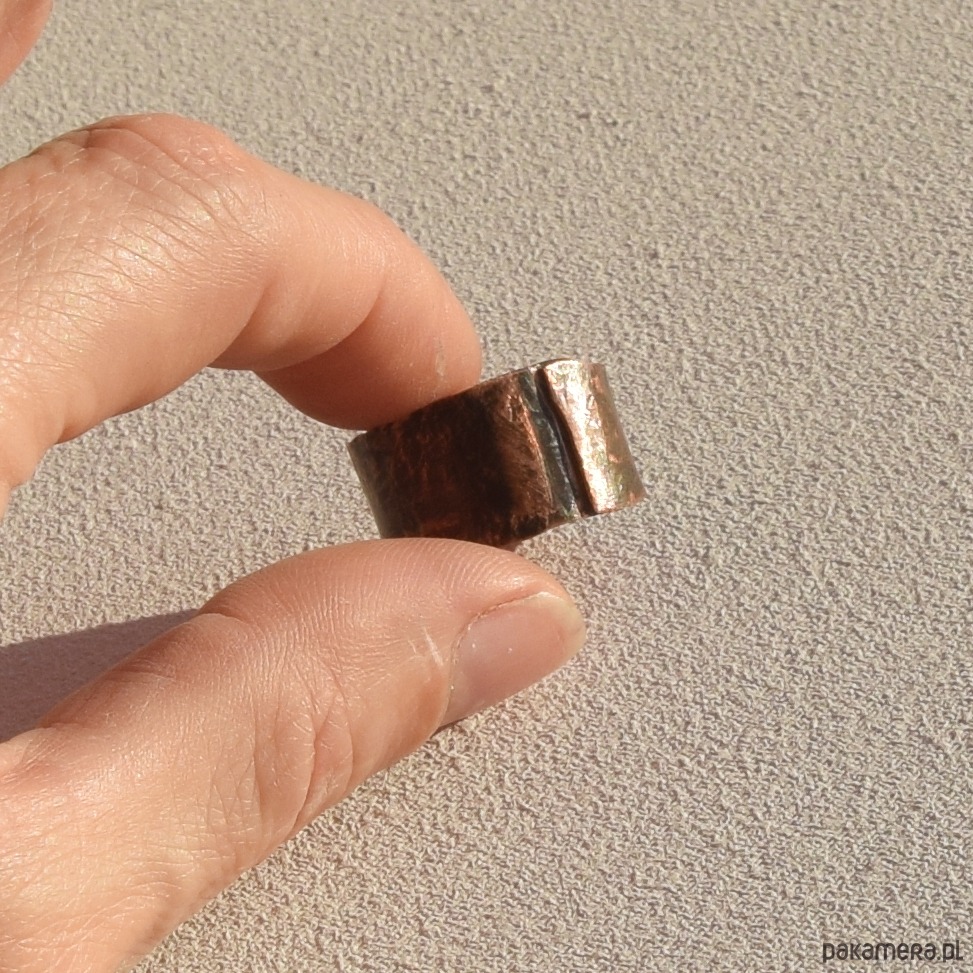 Pierścionek wykonany z ręcznie kutej, oksydowanej miedzi, częściowo przecieranej papierem ściernym, o surowym charakterze stylizowanym na stary, "wykopaliskowy" metal. Średnica ok. 19 mm. Szerokość 12 mm.