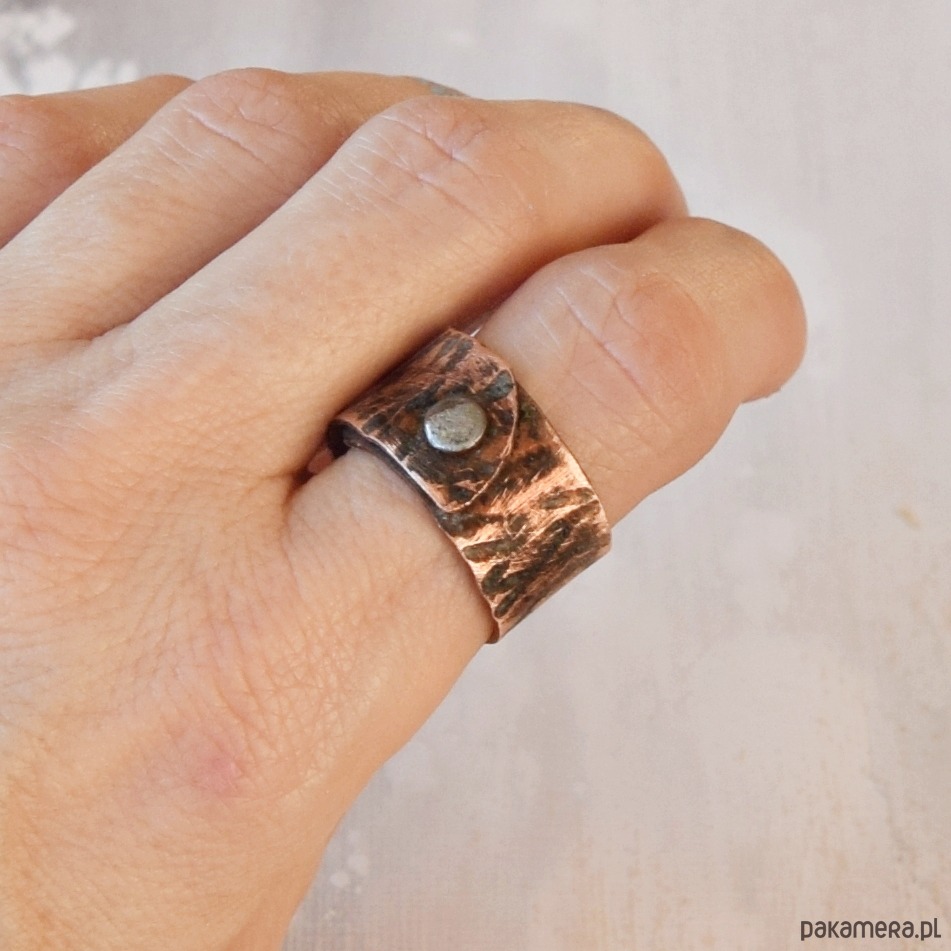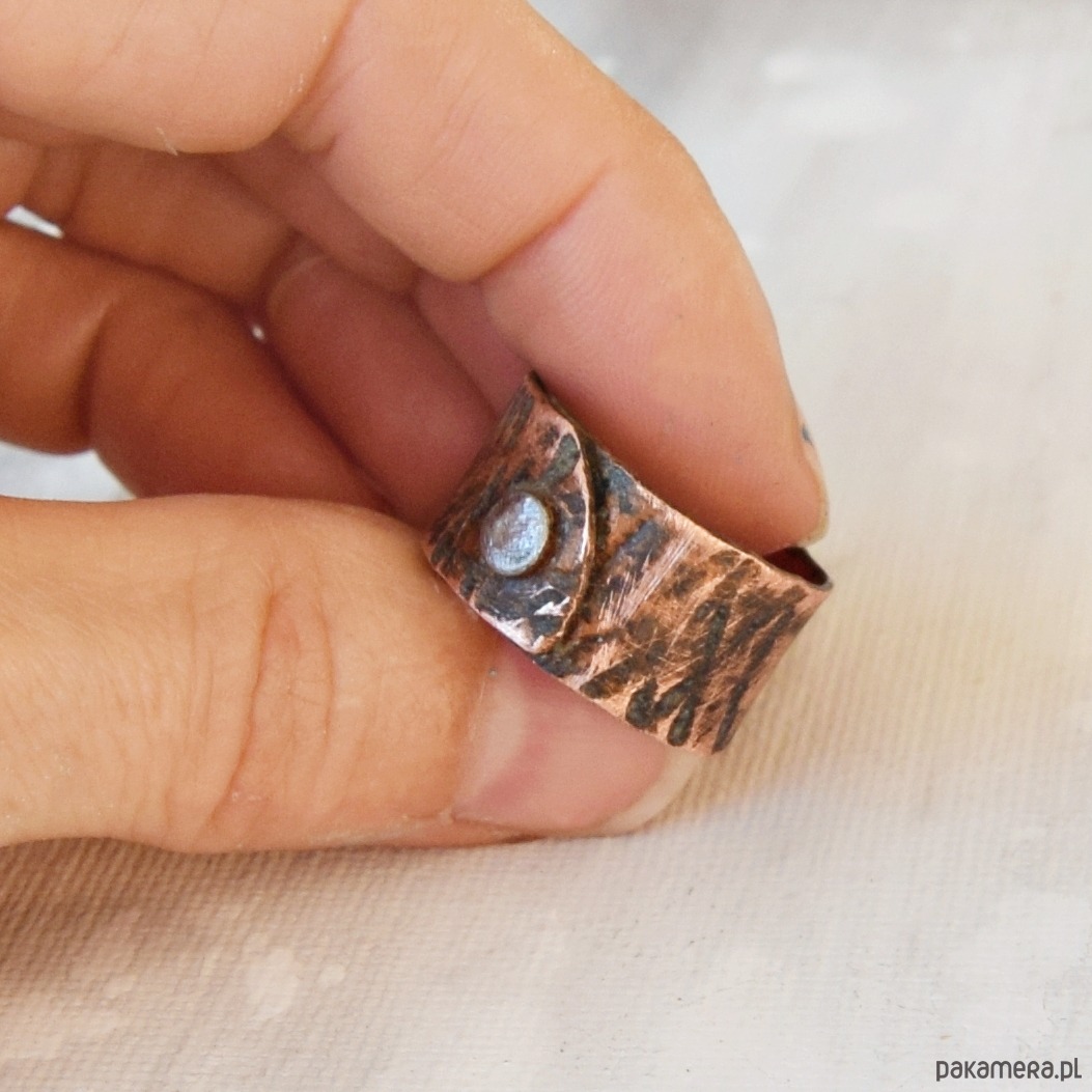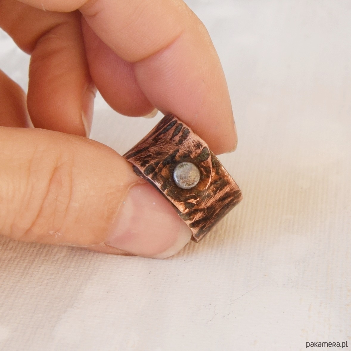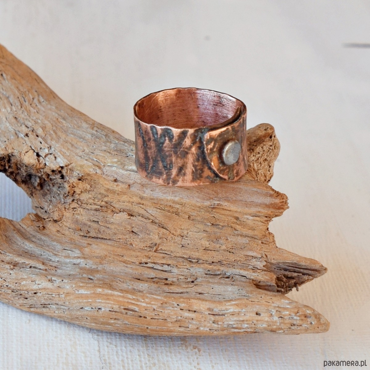 Pierścionek wykonany z ręcznie kutej, oksydowanej miedzi, częściowo przecieranej papierem ściernym, o surowym charakterze stylizowanym na stary, "wykopaliskowy" metal. Średnica ok. 20 mm. Szerokość ok. 12 mm.