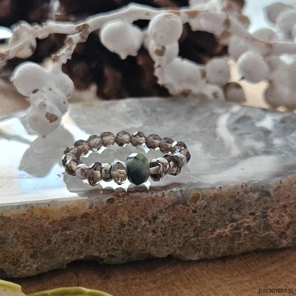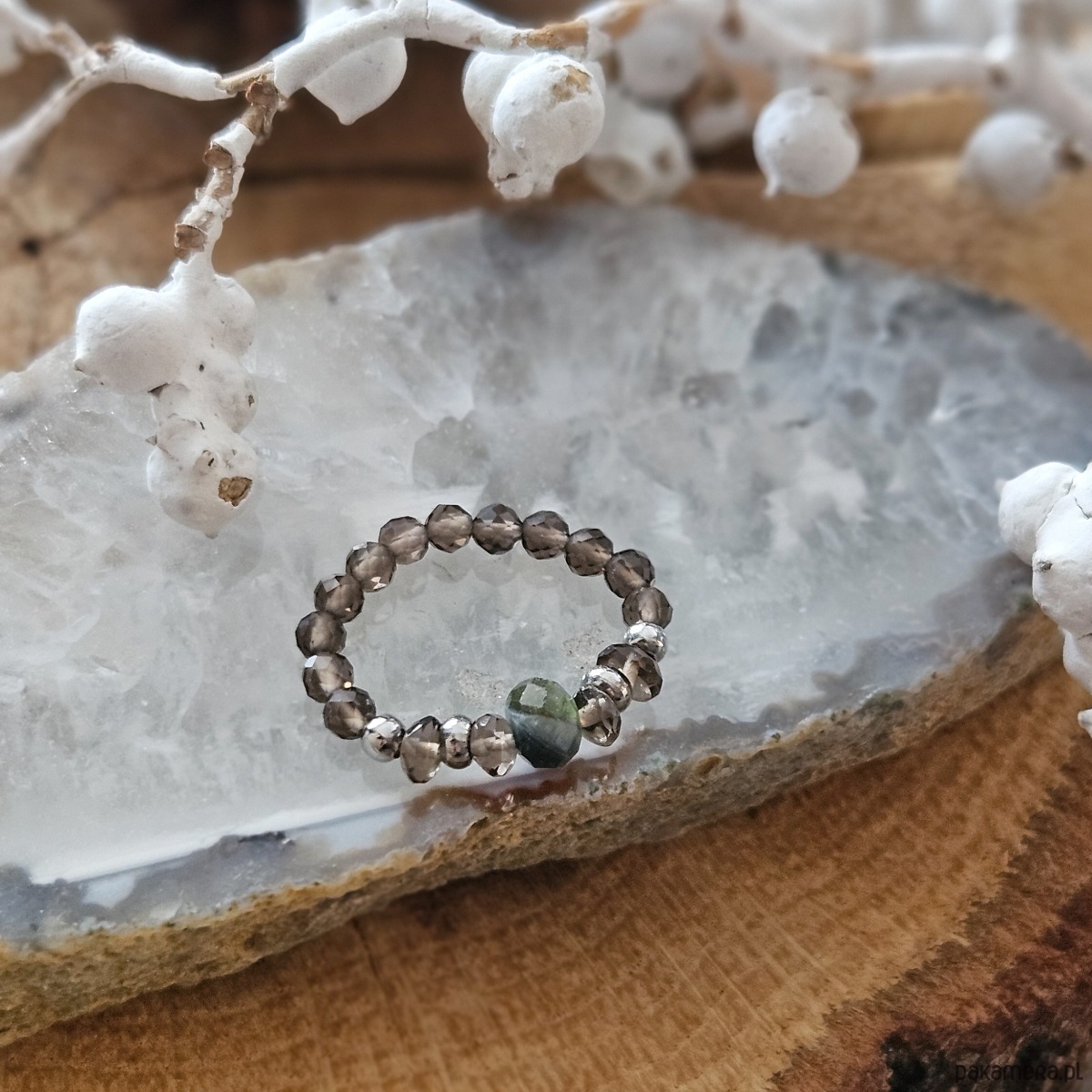 Pierścionek dotrze do Ciebie w eleganckim pudełeczku przewiązanym wstążką, w którym znajdziesz także bilecik z informacją o zastosowanych minerałach i ich właściwościach.