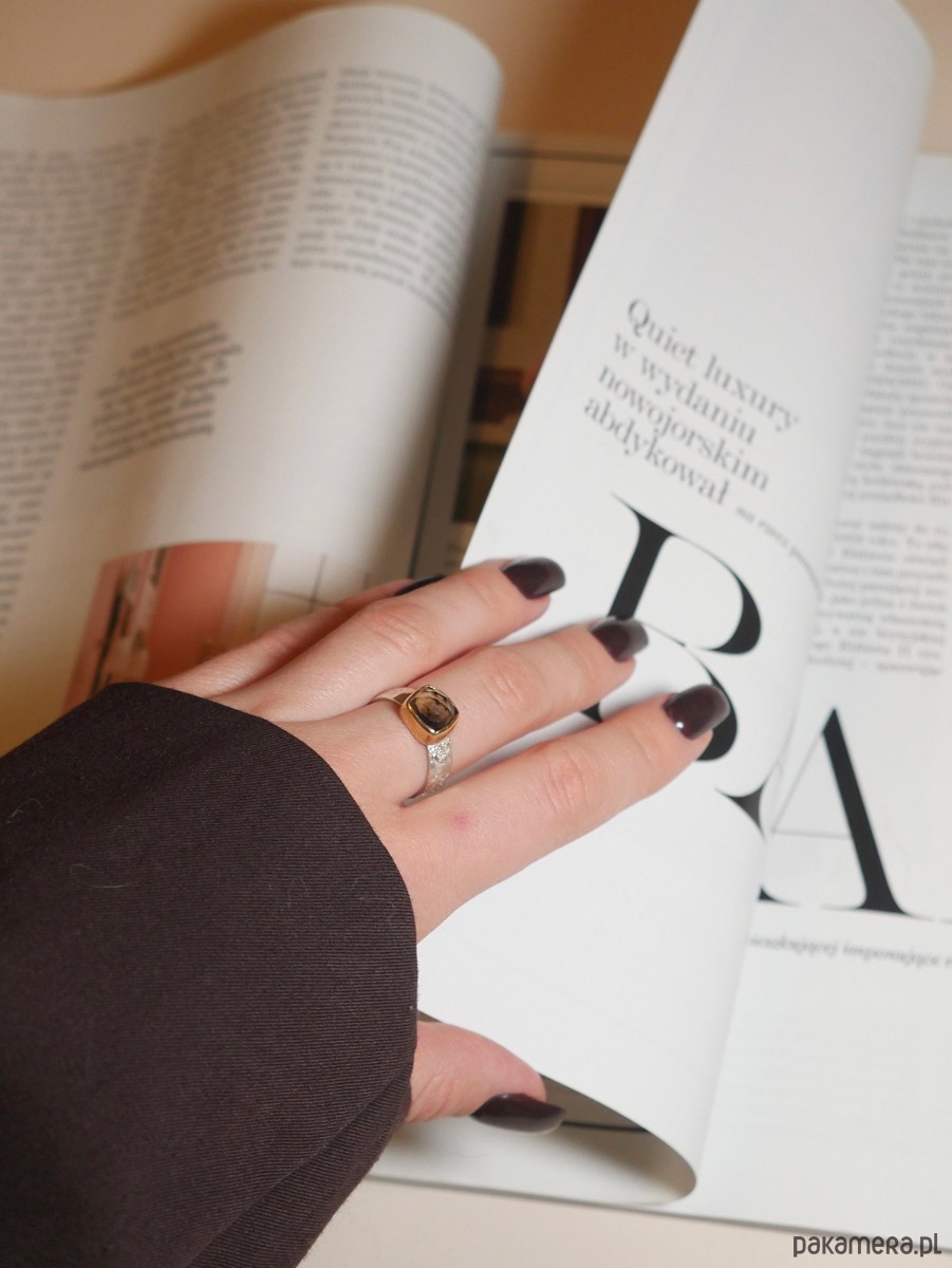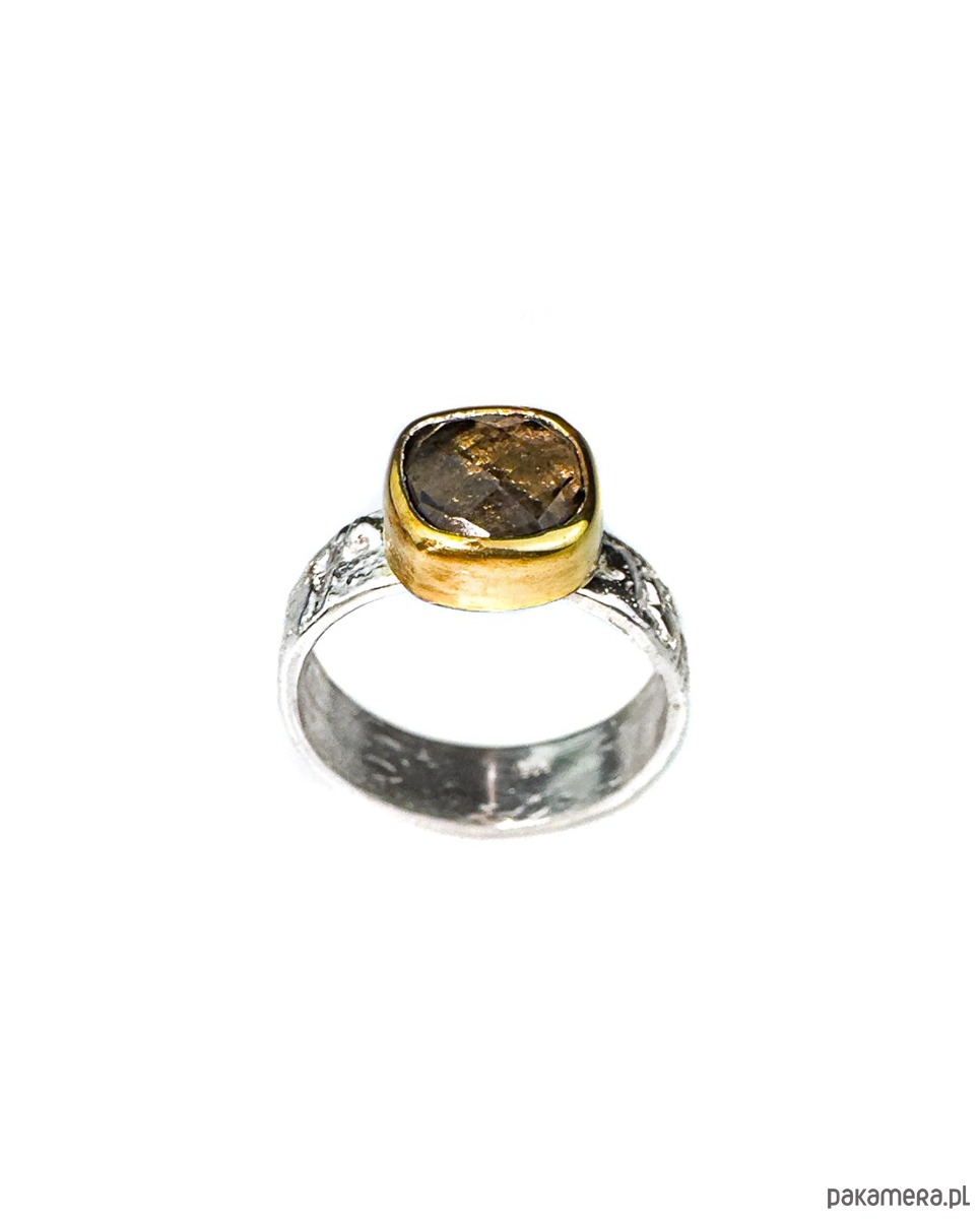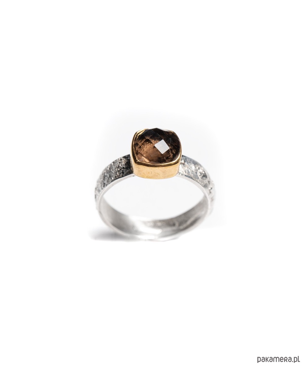 Pierścionek wykonany ręcznie. Fasetowany kwarc dymny, został osadzony w złoconej oprawie na szerokiej, lekko pękatej obrączce o fakturowanej powierzchni. Srebro pr. 925. Oprawa kamienia złocona 24k złotem.
