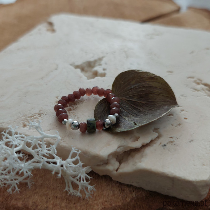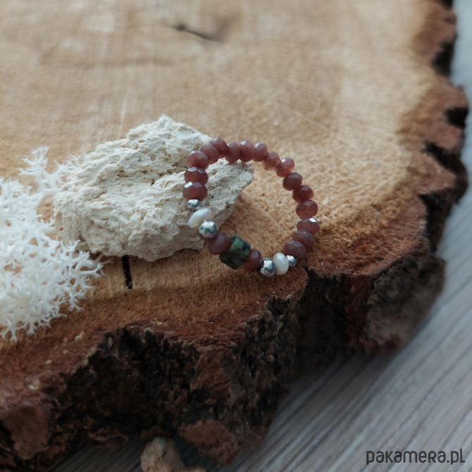 Pierścionek z kolekcji Earth, który łączy w sobie barwy ziemi, rozświetlone bielą drobnych połyskujących perełek. Podstawę pierścionka stanowią brązowe jadeity w formie fasetowanej oponki, a pomiędzy nimi osadzony został turkus afrykański w kształcie gładkiego walca. Kamienie uzupełnione są ozdobnymi elementami ze stali szlachetnej. Połączenie minerałów i pereł to must have już od kilku sezonów - uzupełni elegancką stylizację, ale świetnie podkręci także casualowy look!