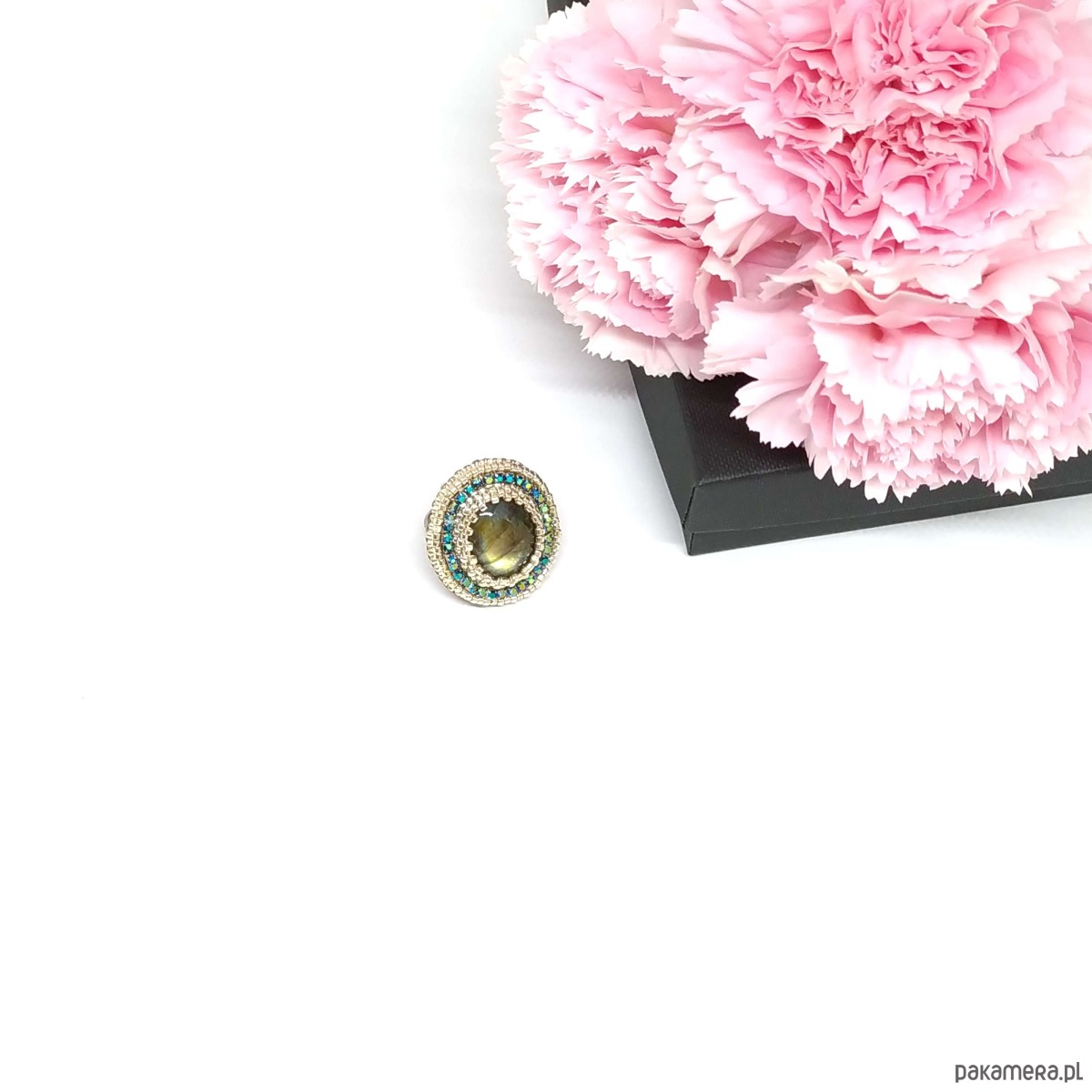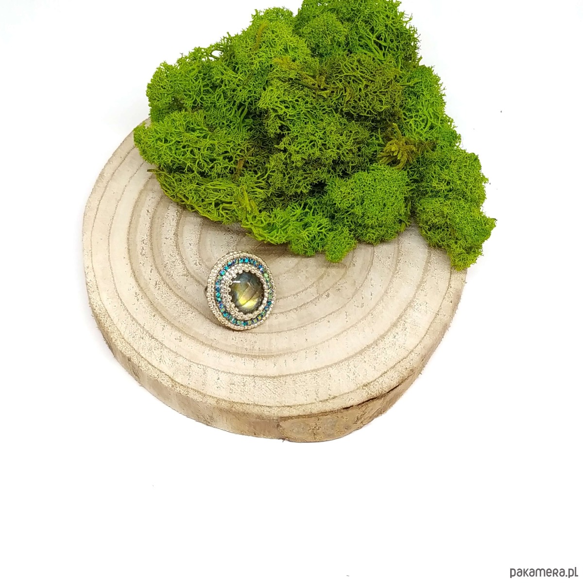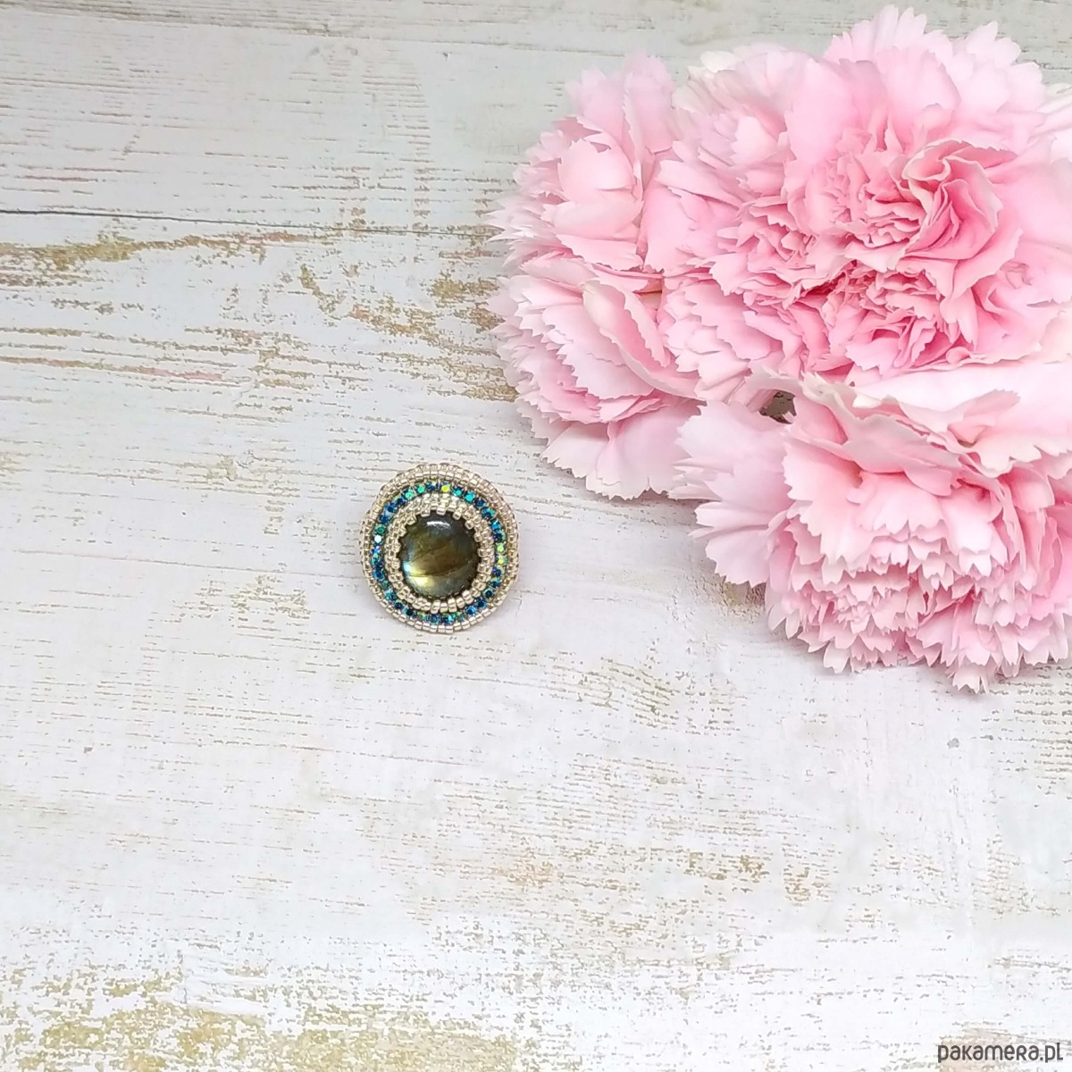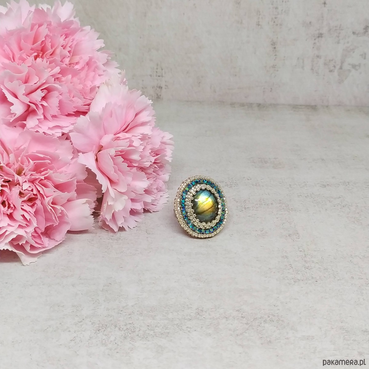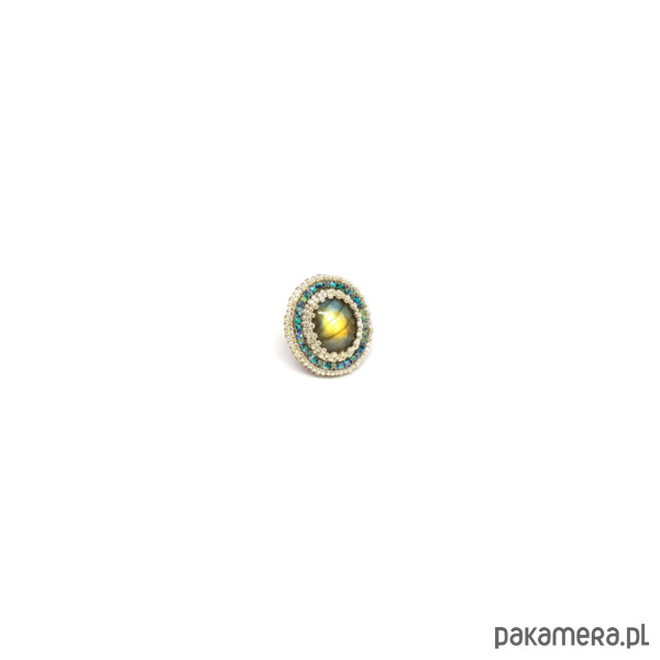 Cudowny labradoryt otulony został srebrzystymi koralikami w odcieniu aluminium. Blasku i tajemniczości dodają mu maleńkie kryształki. Całość umocowana na regulowanej obrączce ze stali chirurgicznej i wykończona brązowym zamszem.