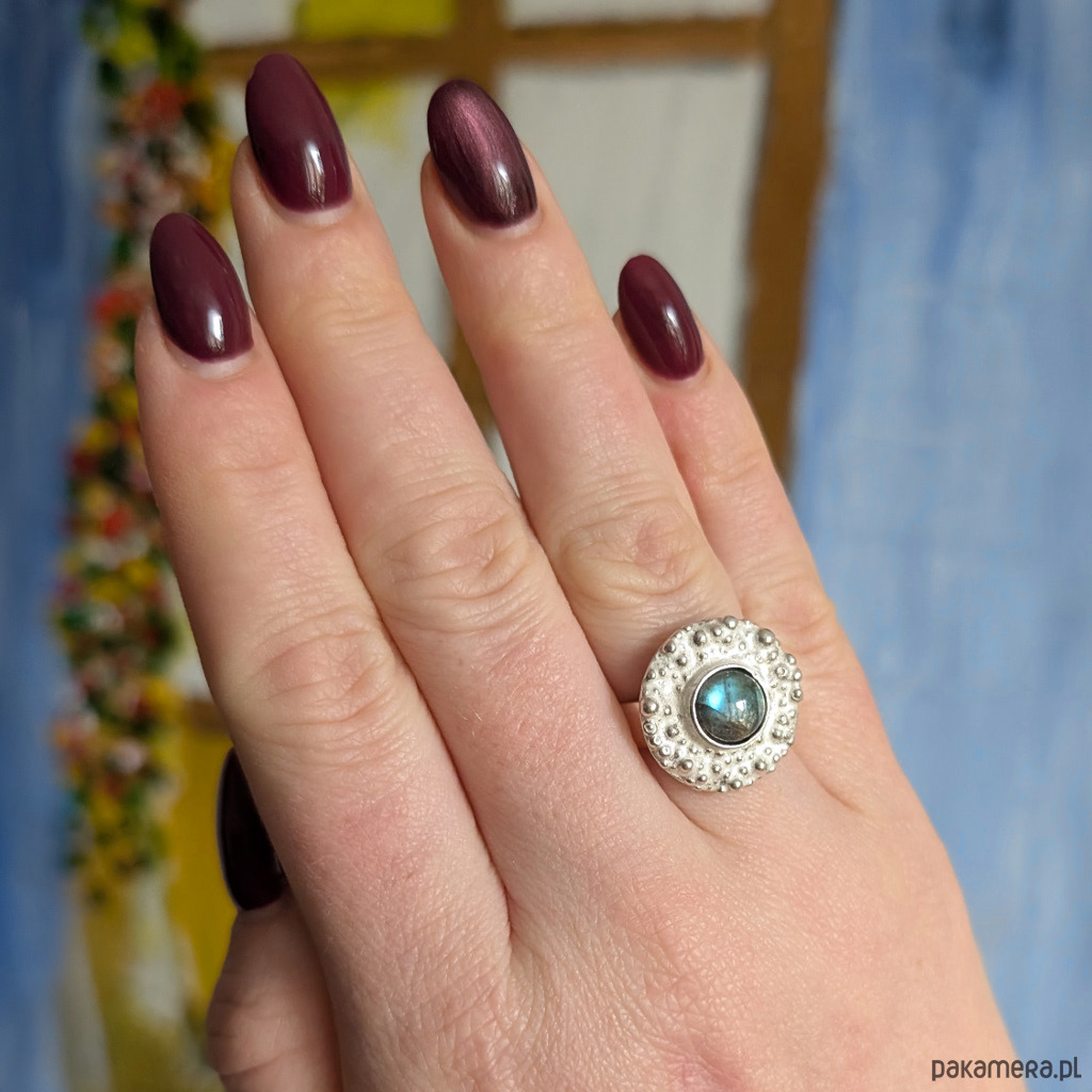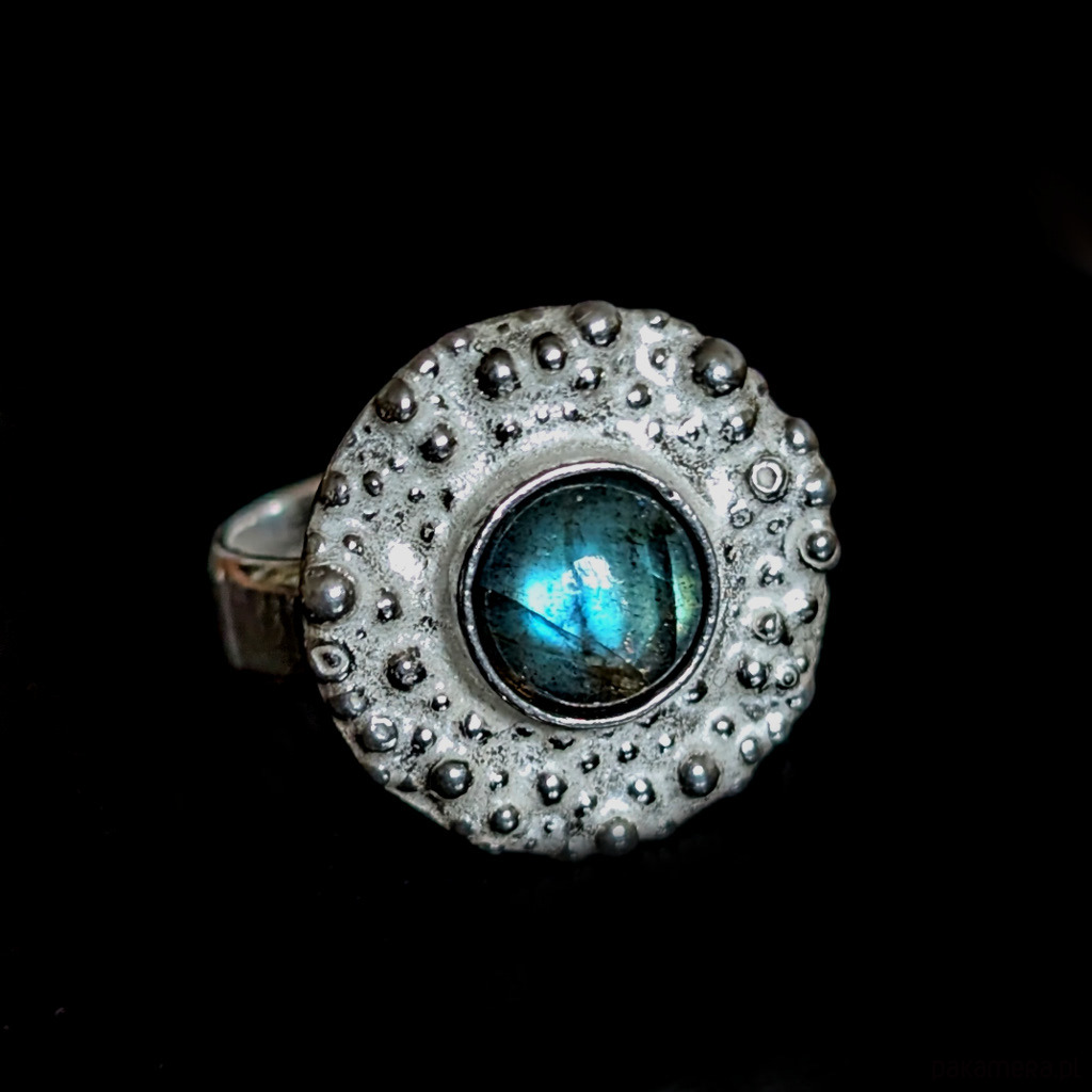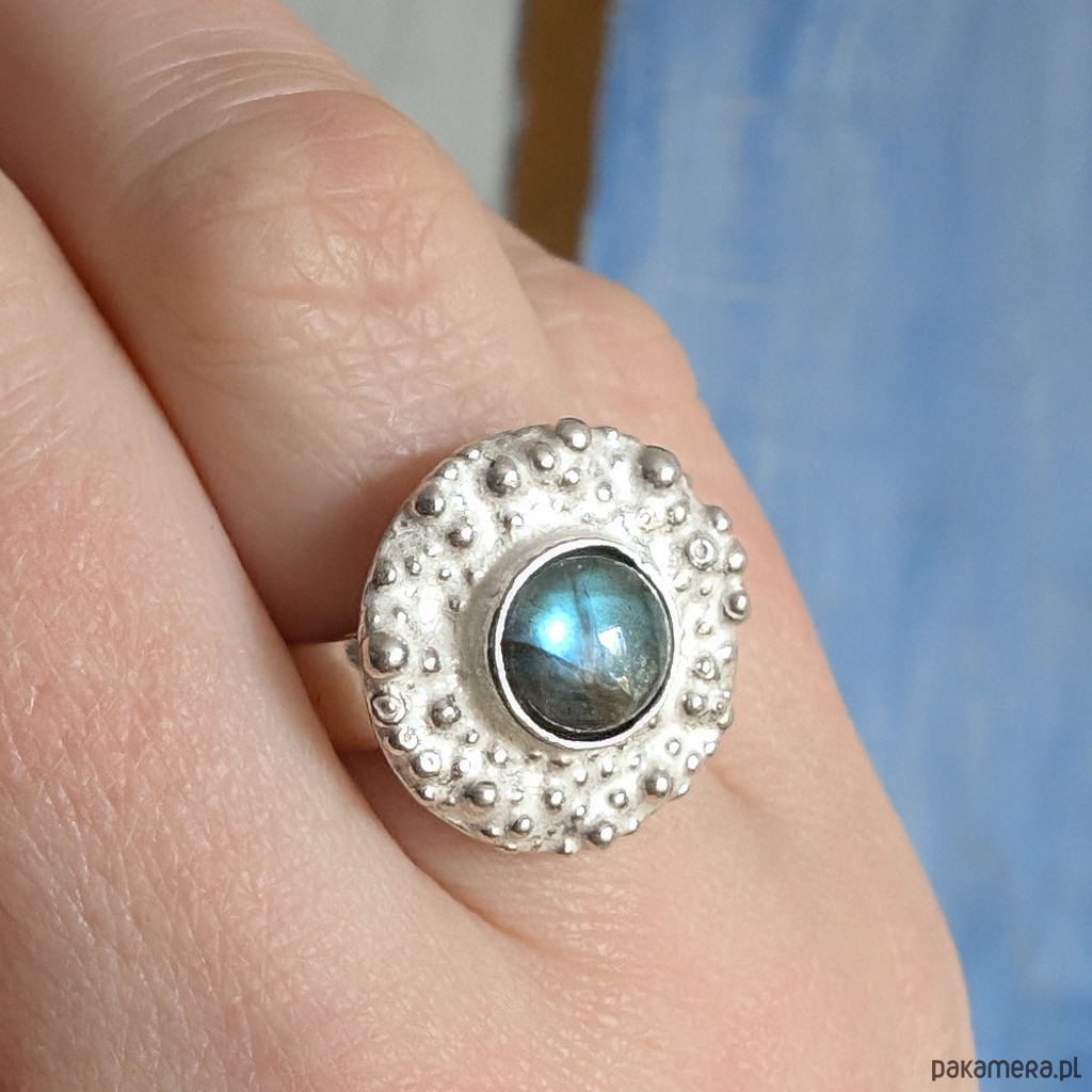 Pierścionek z labradorytem w deszczu srebra