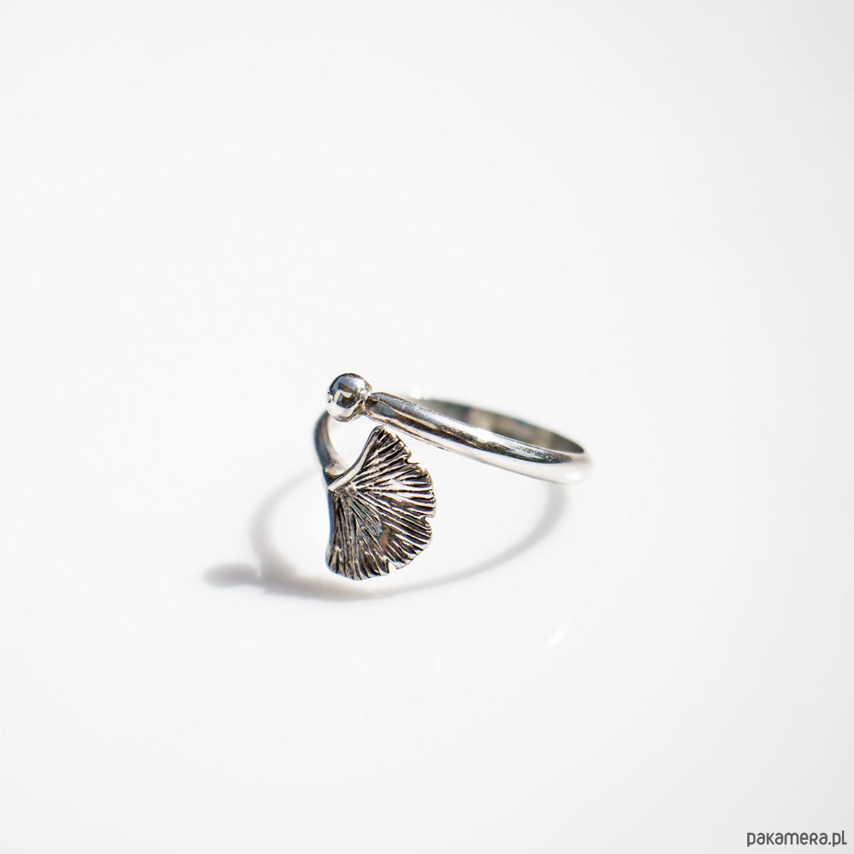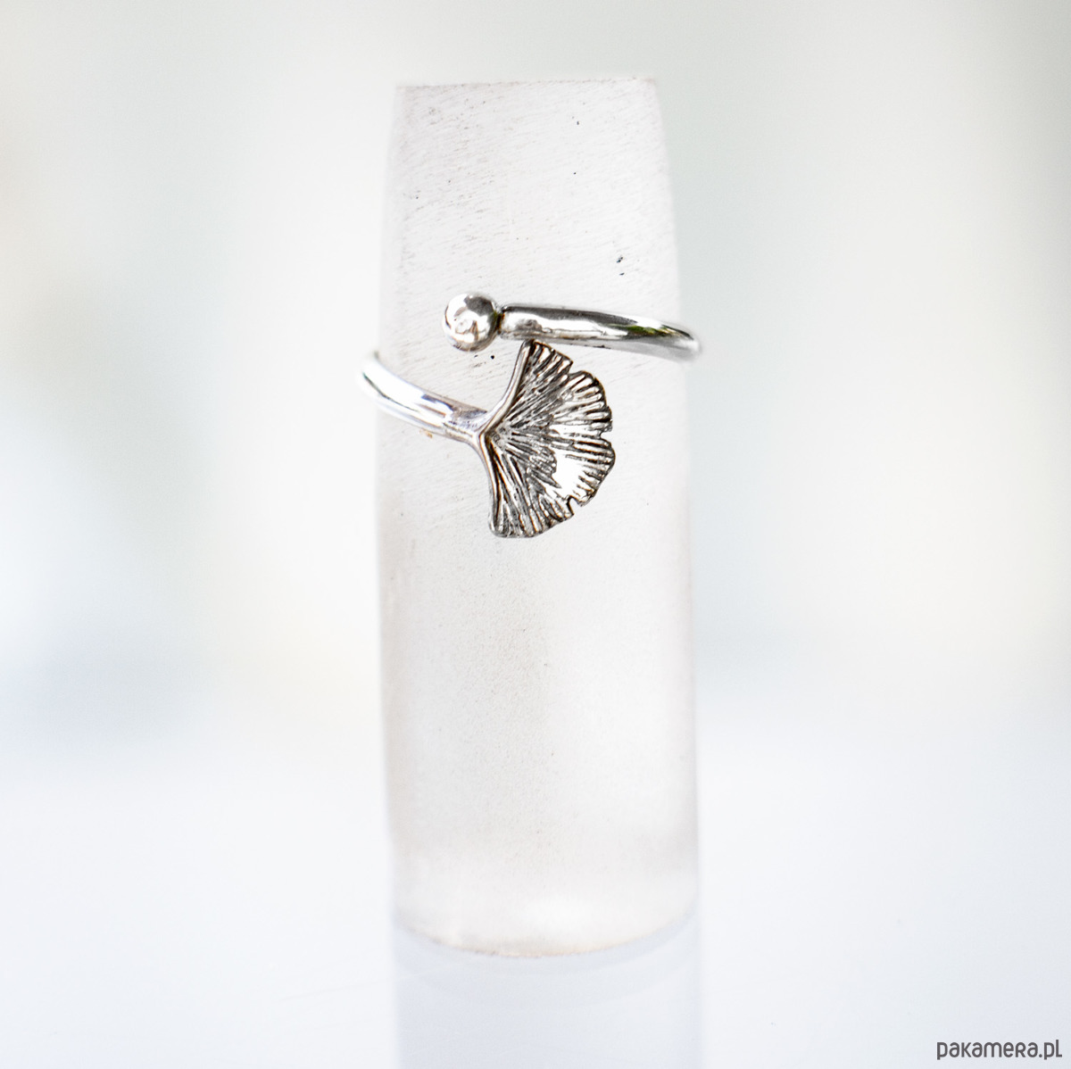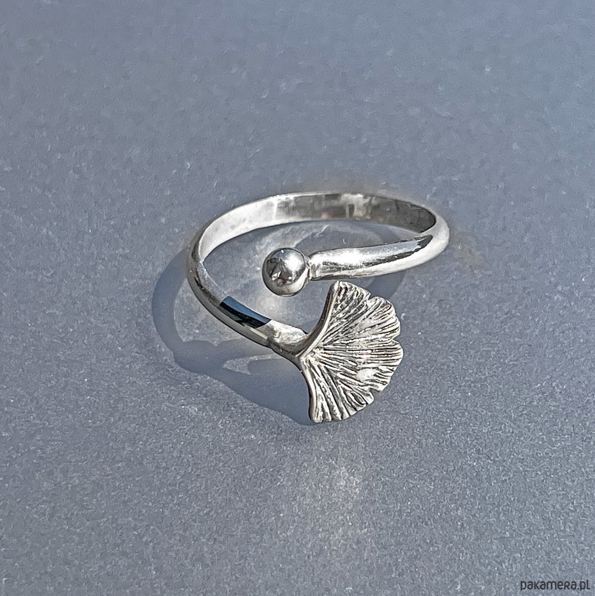 Regulowany pierścionek z liściem miłorzębu, wykonany ze srebra pr.925.