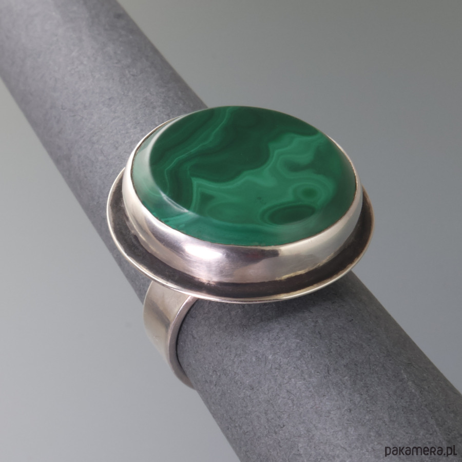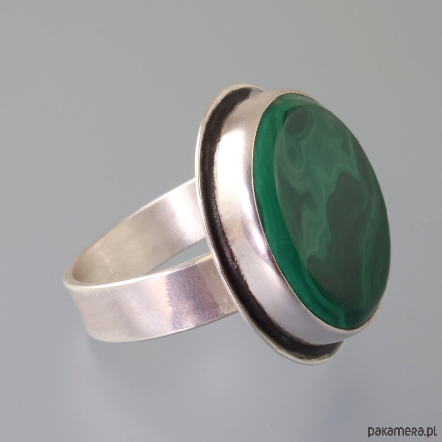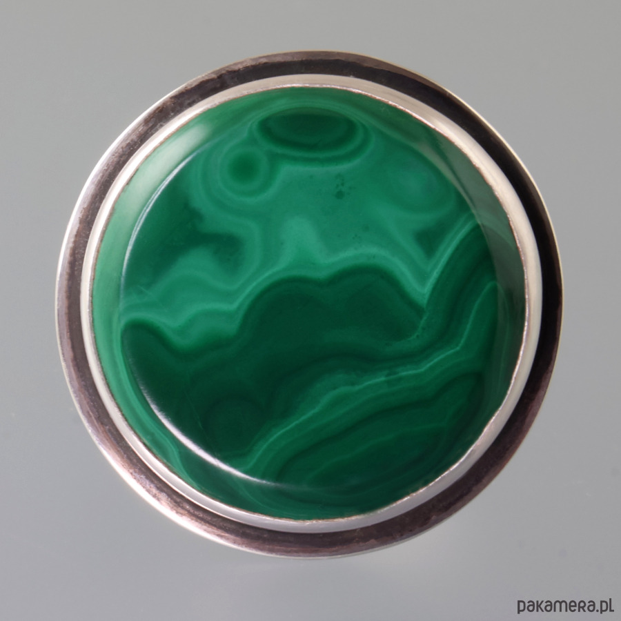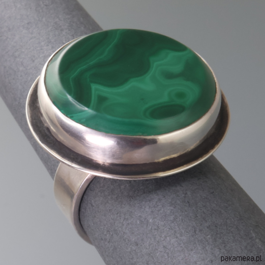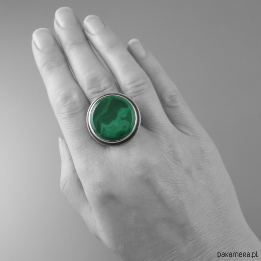 Ręcznie wykonany srebrny pierścionek z malachitem. Średnica korony pierścionka razem ze srebrnym elementem dookoła 2,8 cm, średnica malachitu 2,4 cm. Srebro próby 925 - próba wybita na spodzie. Rozmiar obrączki regulowany, regulacja pod oczkiem - niewidoczna podczas noszenia pierścionka; rozmiar wyjściowy: 20 (średnica wewnętrzna 19,0 mm). Waga pierścionka: 19,6 g.