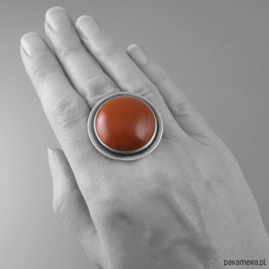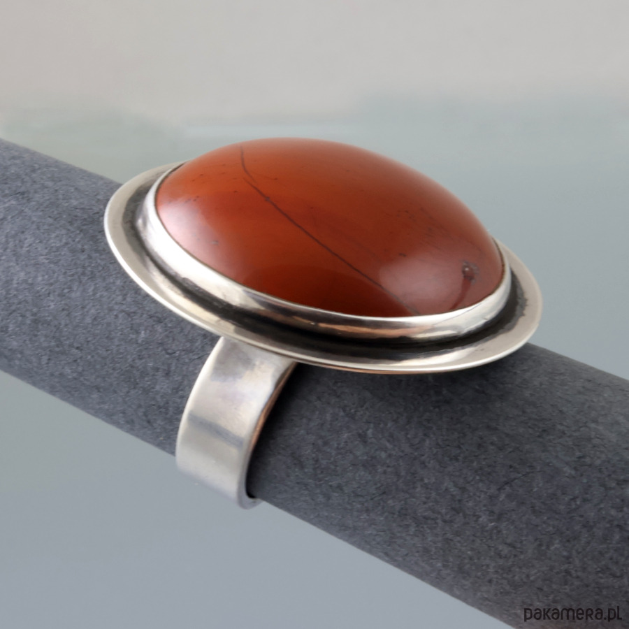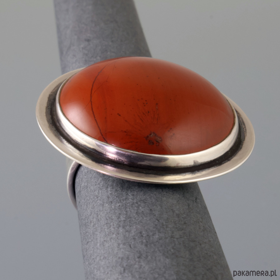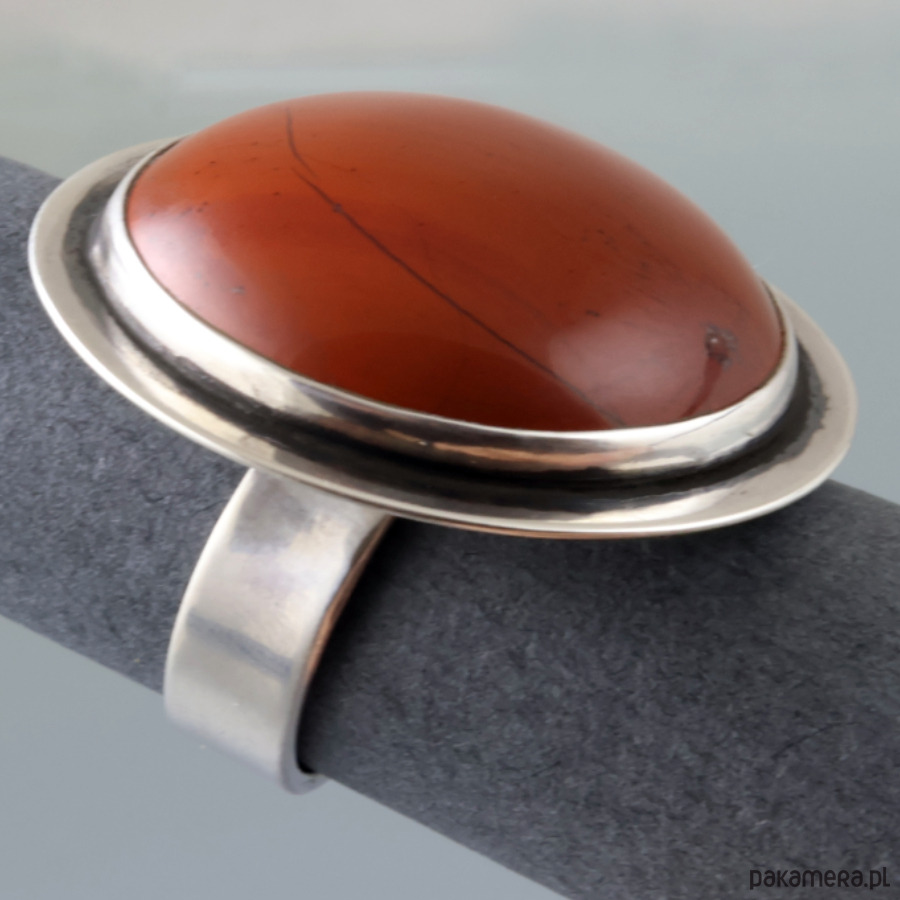 Ręcznie wykonany srebrny pierścień z jaspisem czerwonym. Srebro próby 925 - próba wybita na spodzie. Średnica korony pierścionka razem ze srebrnym elementem dookoła 3,4 cm, średnica jaspisa 2,8 cm. Srebro próby 925 - próba wybita na spodzie. Rozmiar obrączki regulowany, regulacja pod oczkiem - niewidoczna podczas noszenia pierścionka; rozmiar wyjściowy: 20 (średnica wewnętrzna 19,0 mm). Waga pierścionka: 18,6 g.