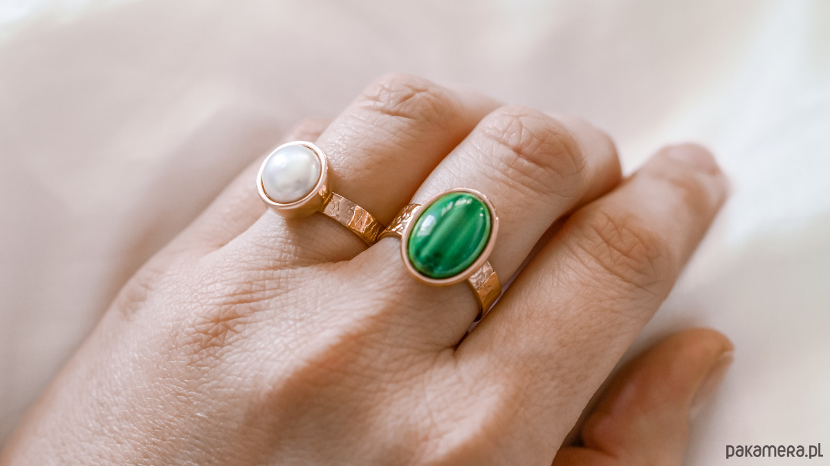 Pierścionek z naturalnym malachitem w kształcie owalnym. Głęboka zieleń to jeden z najmodniejszych kolorów tego sezonu.