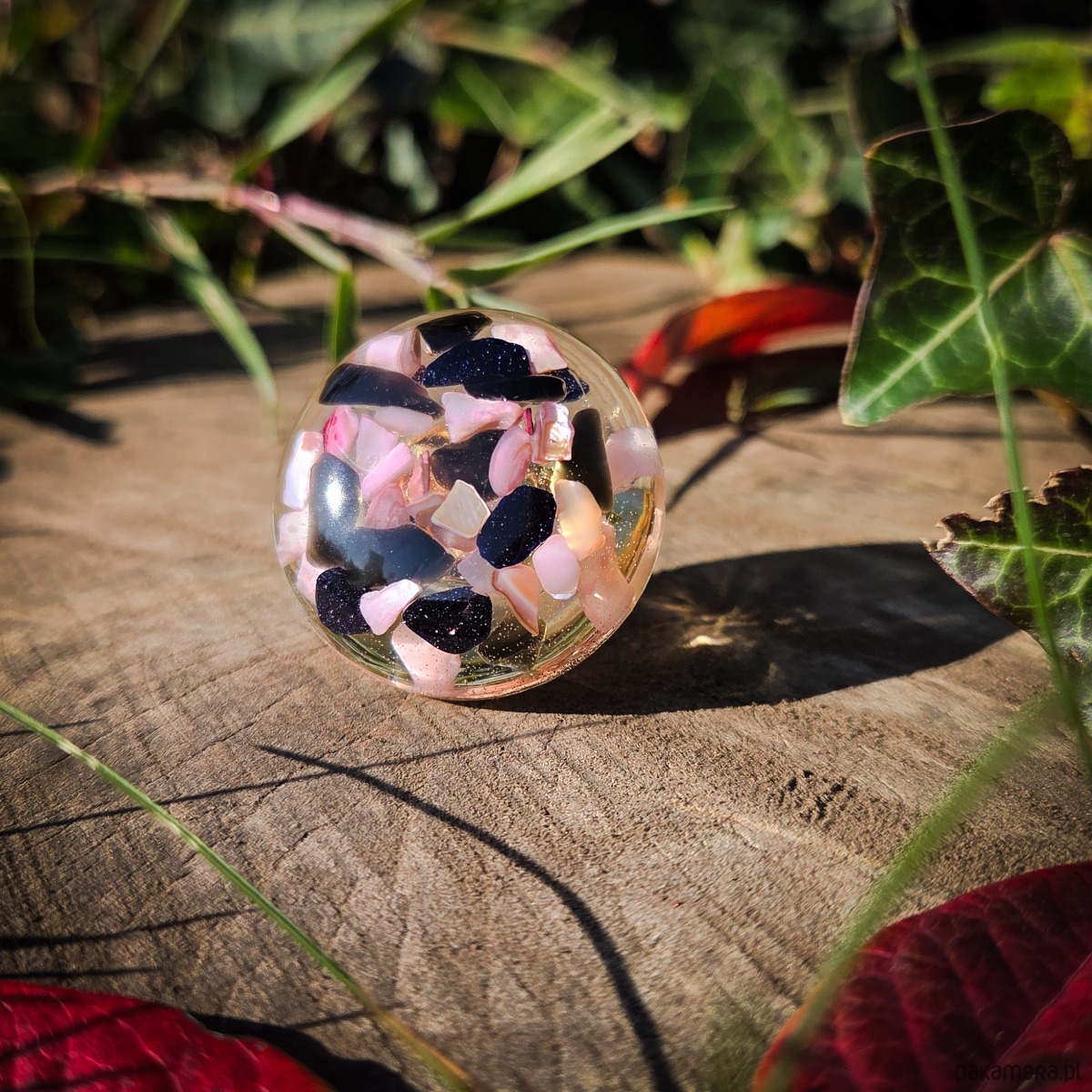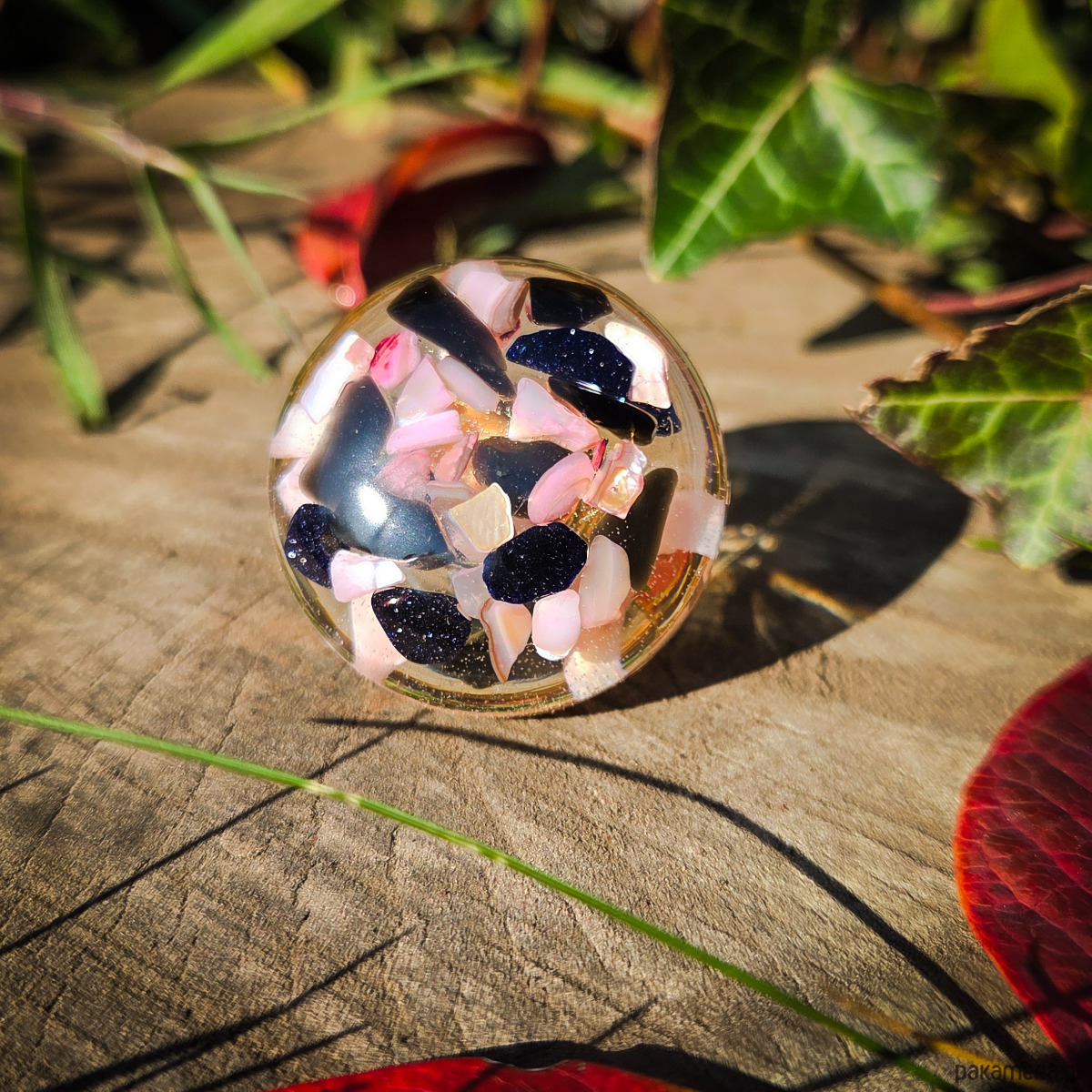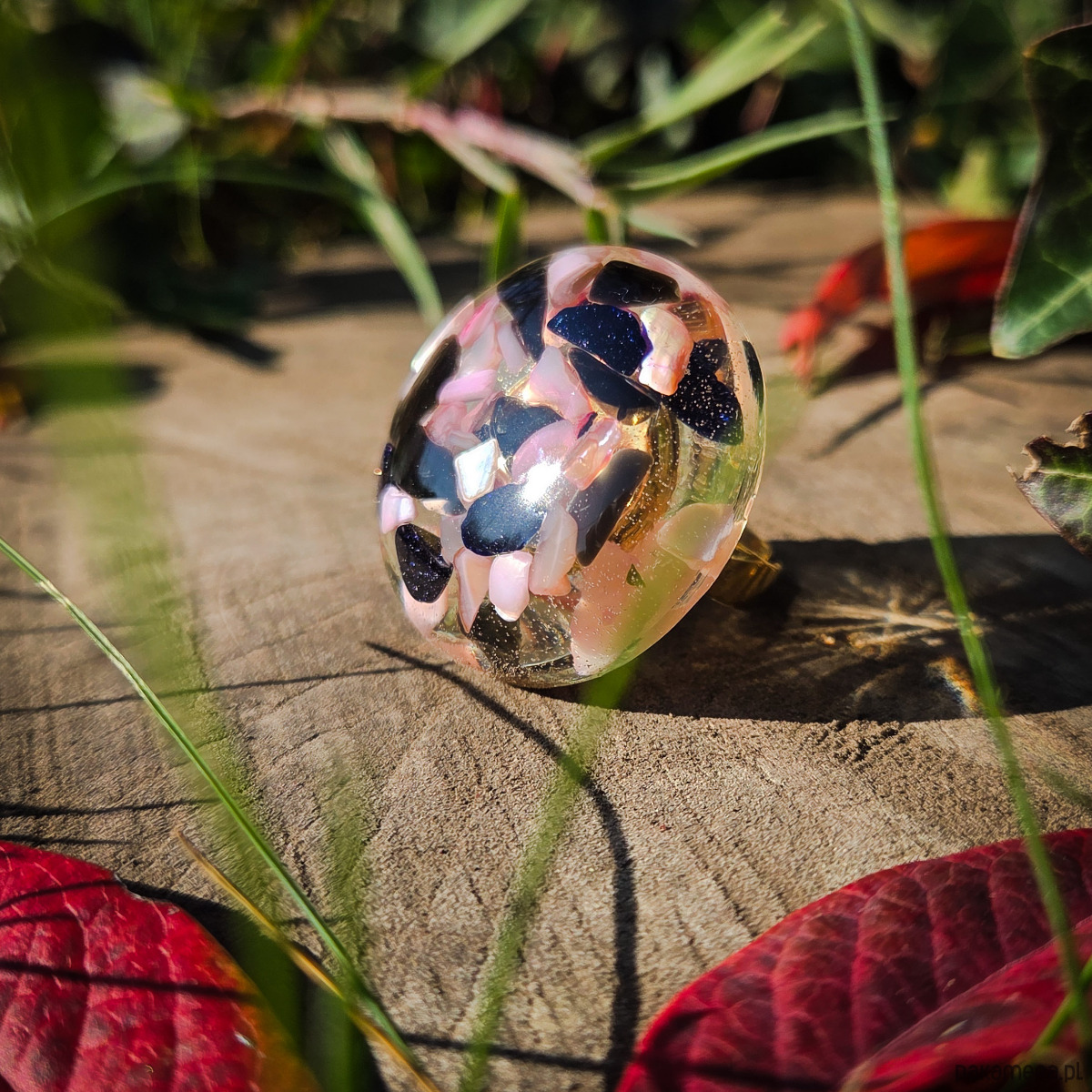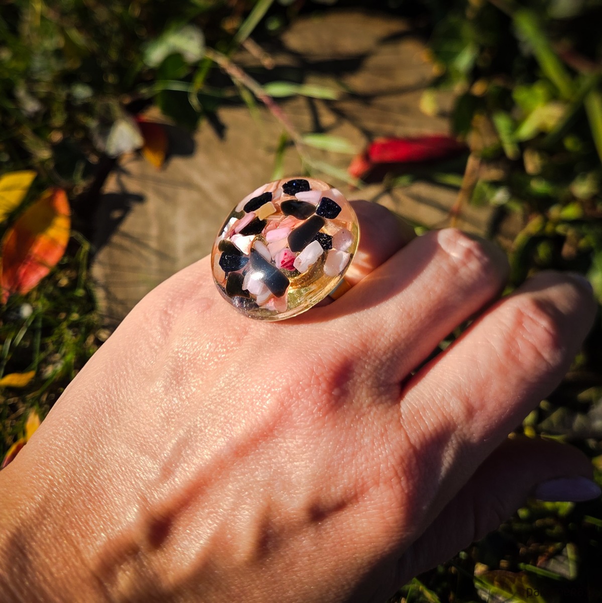 Okrągły pierścionek z zatopionymi w żywicy epoksydowej kamieniami..