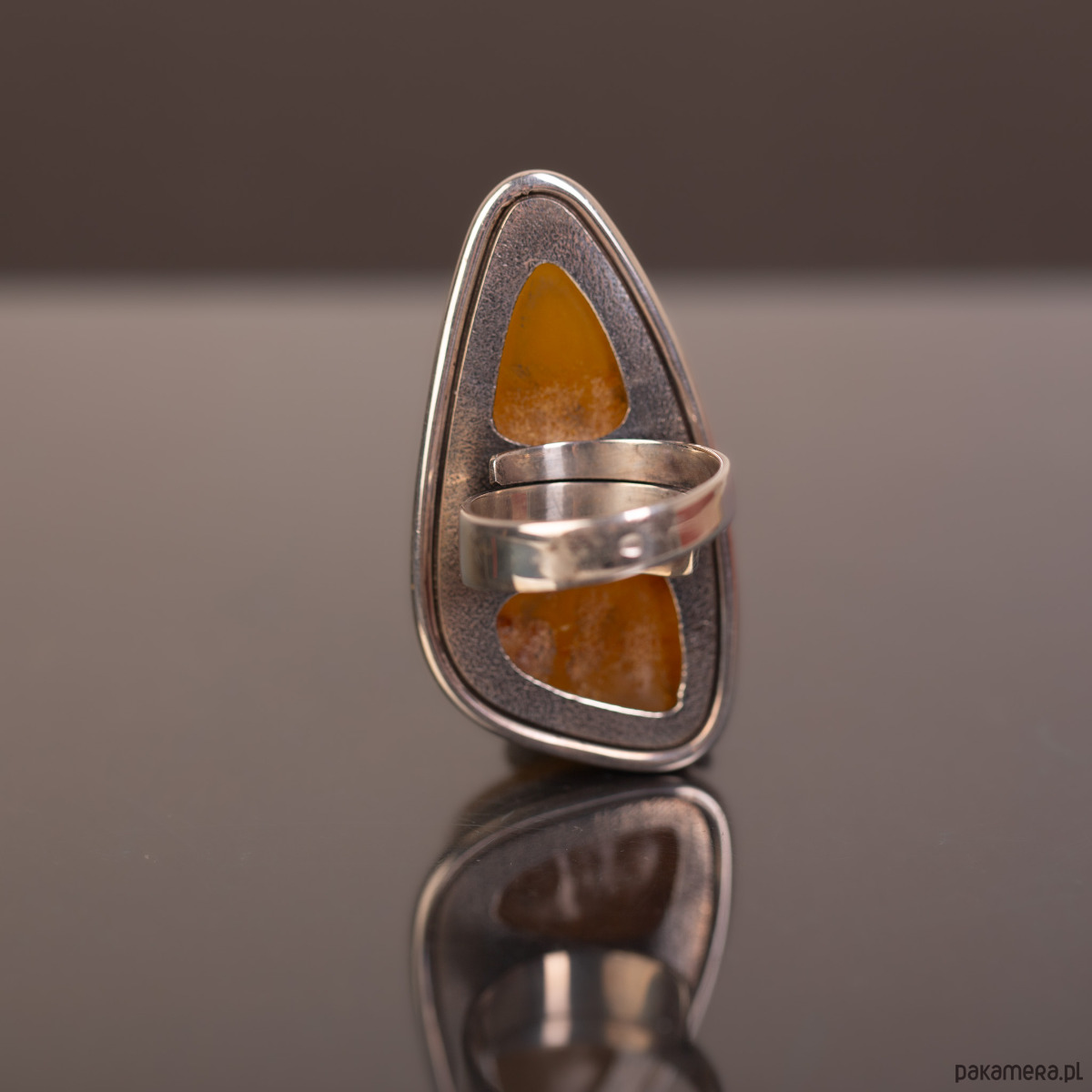 Srebro próby 925 · naturalny bursztyn bałtycki (miodowy) · waga 20,1 g · wymiary oprawy 4,5 × 2,4 cm · wysokość 1 cm · obrączka regulowana EU 9–20 · ręczna praca autorska